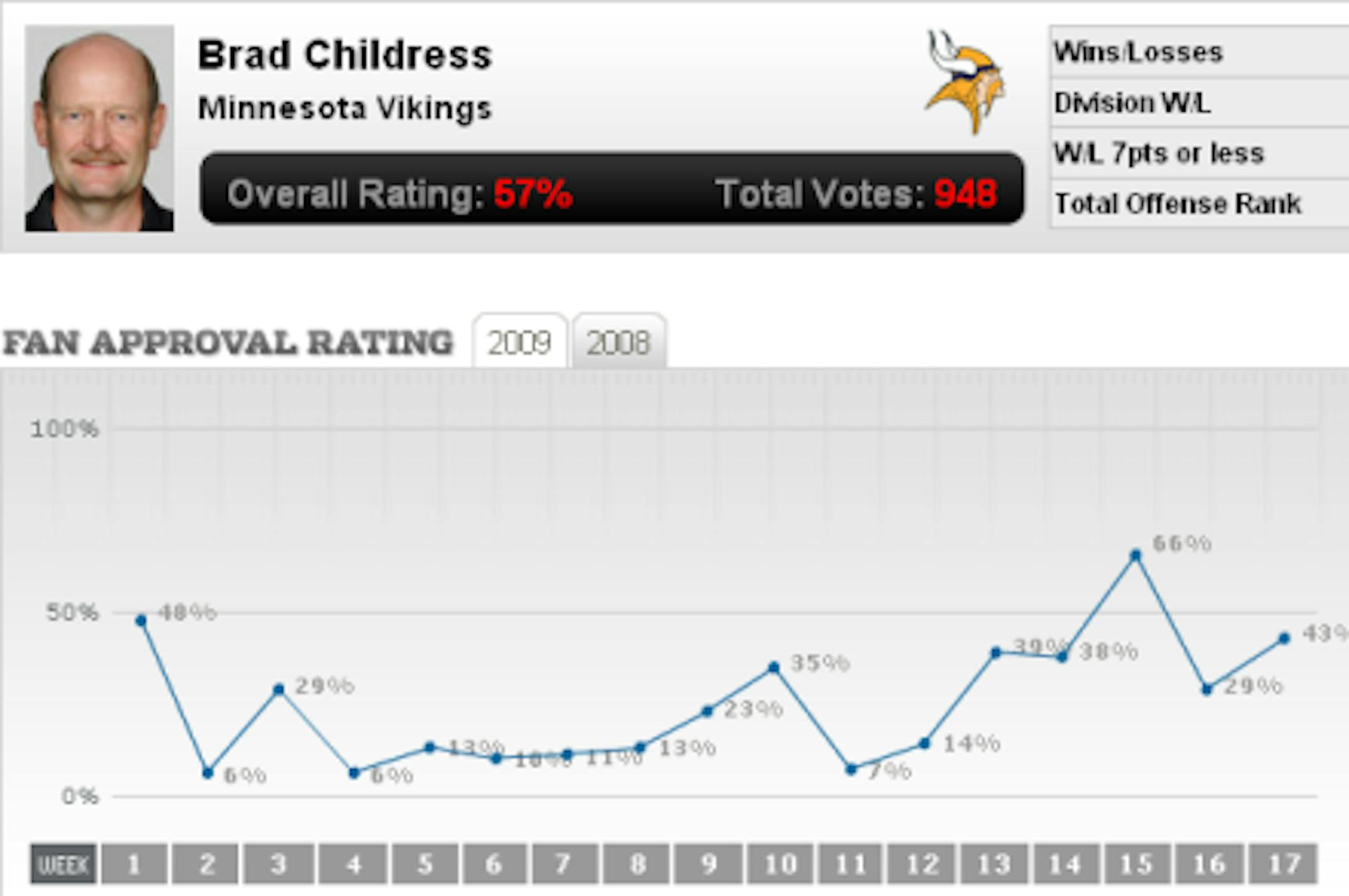 The good news for Brad Childress? His approval rating (unscientific, of course, and perhaps even less so with ESPN's KNOWN EAST COAST BIAS ... kidding) according to fans is 58 percent after one week -- and that's higher than at any point last season except week 15, when he was a big, beautiful 66 percent. He dipped into single digits on three separate occasions last year, so getting more than half the voting fans aboard the Beard Train is a step in the right direction.