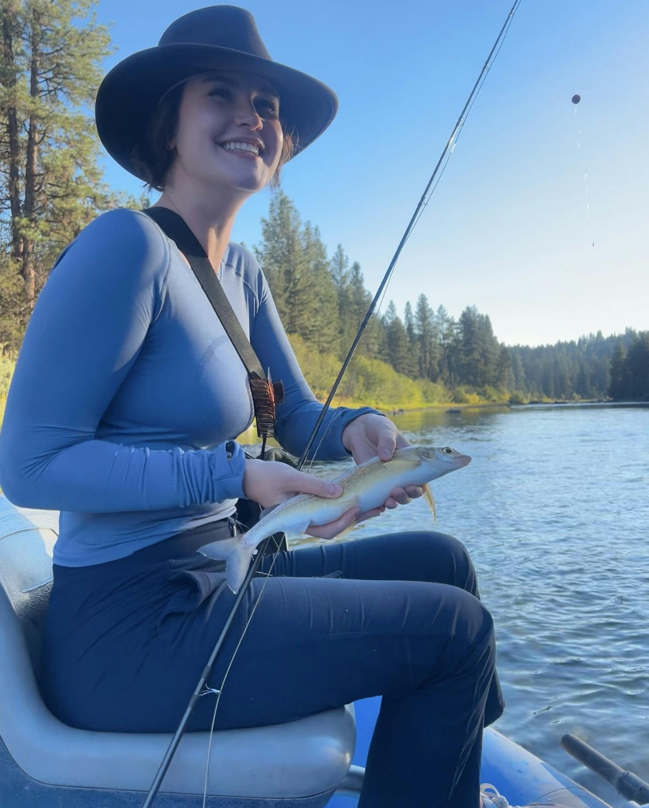 Still, Calvin was determined to see me triumph, so he repeatedly paddled back to the spot where Sky had been catching trout all afternoon. Those extra 30 minutes made all the difference. I felt a faint tug on my line and delightedly reeled in a small mountain whitefish, then a cutthroat trout, posing for the obligatory photo with my catch.