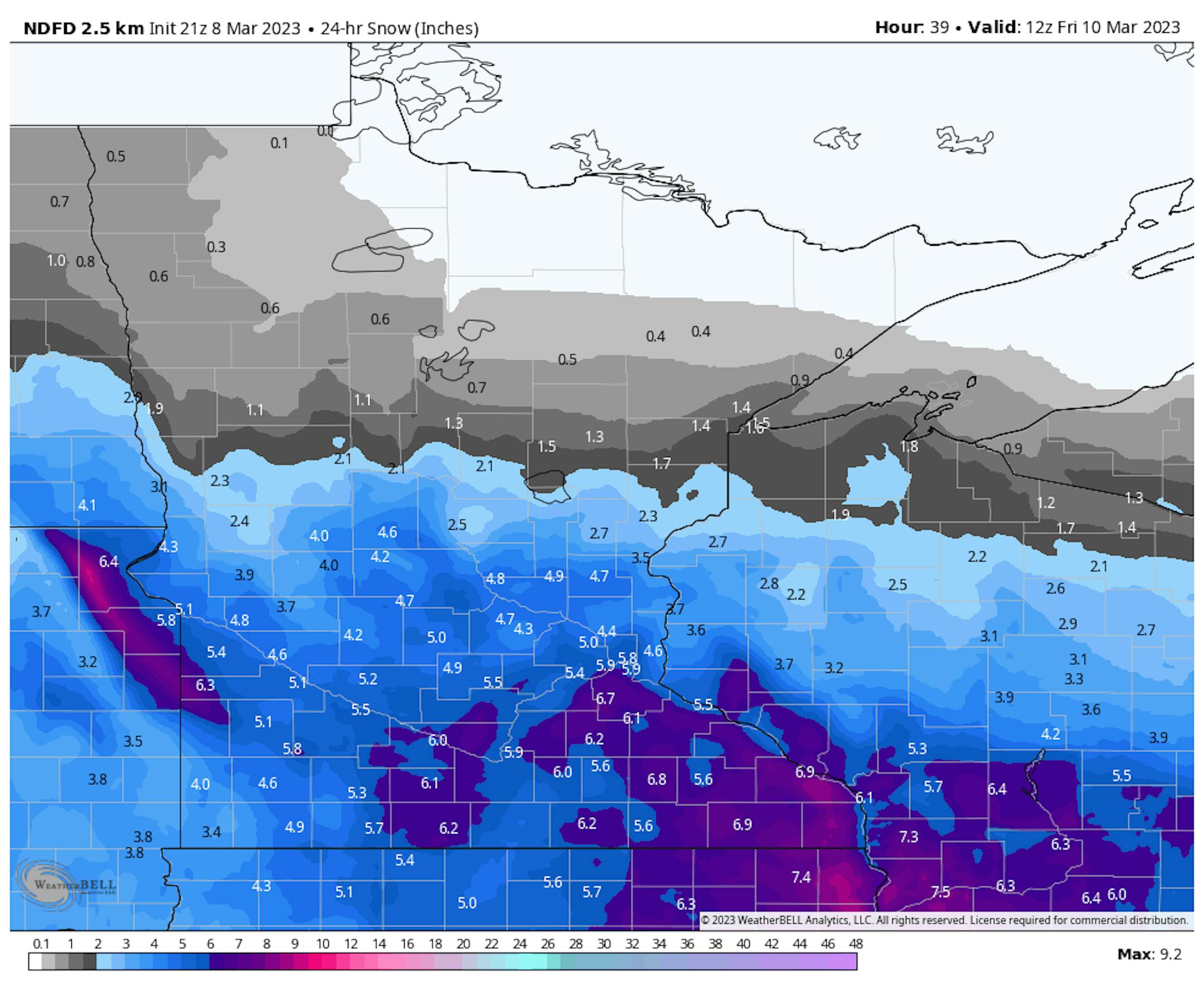 Right now the best potential of seeing 6"+ of snow will be across southern Minnesota - mainly around and south of I-90 (in areas like Rochester and La Crosse) - as well as out in parts of western Minnesota. Elsewhere - stretching north up to about the Little Falls and Alexandria areas, 2-6" of snow can be expected, including in the metro.