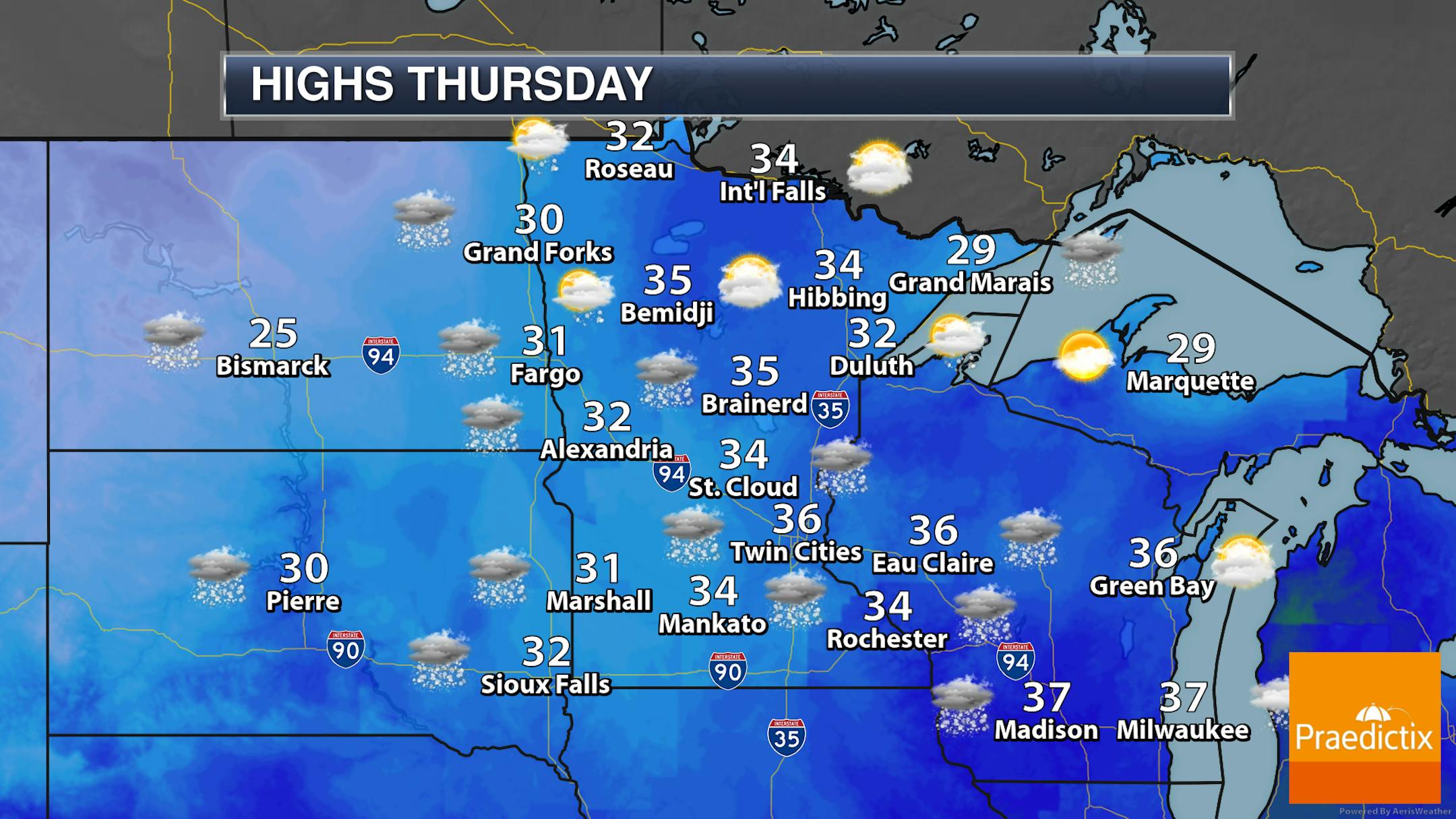 With snow chances - especially across western, central and southern Minnesota - on Thursday, highs will climb into the 30s across much of the state.