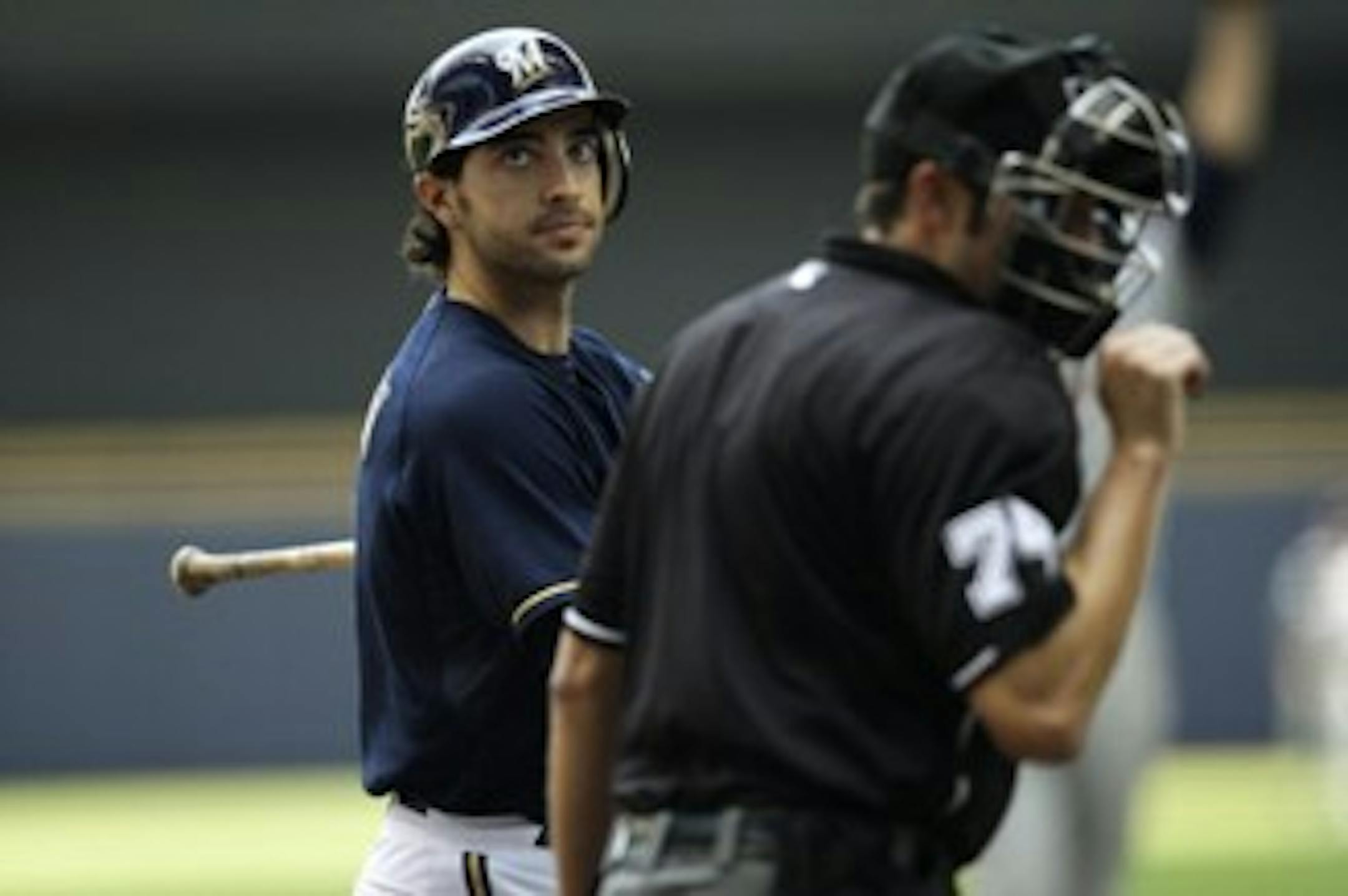 We attended Sunday's Twins-Brewers game and spent a good deal of time with a couple of Brewers fans. Ryan Braun, who was lifted late in Saturday's game, was not in the lineup for the Sunday matinee. The Brewers fans did not seem overly concerned, assuming he would be back shortly from what seemed like a mild calf injury. What we're looking at now, though, is an example of how missing one game suddenly can become a handful -- or more. Please enjoy what is a rather strange set of circumstances in our eyes. From the Milwaukee Journal-Sentinel: