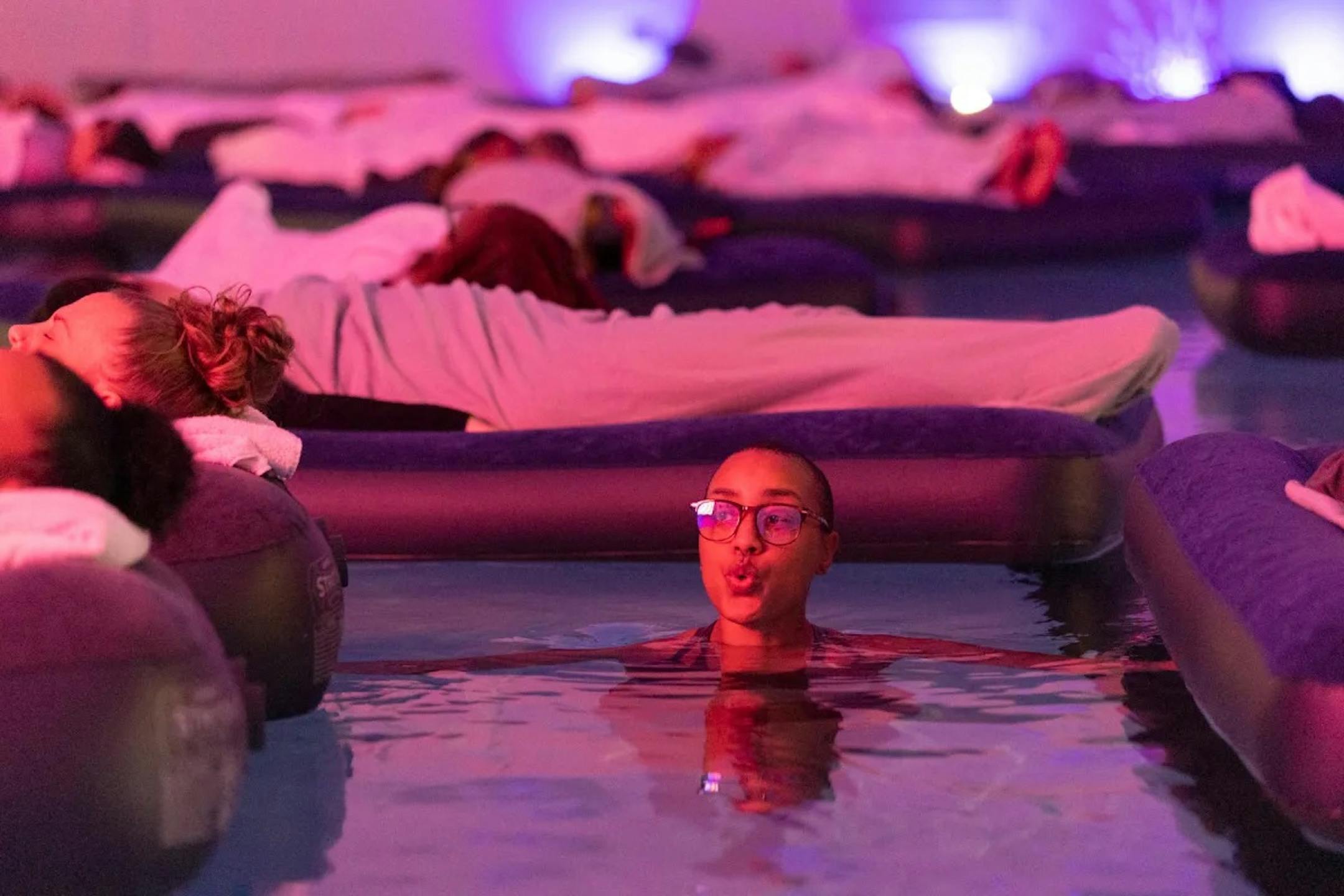 But one Sunday evening a month, the big lights go off and the pool area is bathed in soft hues of pink and purple. The mood is set for a floating sound bath.