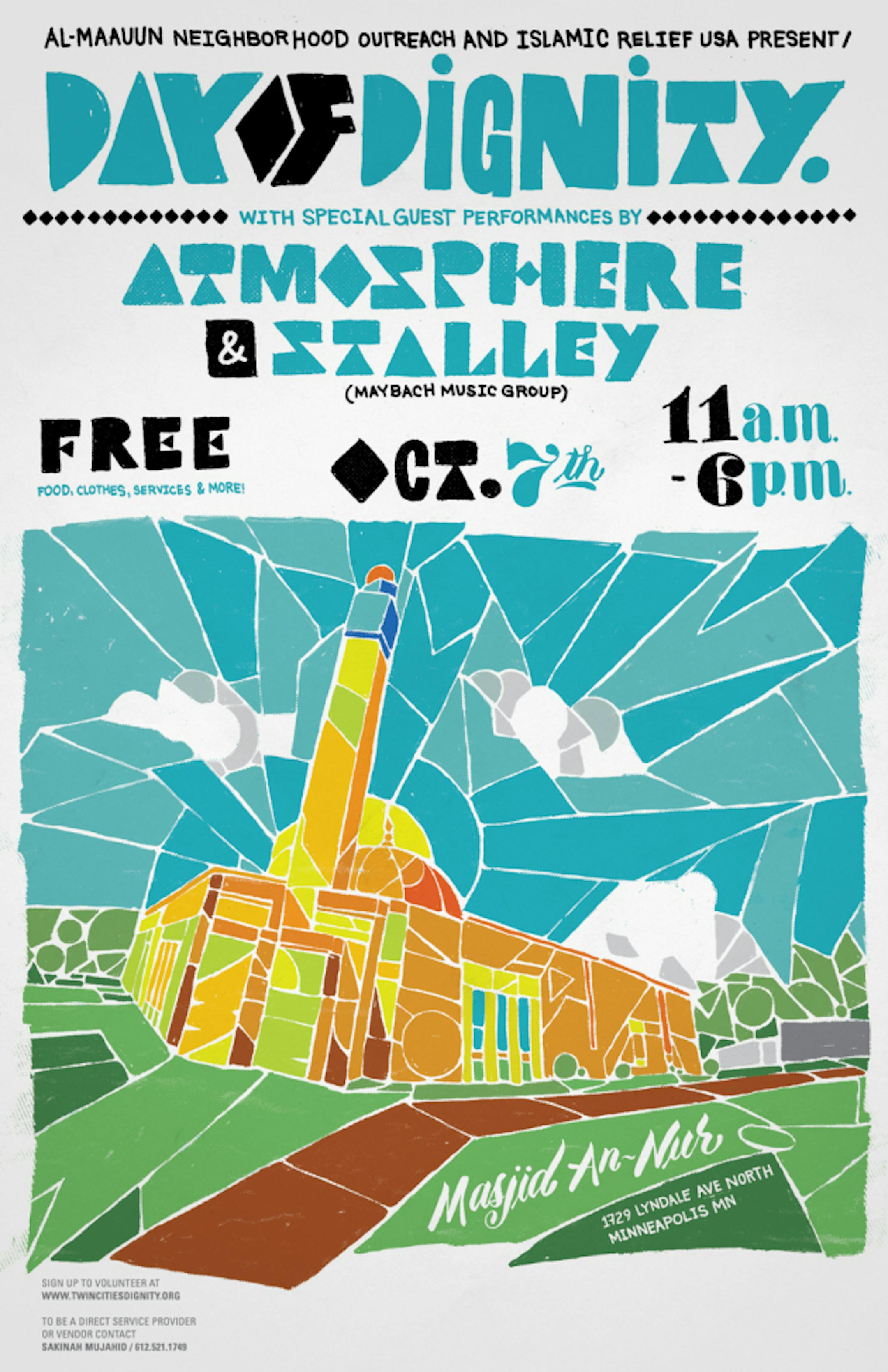After years of having Brother Ali follow their lead, Twin Cities hip-hop kingpins Atmosphere are taking a page out of Ali's book: They will headline the second annual Day of Dignity block party in north Minneapolis on Oct. 7. In addition to the free music, the event will once again feature free food, clothing and health-care services and be held outside Masjid An-Nur, the Muslim mosque that counts Ali and U.S. Rep. Keith Ellison among its worshipers.