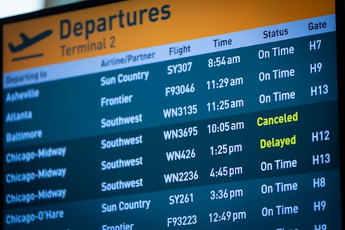Cancellations at Minneapolis-St. Paul International Airport increased Monday morning to about 5% of scheduled flights.