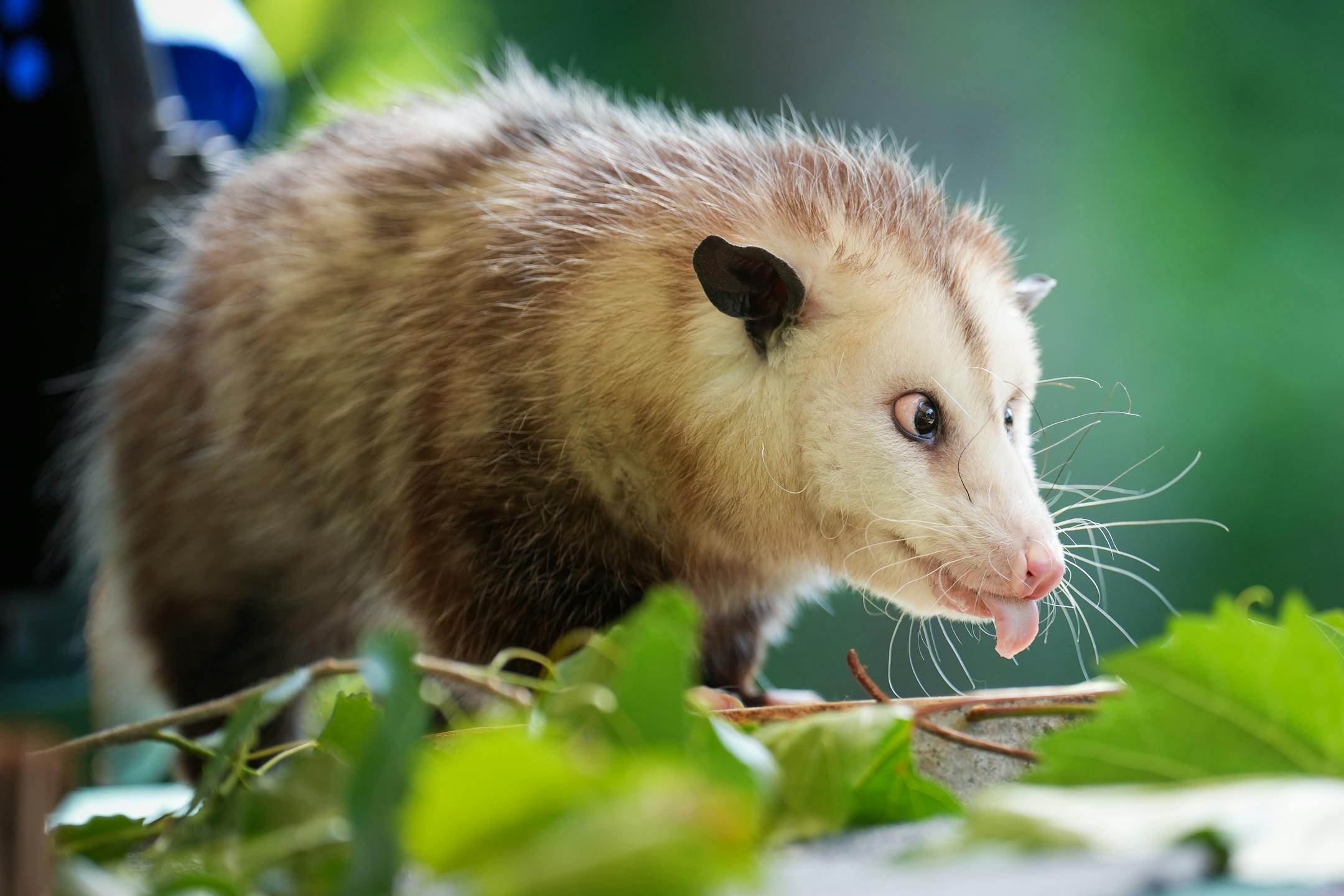 Opossums tend to be solitary and transient, always on the move at night for food. They will eat grasses, leaves, worms, slugs, snails, insects (including ticks), eggs, young birds, overripe fruits, grain, garbage and dead animals. Afterward, they meticulously wash themselves like cats with their paws. They aren’t picky and can even eat venomous snakes.