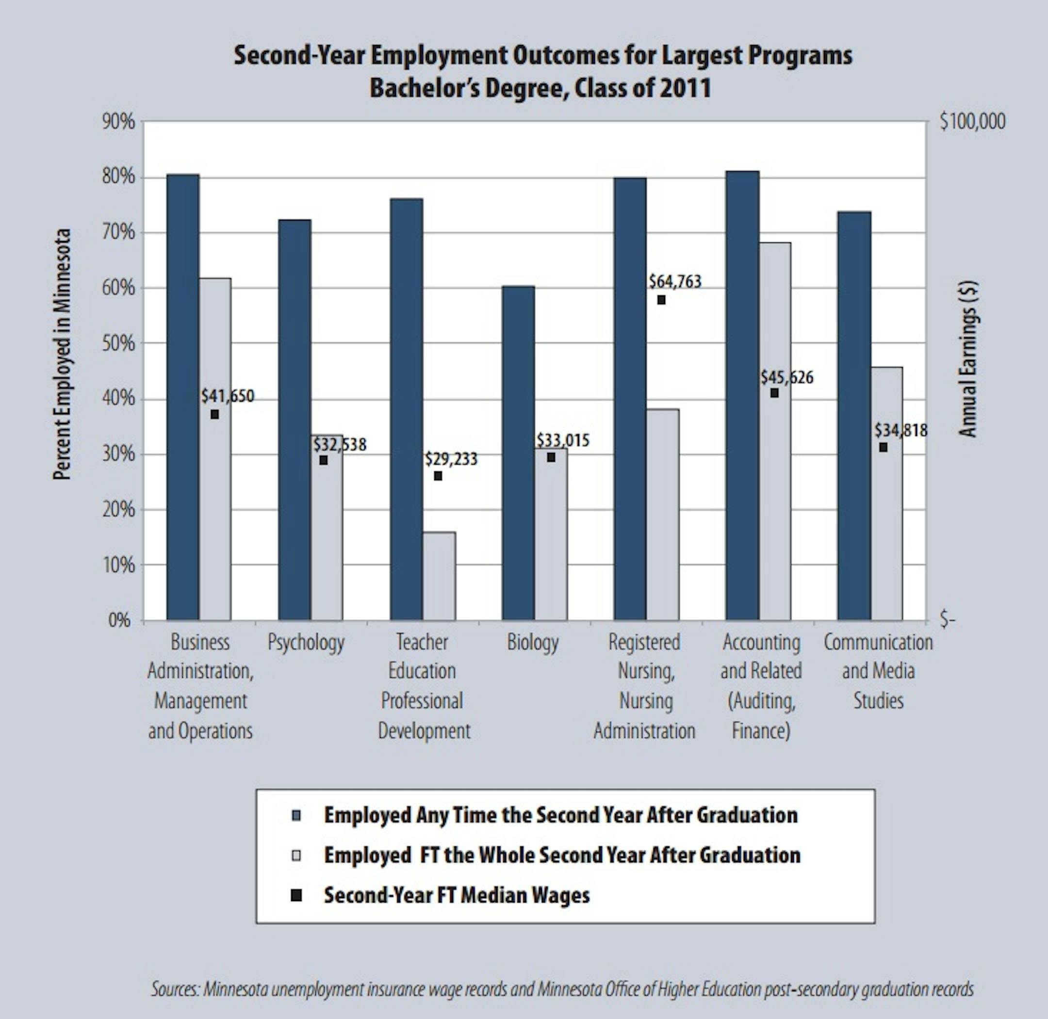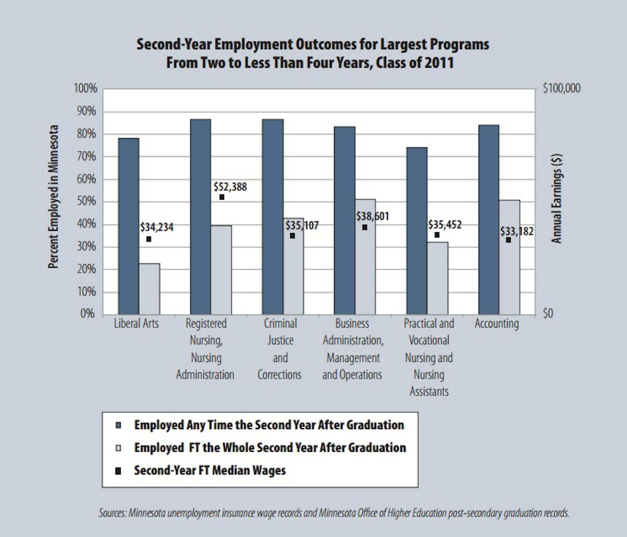 Three of five Minnesotans with a bachelor's degree don't have a full-time job in their second year after graduation. Neither do two out of three Minnesotans with a new associate's degree.