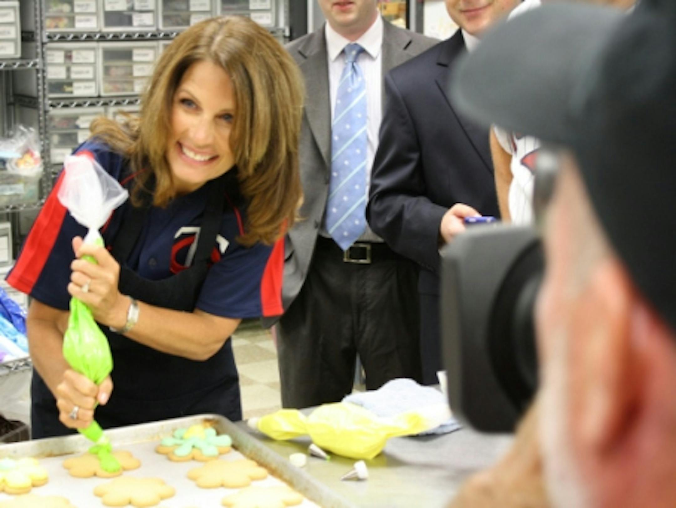 Aside from a brief exchange with reporters aboard the bus, the first leg of Bachmann's tour of the district stuck to a pretty tight script. Reporters were briefly shuffled in to watch her make cookies in Woodbury and speak with manufacturing plant workers in Hugo.
