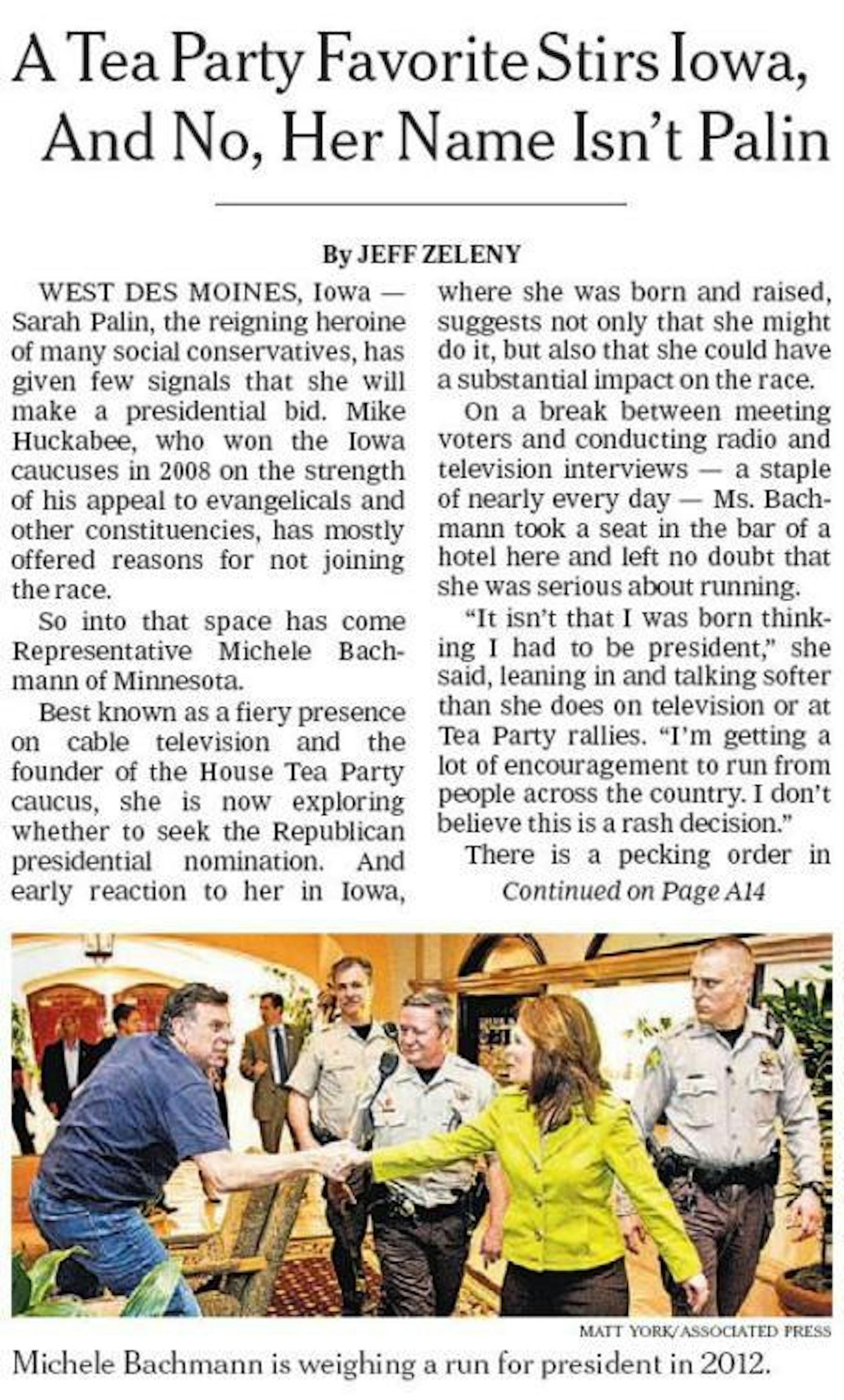 Pawlenty's presidential campaign got the front page treatment in the New York Times last month. Now it's Bachmann's turn.
