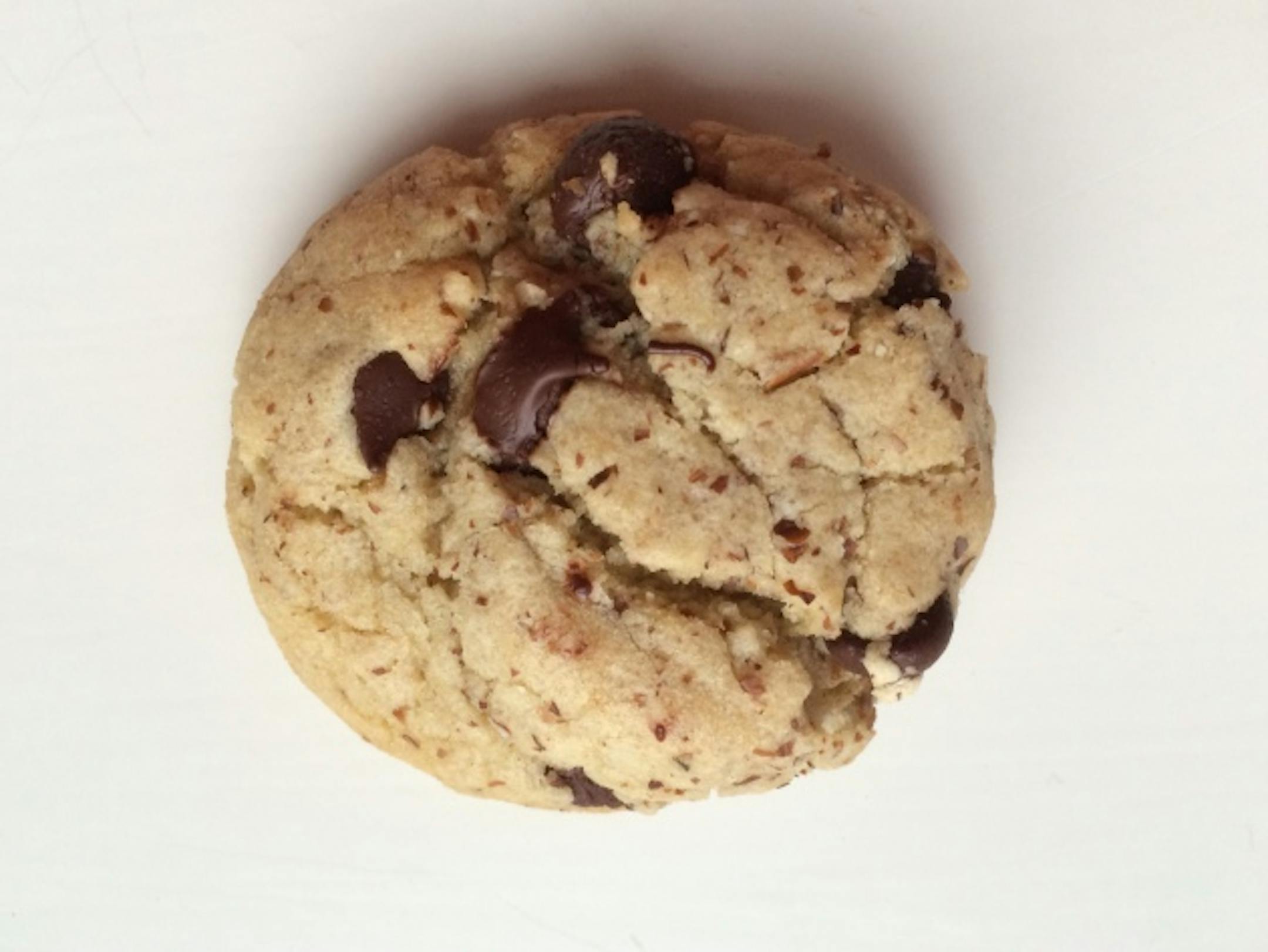 As for the cookies, I liked, but didn't tumble head-over-heels. They've got the thick shape and chewy texture that I generally aim for (and rarely achieve) in a chocolate chip cookie, and I love the look of the flecks of almond that dot the the dough (it helped that the almond flour I was using was technically almond meal, which uses unblanched almonds, resulting in that verigated brown-and-gold look; almond flour, which is made with blanched almonds, is a pale, monochromatic gold). The chocolate-dough ratio is good, too, a close-to 50/50 match.