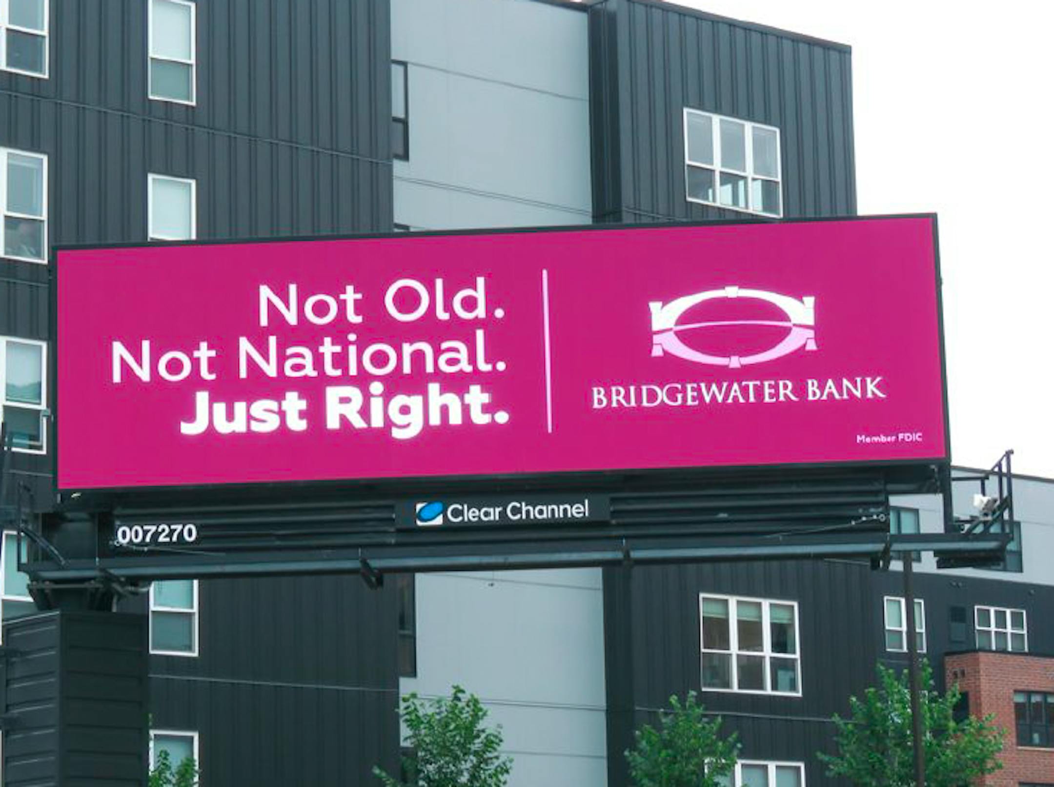 St. Louis Park-based Bridgewater Bank is reaching out to former Bremer clients directly. Earlier this year, its team greenlit a series of billboards teasing the Old National brand, including one that reads: “Not Old. Not National. Just Right.”