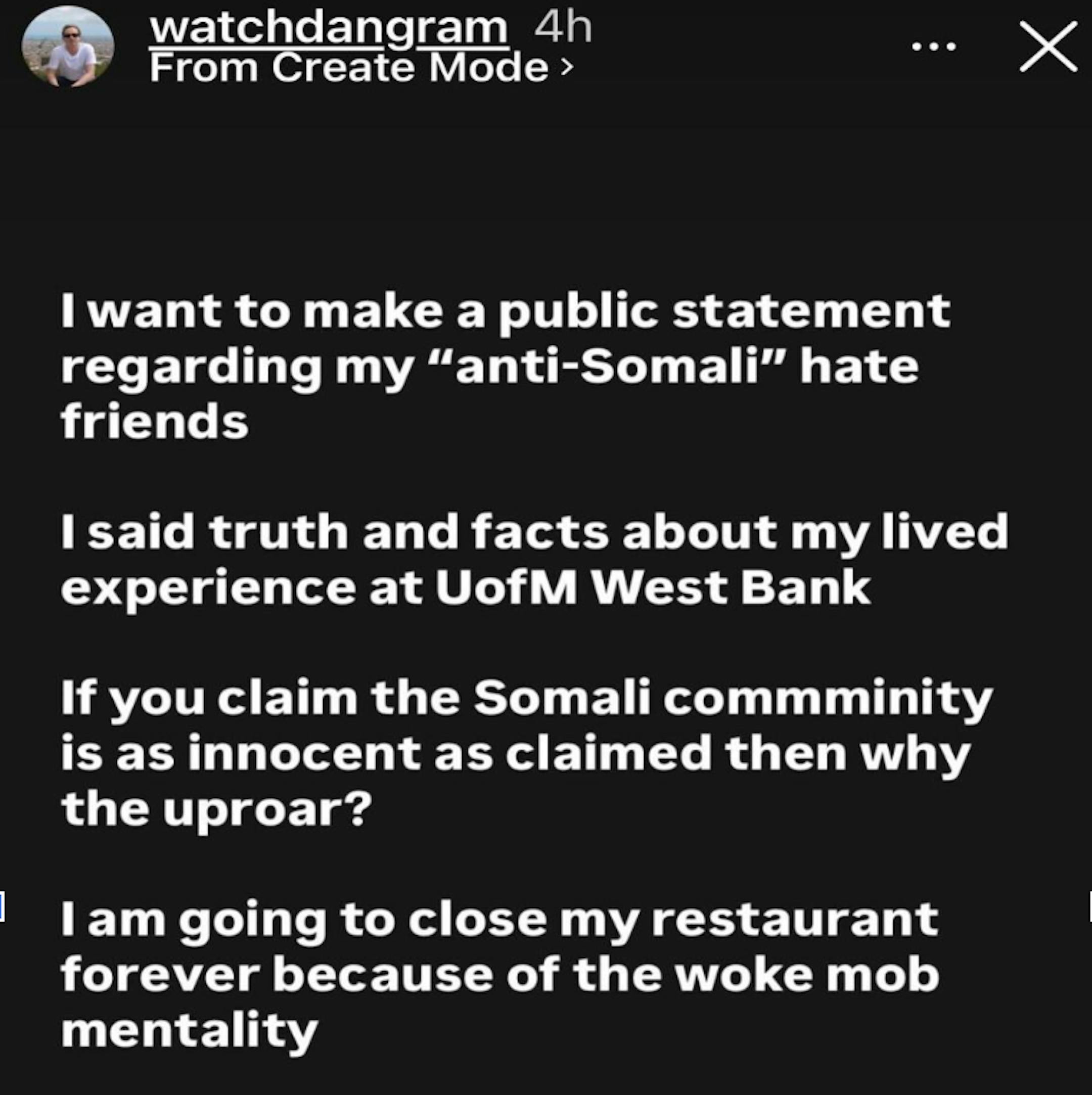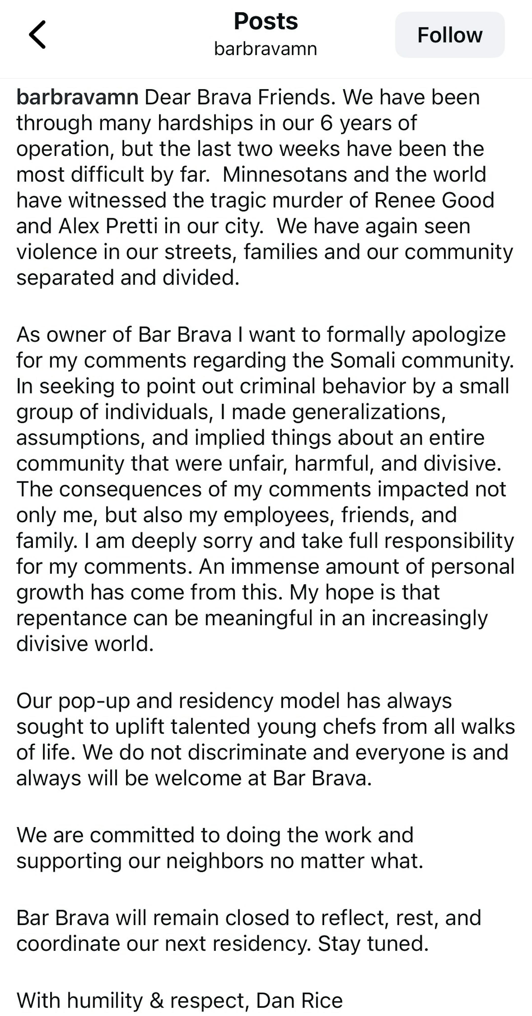 On Friday, Bar Brava owner Dan Rice said he regrets not apologizing after the initial controversial post on his personal account in November. In it, he shared a message from President Donald Trump about federal agents coming into the state. Rice added the comment “today is the beginning of the end for Somali gang violence.”