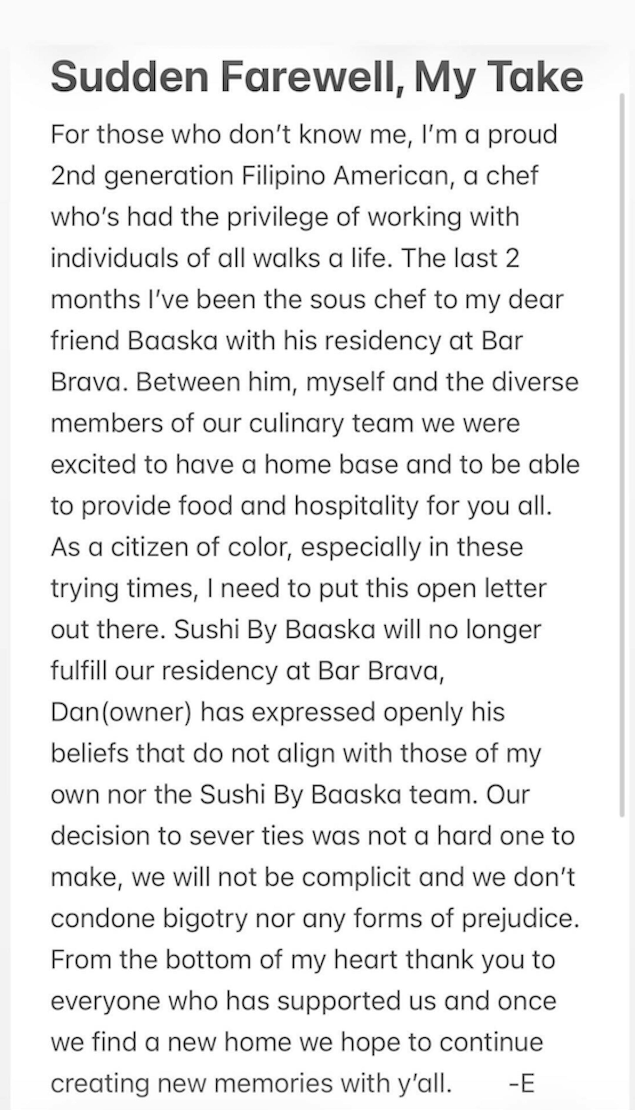 Sushi by Baaska sous chef Ernest Robledo elaborated on Instagram, saying in part “Dan (owner) has expressed openly his beliefs that do not align with those of my own or the Sushi By Baaska team.”