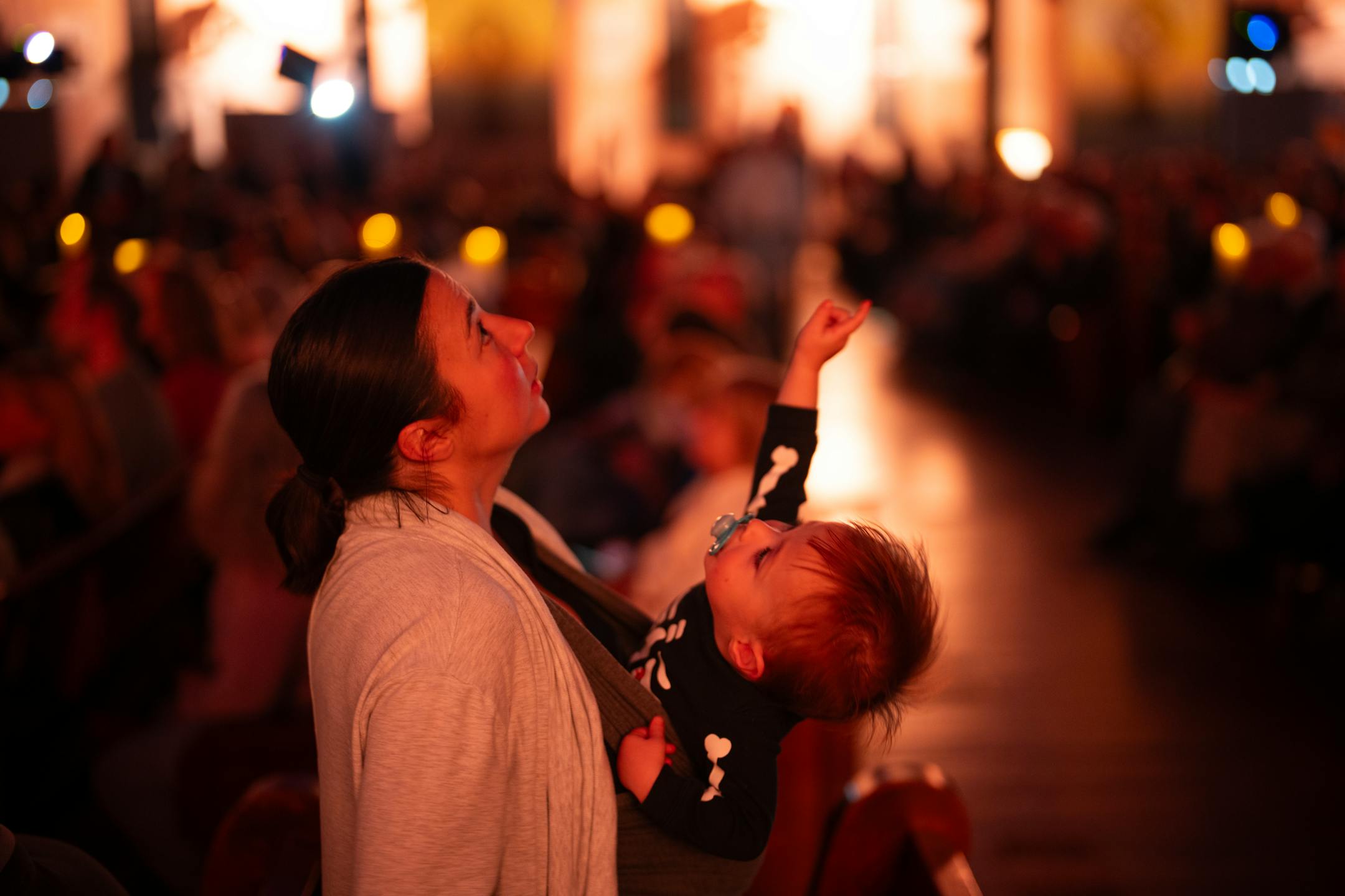 The show is half futuristic architecture tour and half history lecture. Some performances include a live orchestra and choir, featuring the basilica’s own members. Narrators — cycling between the personification of the basilica, its architect and a small girl — describe the church’s construction and design: how the ceiling is made from plaster and not stone, how its cross can be seen for miles, how it’s designed to inspire hope.