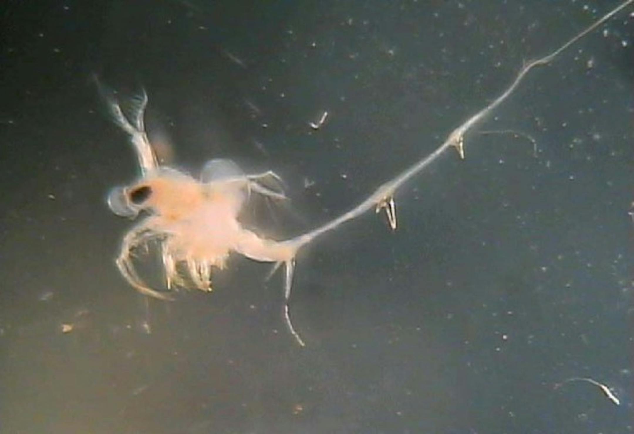 Spiny waterflea is a small planktonic crustacean that disrupts the food web and competes with small fish as it forages on microscopic animal plankton such as daphnia. Because of its long tail spike, the spiny waterflea is not eaten by small fish.