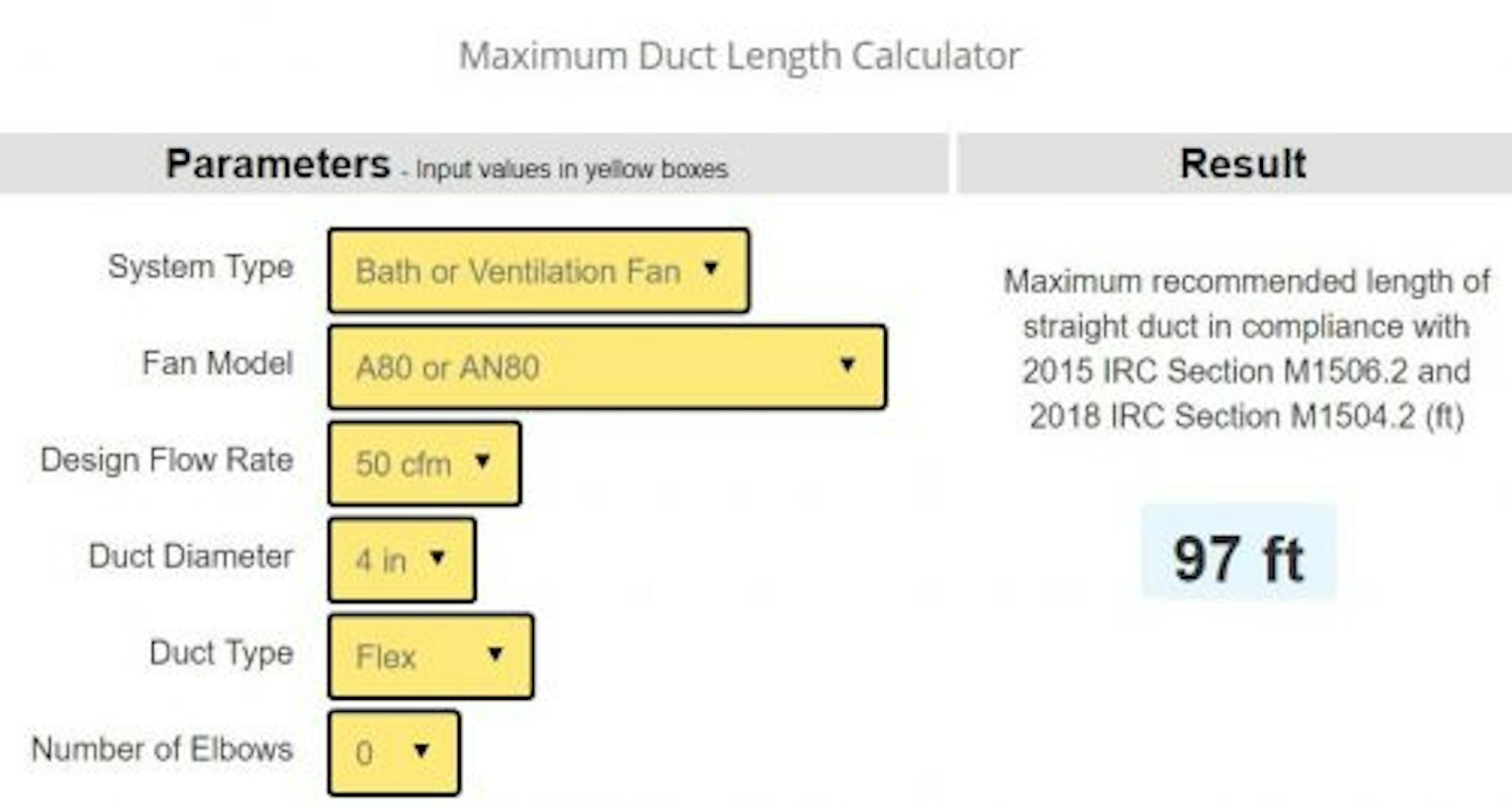 Just plug in the fan you're using, what your desired flow rate is, and what type of duct you'll use. They'll tell you how long of a run you can have. The minimum required flow rate is 50 CFMs.