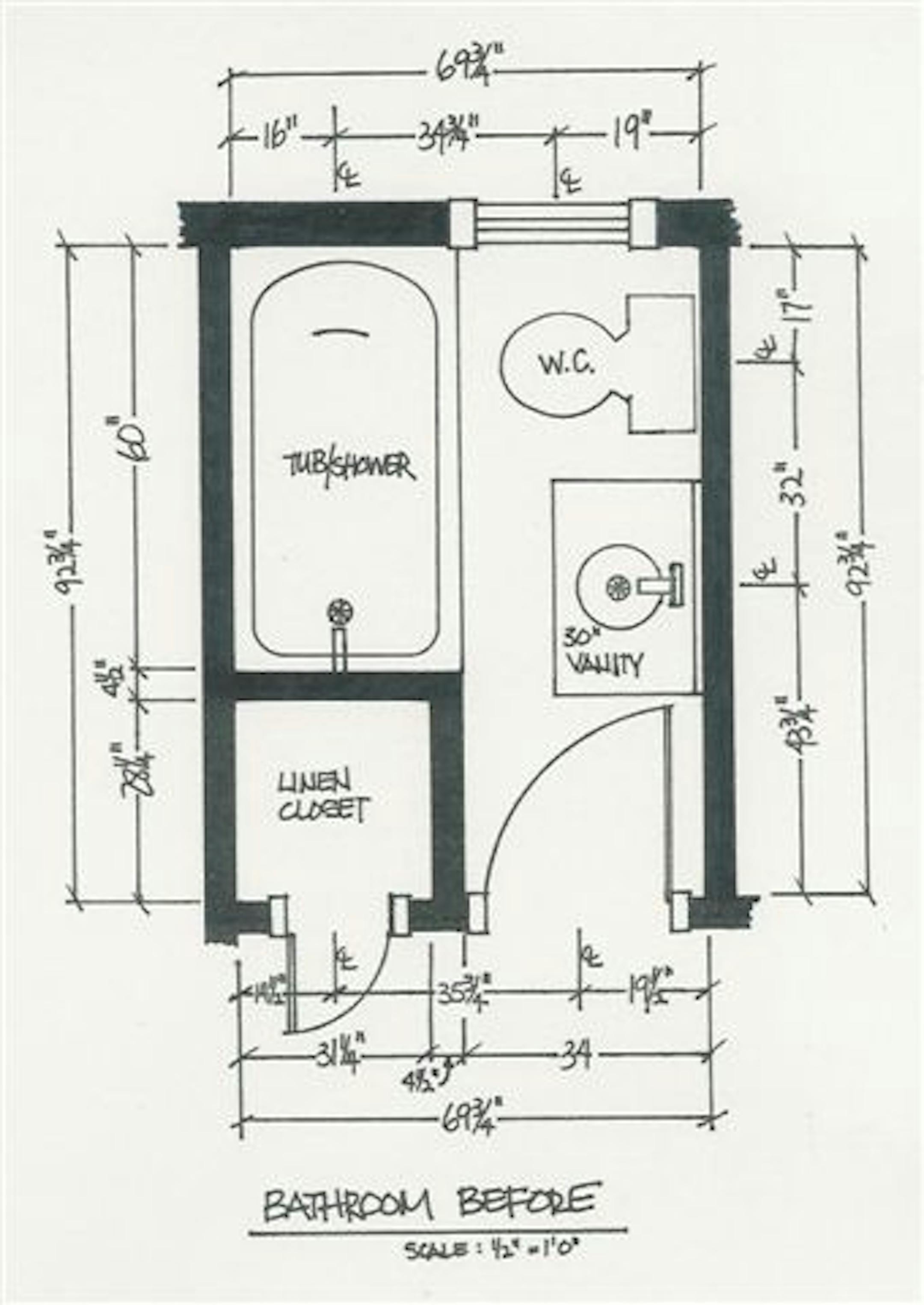 A tough one, right? This called for a reconfiguration. He said the clients wanted more towel storage space and storage for personal grooming items. He took the space from a hall closet, closing off that door and incorporating the extra square footage in the room. The vanity was relocated to the former closet corner.