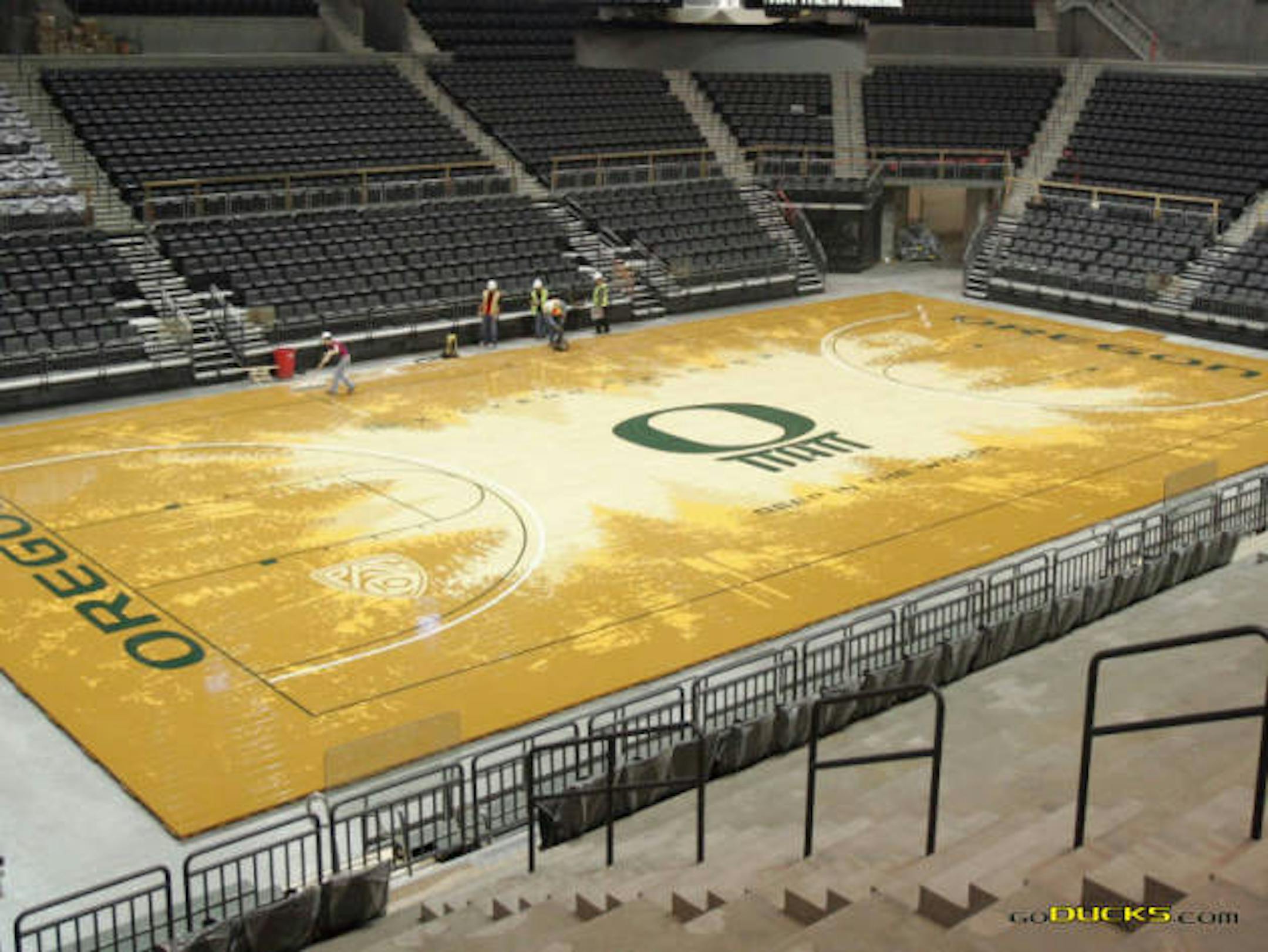 If you've ever, by mistake or by design, channel surfed into a University of Oregon basketball game, you know that basketball courts are taking on the potential for a one-of-kind look well beyond corporate logos and team nicknames.
