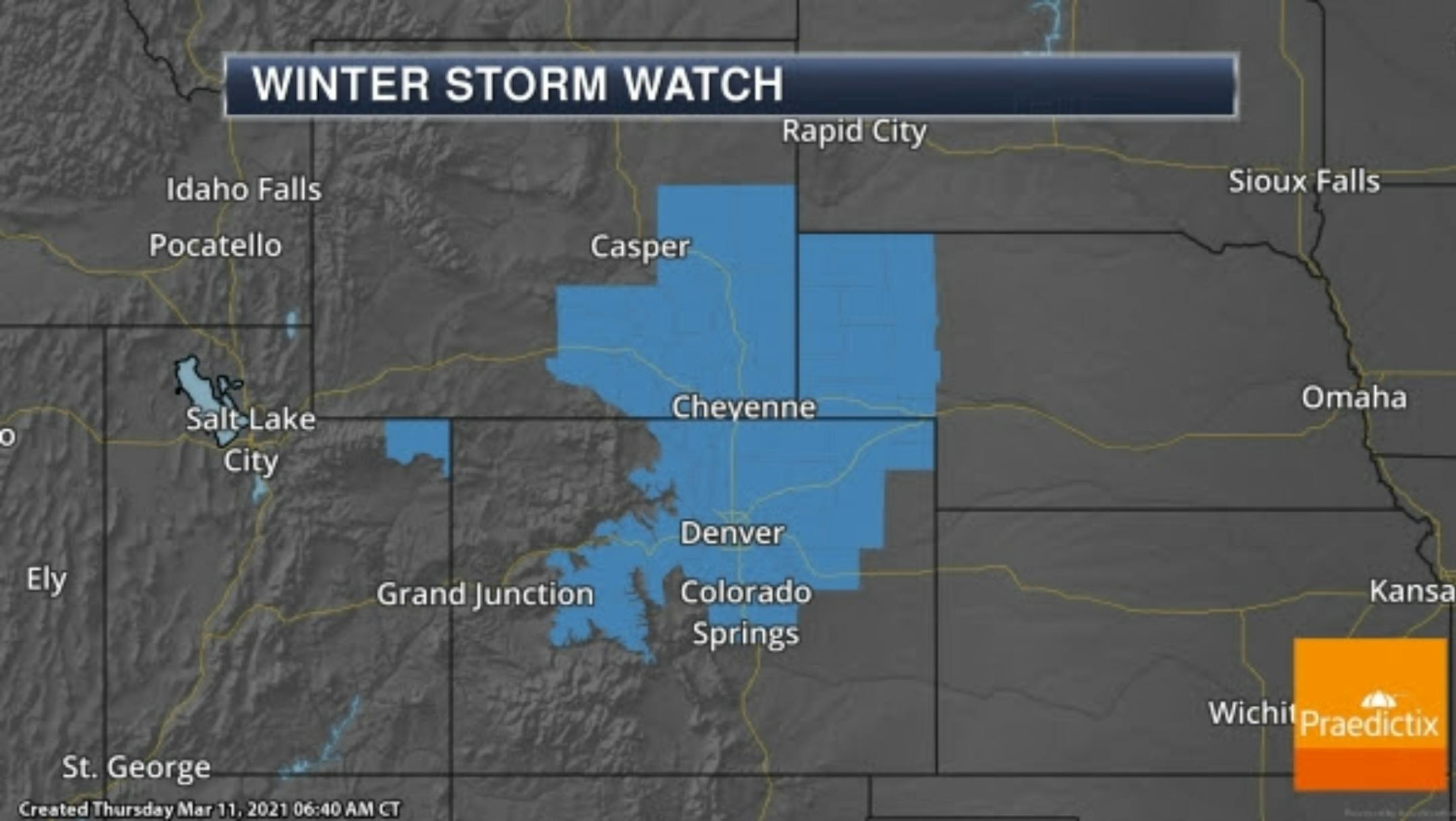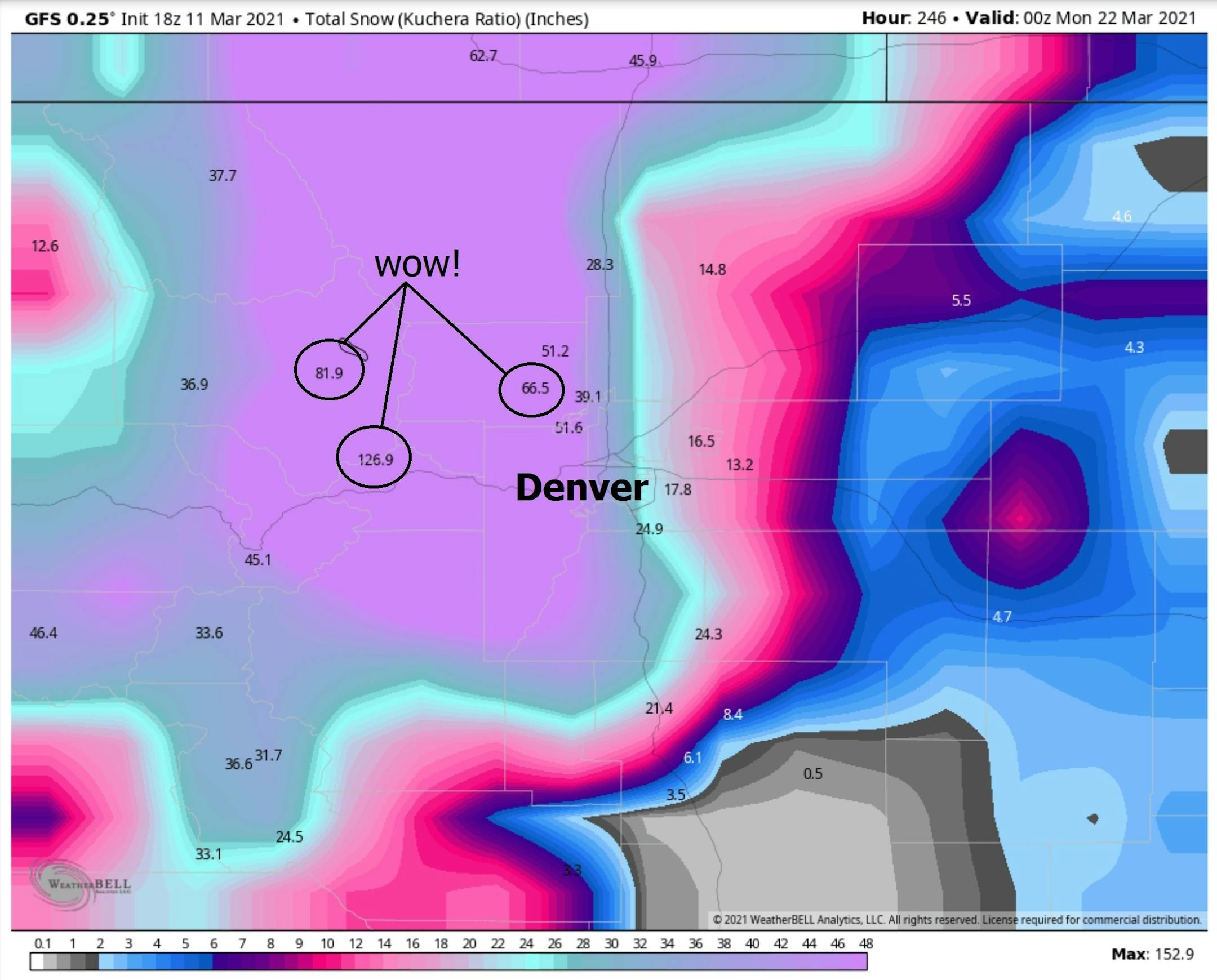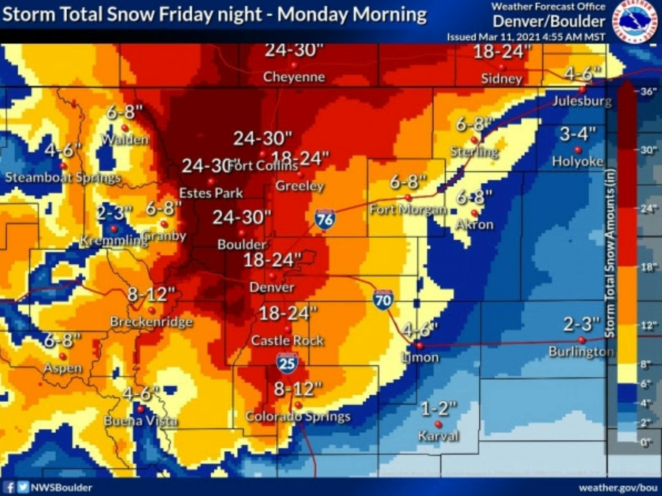Blockbuster Snow Totals Expected. Major snowfall totals are expected across the Front Range, Laramie Range, and the High Plains Friday through Sunday. Snow totals will easily be more than 2 feet in some locations, including areas like Boulder, Estes Park, Fort Collins, Cheyenne, and Laramie. Snow totals in Denver are currently expected to be between 18-24", with 8-12" for Colorado Springs. This snow will lead to interrupted travel across the region, with the Colorado DOT already advising people to stay off the roads during the storm with road closures likely (https://www.codot.gov/news/2021/march-2021/statewide-winter-storm-warning). This heavy, wet snow will also lead to the potential of power outages, could bring down tree branches, and will be hard to shovel or even plow as it continues to accumulate on surfaces.