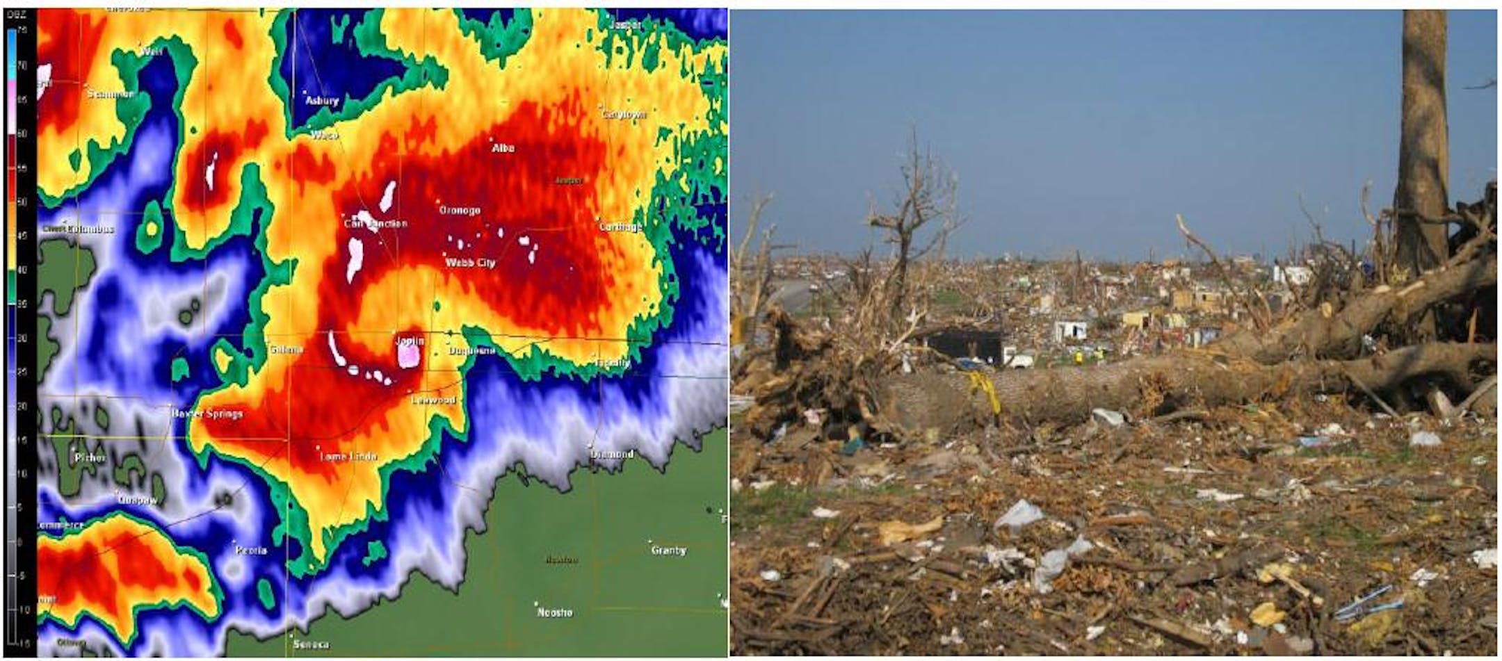 Joplin tornado radar signature and damage (NOAA/The Minnesota Star Tribune)
