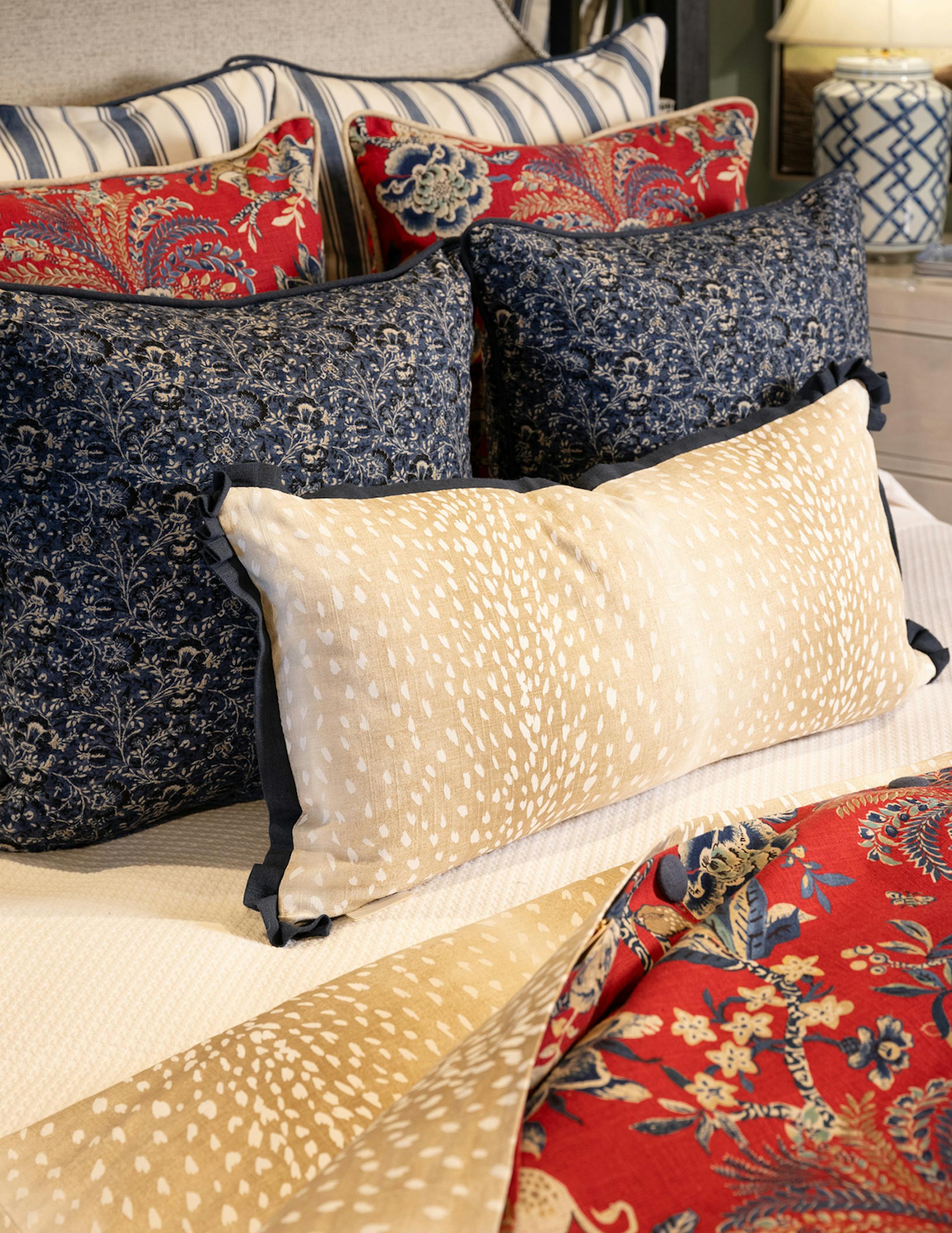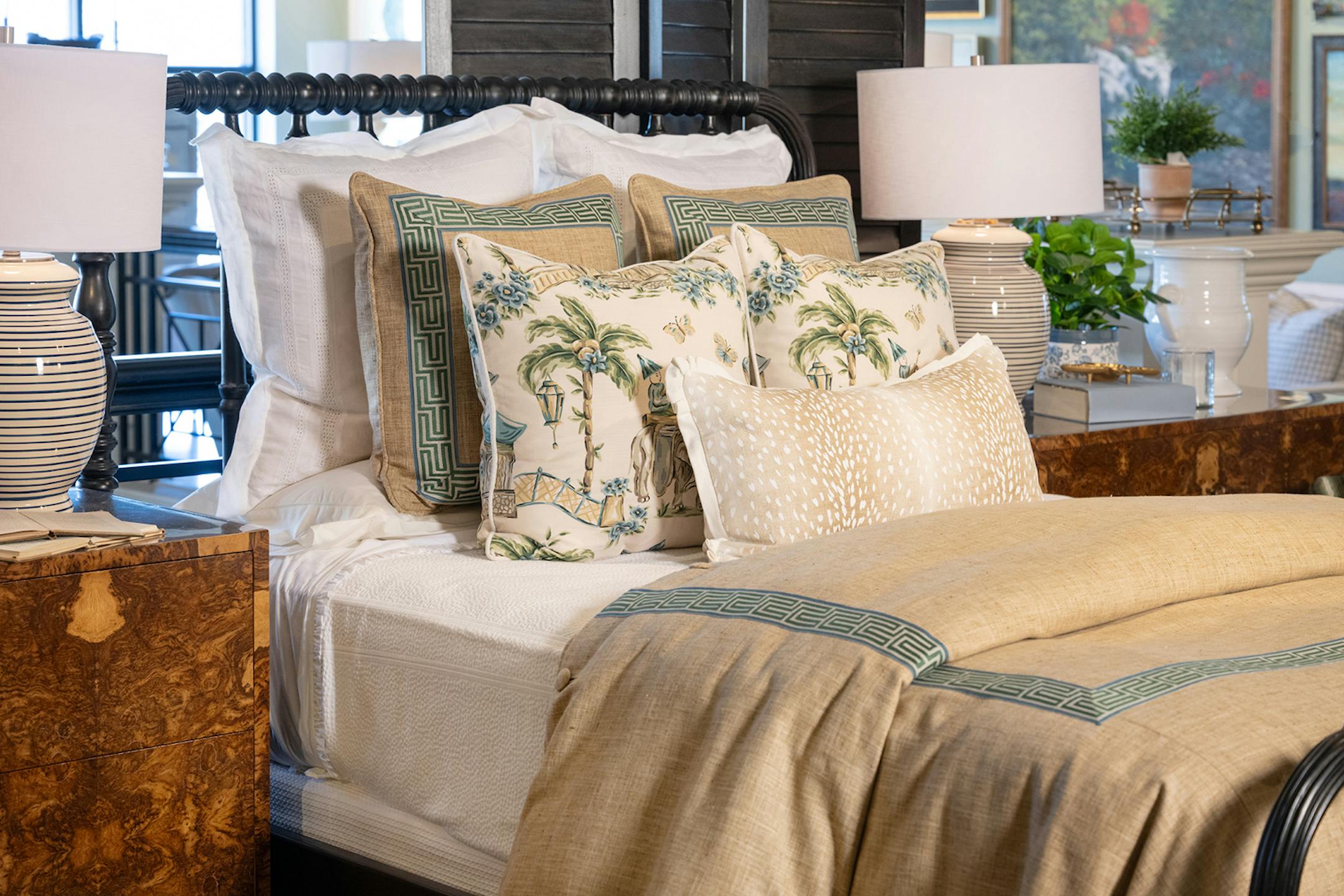 This bedscape creates a serene oasis with its soft wash of neutrals, greens and blues. The hero fabric of the pillow selection, an Asian toile with palm trees, evokes a British colonial vibe through our styling choices, lending a stately elegance to the room. This look is perfect for those who appreciate refined, timeless design elements.