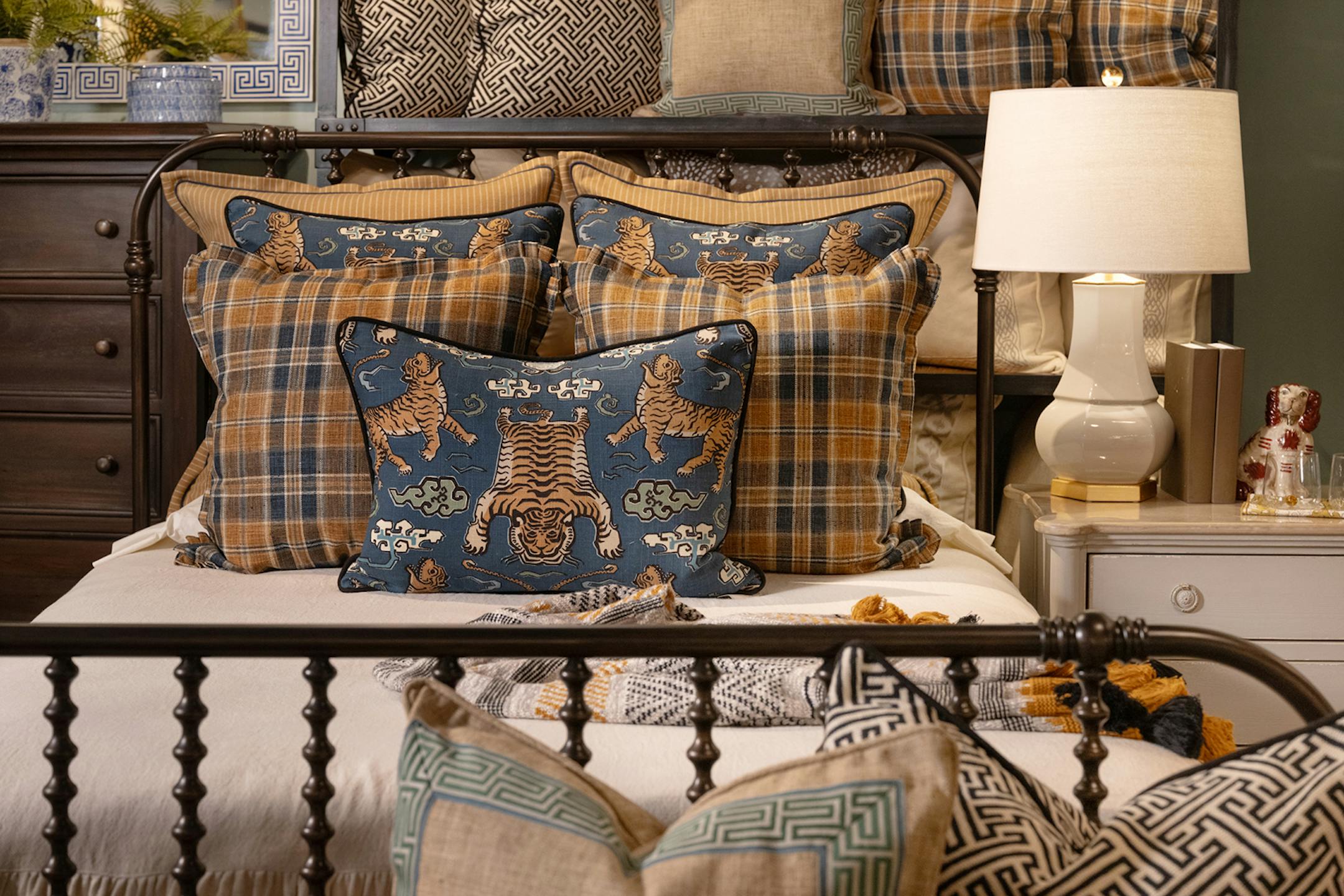 This stunning bedscape showcases the art of pattern mixing and matching, demonstrating how different textures and prints can harmoniously come together to create a cohesive and visually appealing design. At the heart of this ensemble is the striking blue tiger fabric Tigris Denim, which serves as the focal point and sets the tone for the entire bedding arrangement.