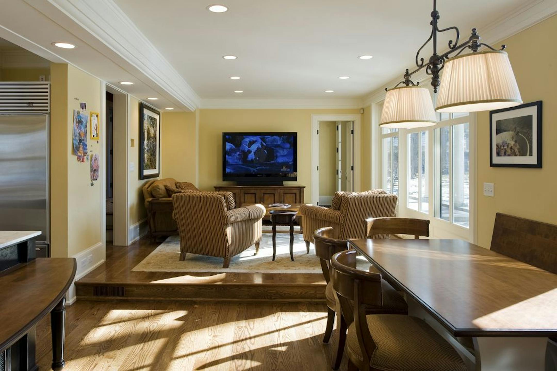 New spaces: The original butler's quarters is now a cozy family room. Aulik raised the family-room floor about 6 inches, which allowed him to reconfigure the back stairs and create a mudroom. A former desk at one end of the kitchen is now a banquette for casual dining and homework. That's Amy's favorite feature: "The kids can be playing games or drawing while I'm cooking," she said.