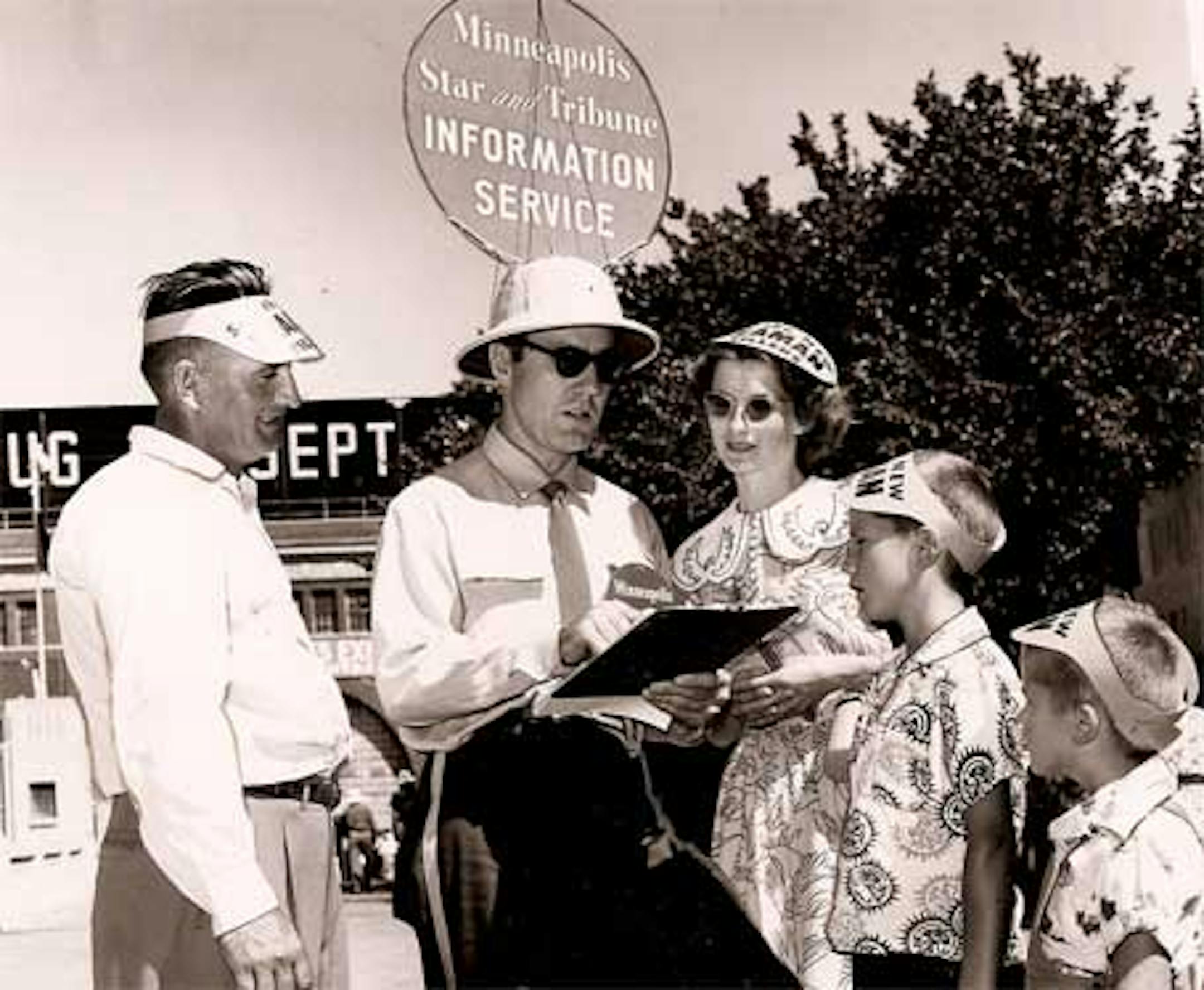 That's Paul Jacobsen, one of the Tribune's "Walking Information Booths." pausing to give directions. He was dressed in a blue and yellow uniform, with a sign tethered to his hat. Want to bet how many times juvenile delinquents threw things at the sign?