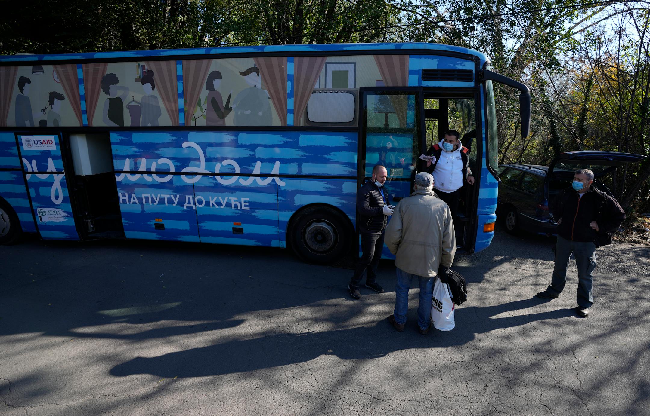 BELGRADE, Serbia — Standing close together on a sunny autumn day, a group of people wait patiently by a blue bus parked beneath a bridge in Belgrade. This will be a rare chance for them to have a shower, wash their clothes or get a medical checkup. Three times a week, a humanitarian organization working in Serbia opens up its mobile bus center for the homeless, offering basic services and help to some of the thousands living and sleeping rough in the Balkan country's capital city.