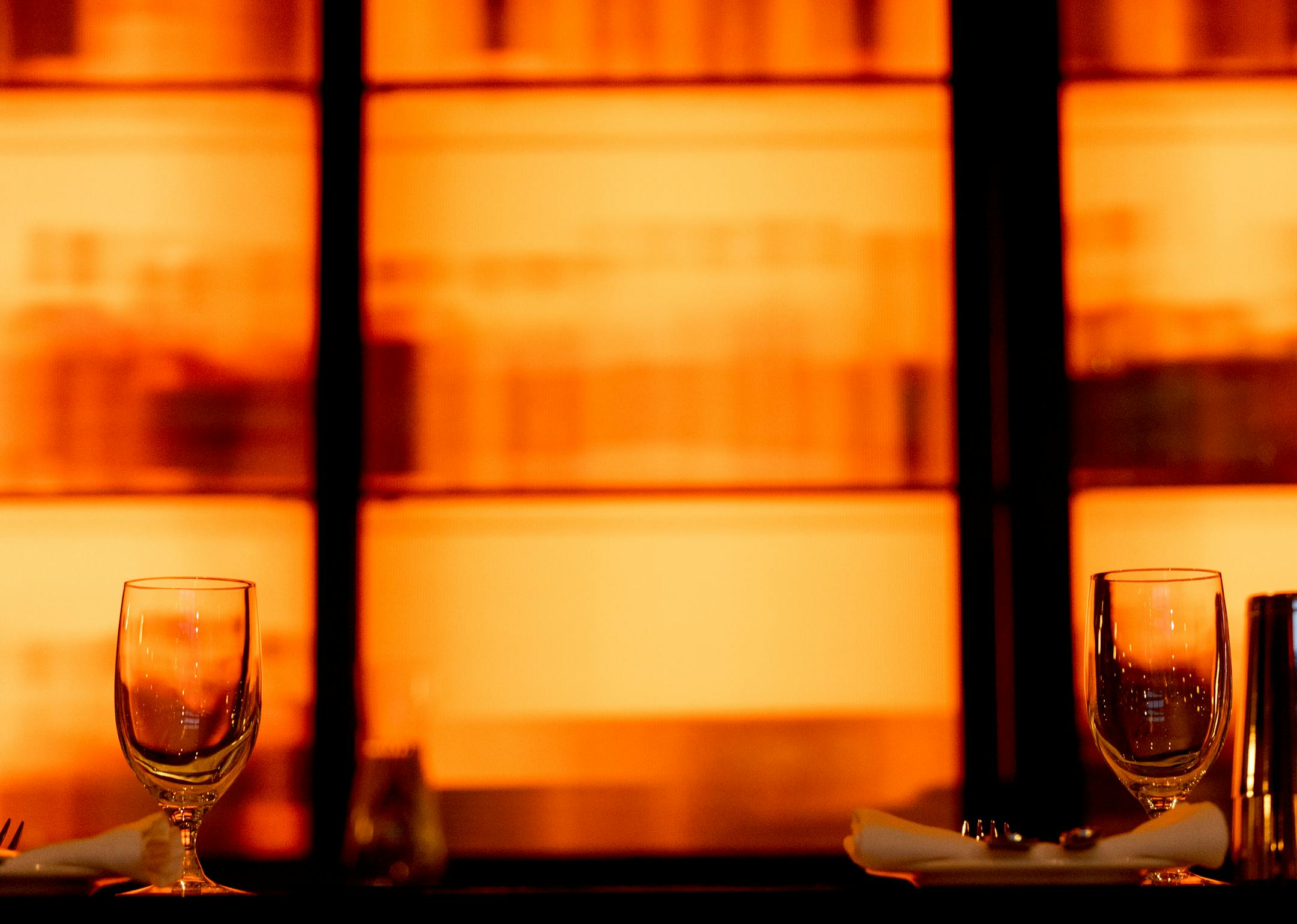 In the evenings, the dining room plunges into warm, low-lit ambience and the small, curved bar glows red. The clink of shifting silverware forecasts the menu of French comforts served elegantly, like escargot bathed in garlic butter, towers of fresh seafood nestled into pebble ice, plump roast chicken with a sauce so smooth it looks like poured suede, and profiteroles with Grand Marnier and poured chocolate.