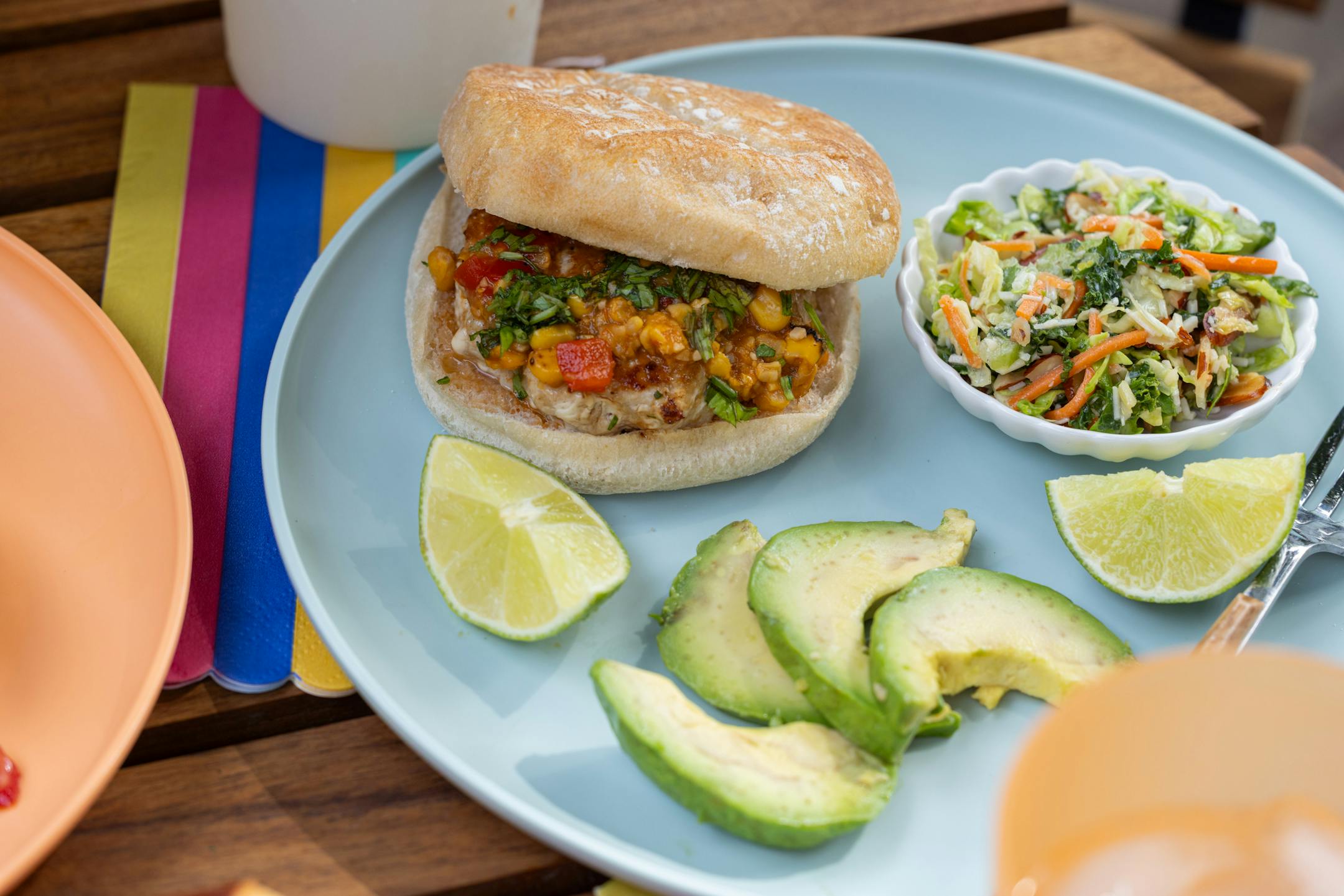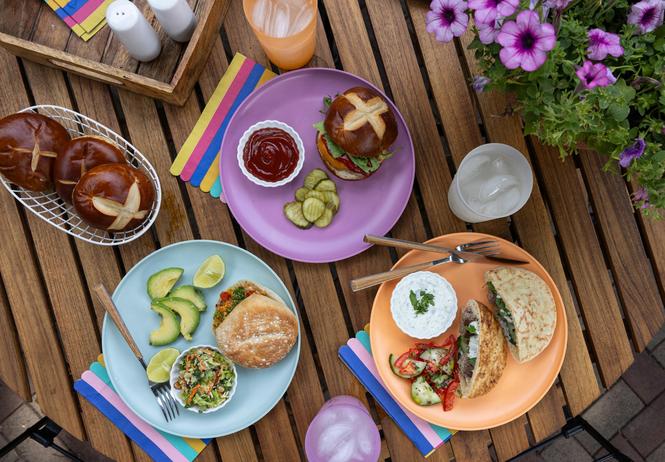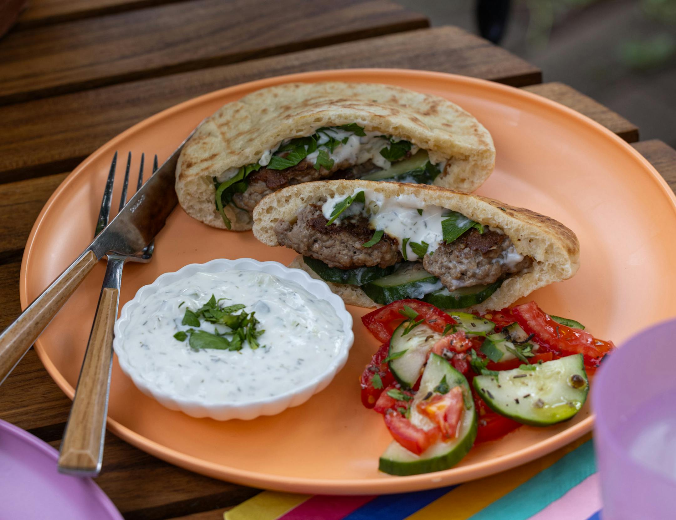 Condiments can be a contentious issue. Set out a selection and allow diners to choose their own: lettuce, tomatoes, ketchup, mustard, mayo, onions, pickles, salsa, tzatziki, crisp cukes are all popular.