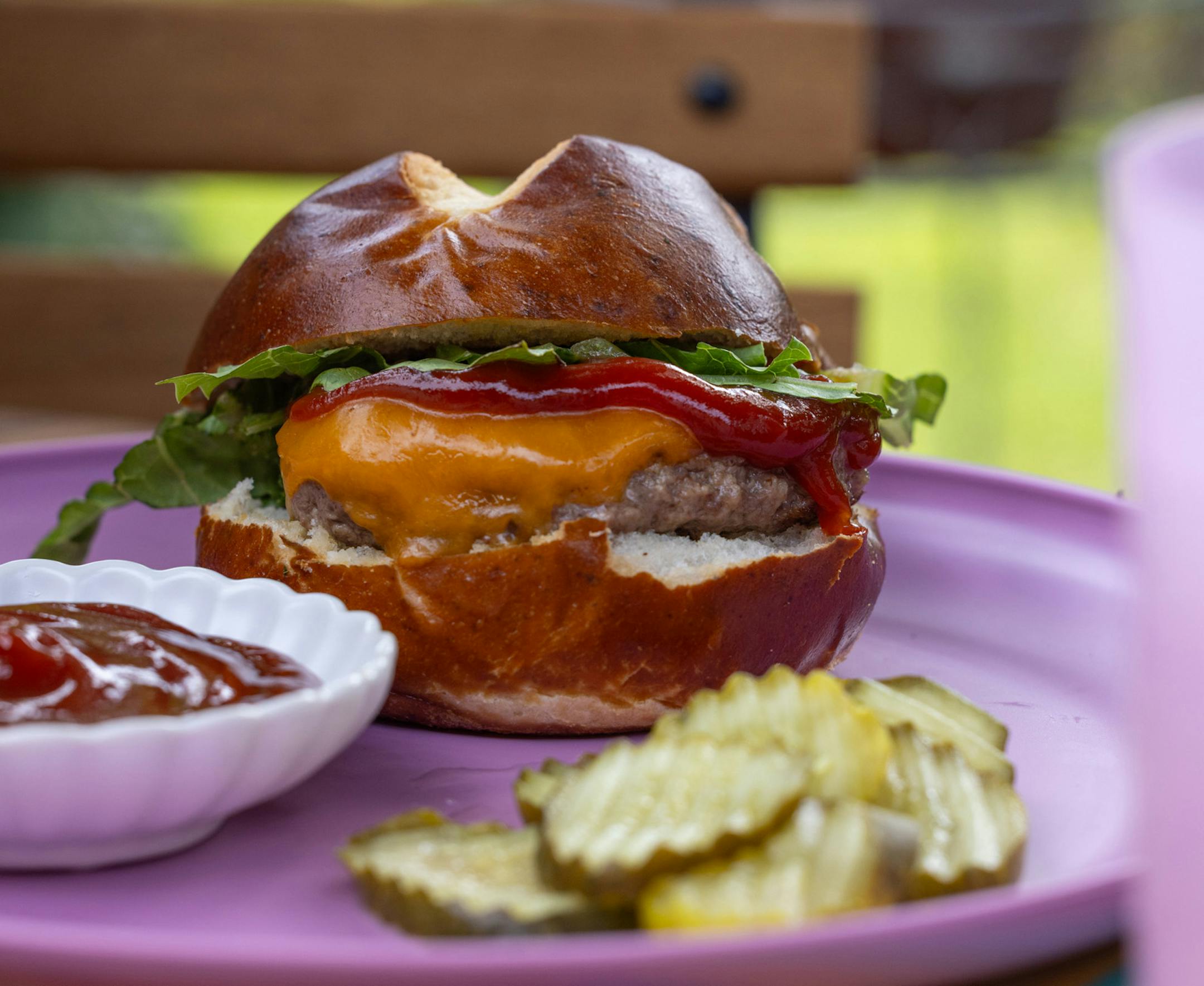 Let the type of meat inform the bun. The only rule is that the bun not overwhelm the burger. For a hamburger, brioche or soft pretzel buns will absorb the juices; turkey burgers work well on firmer buns or English muffins for sloppy toppings; and lamb burgers fit nicely into pita halves. Be sure the buns are ready to go when the burgers come off the griddle.