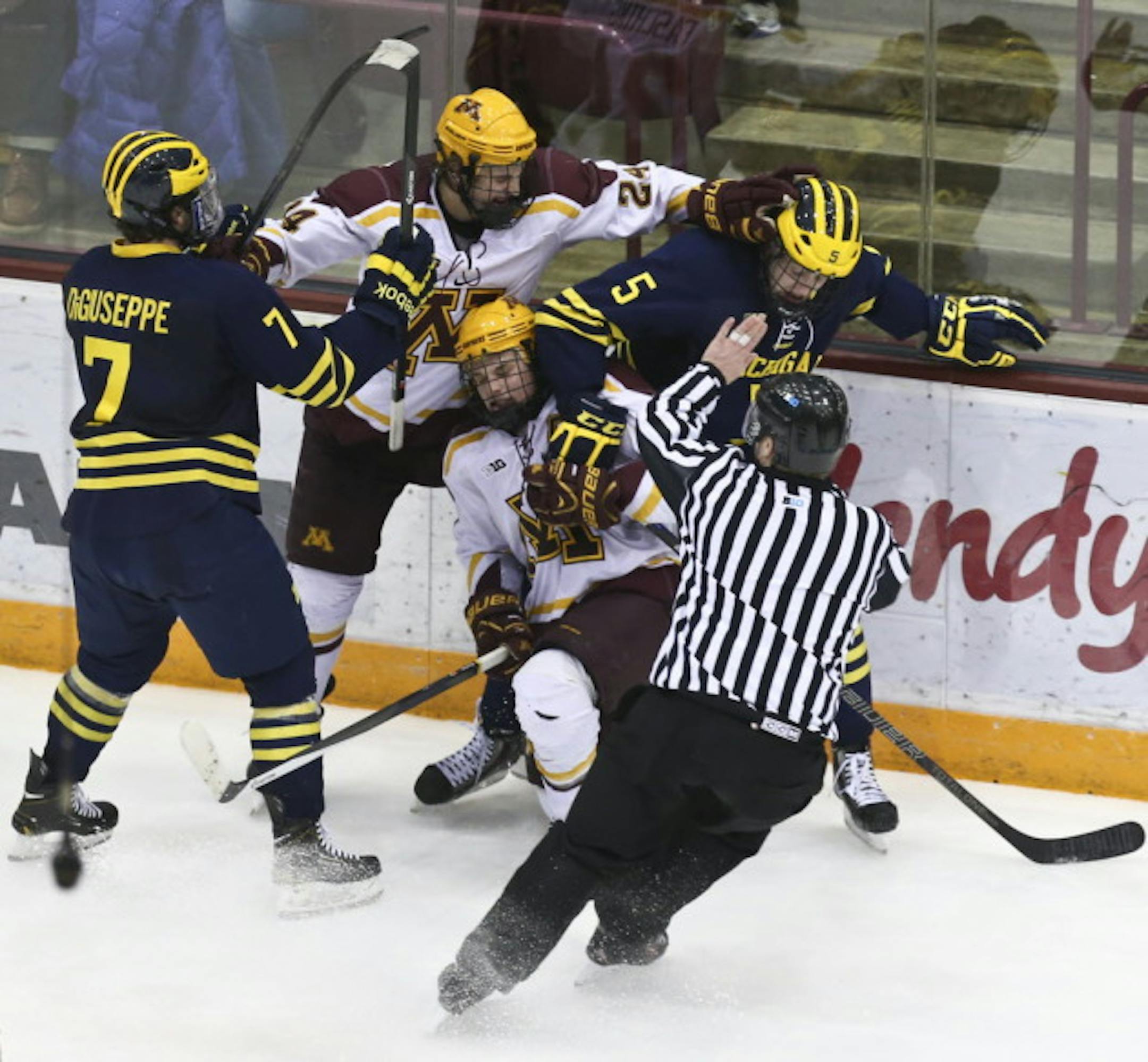 A fight broke out between Michigan's Phil Di Guiseppe (7), Michael Downing (5) and Gophers Hudson Fasching (24) and Kyle Rau (7) during the third period on Friday at Mariucci Arena. Downing was disqualified from the game for the hit that led to the scuffle.