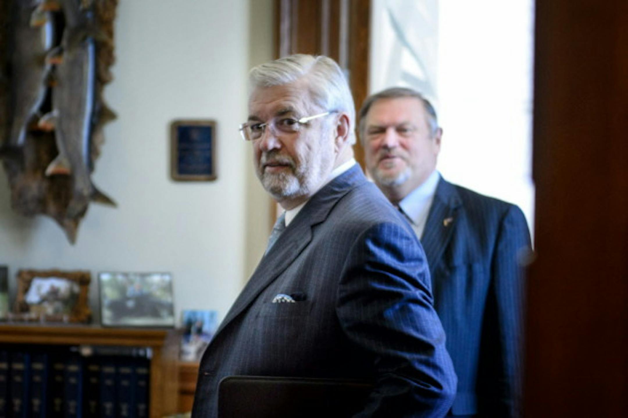 Above: Bill McGuire enters the office of Senate Majority Leader Tom Bakk earlier this month.