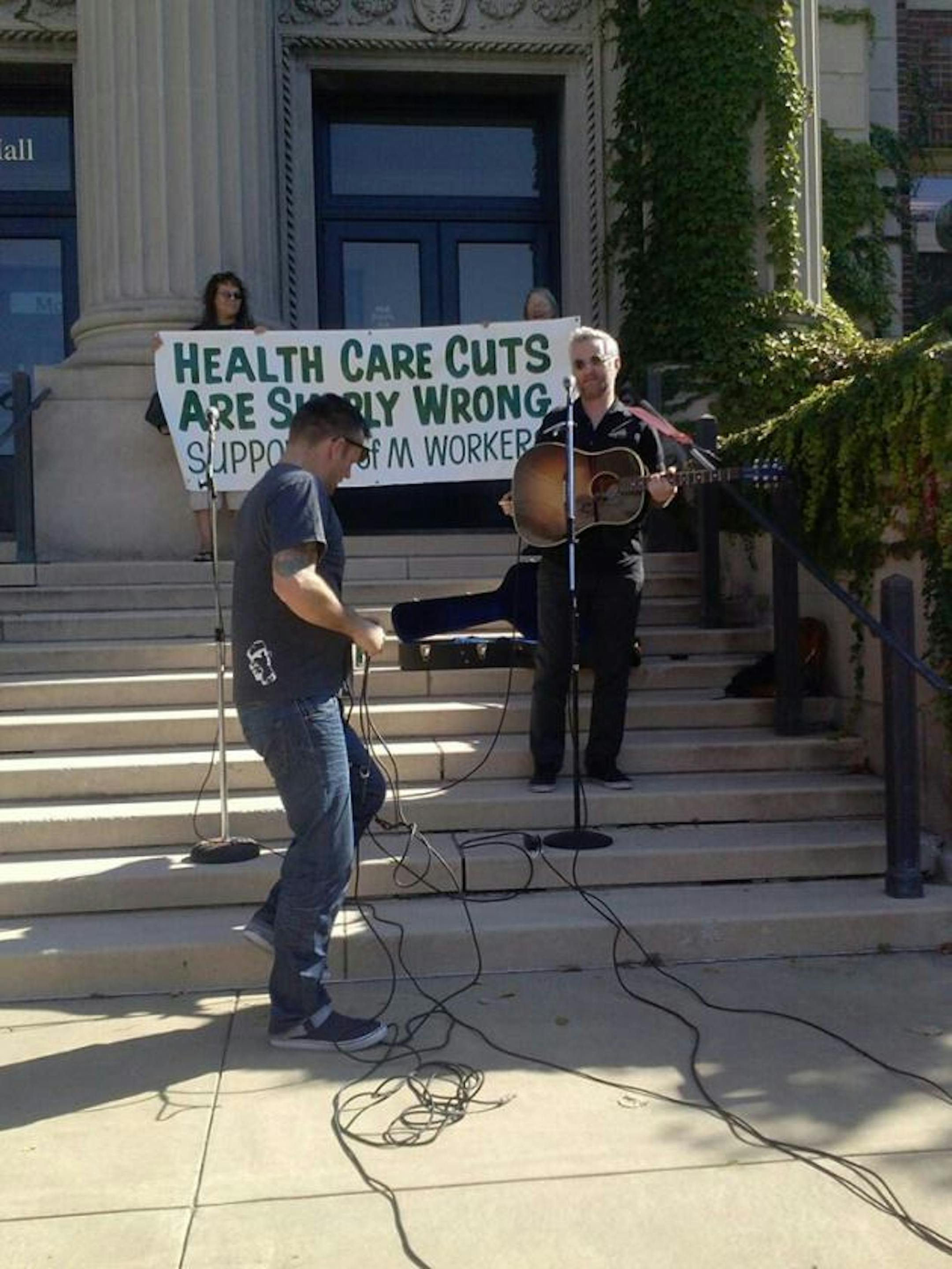 British singer-songwriter Billy Bragg made a surprise appearance at a labor rally on the University of Minnesota campus today. Members of AFSCME locals, representing University workers, scheduled the Rally for Affordable & Accessible Healthcare for All at noon on Northrop Mall. When organizers realized Bragg would be in Minneapolis to play The Cedar, on the very day of their rally, they fired off a long-shot request via Facebook. According to one activist who spoke at the rally, Bragg responded immediately, eager to lend his support. A well-known advocate of unions, Bragg performed "I Keep Faith" and "There is Power in a Union" before an audience of sign-wielding demonstrators. He plays a sold-out show at The Cedar tonight at 7:30 p.m.