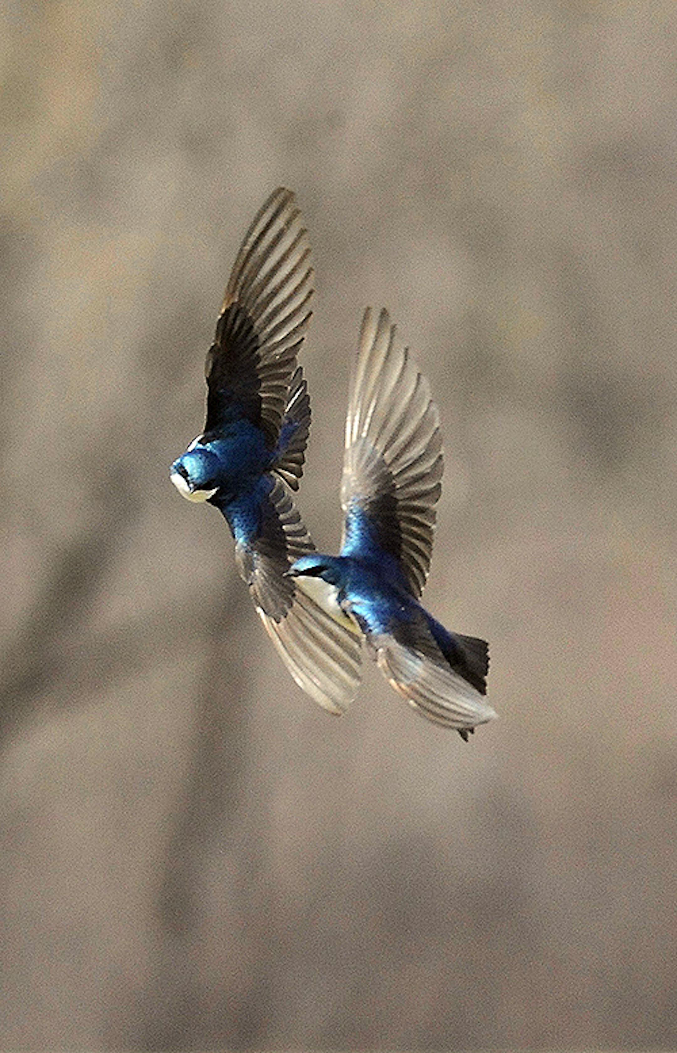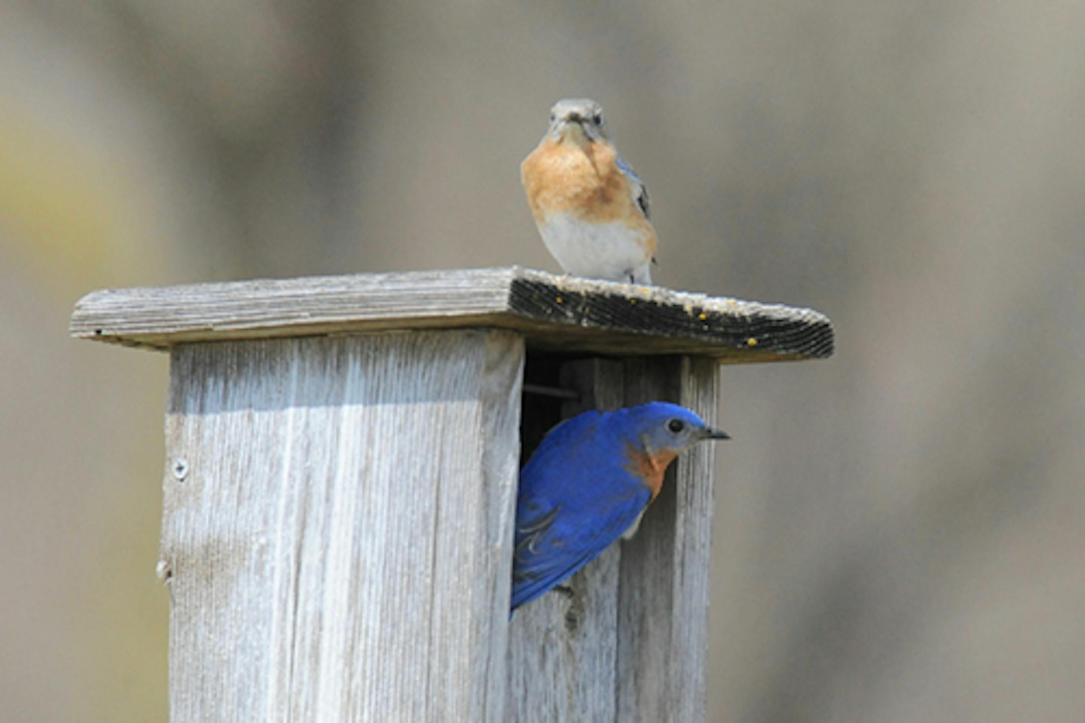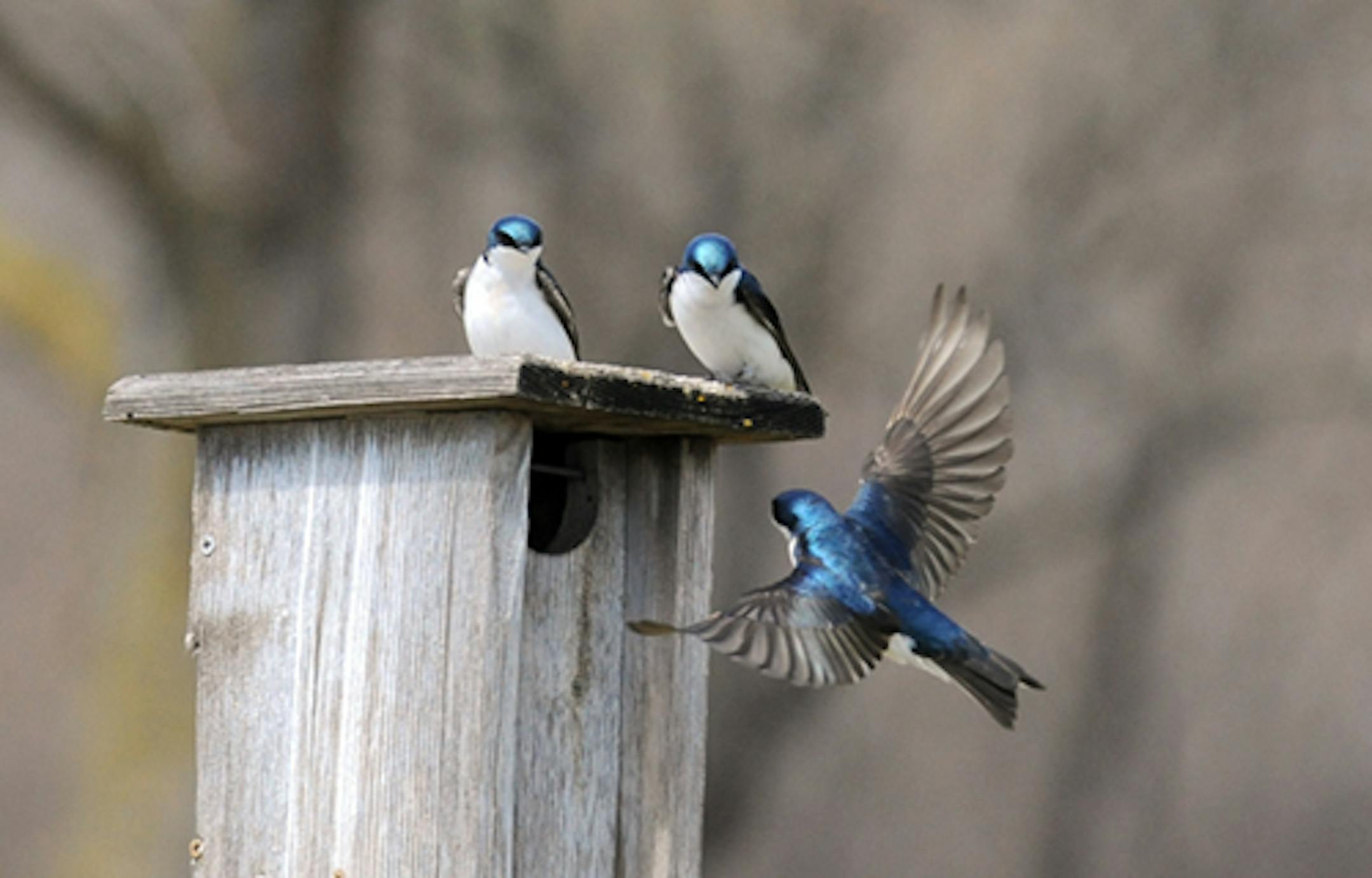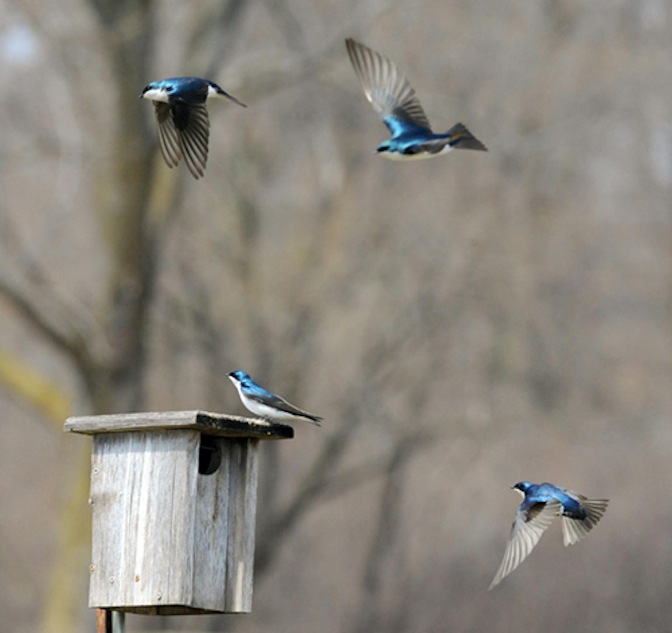 Tree swallows and eastern bluebirds are back in our neighborhood (eastern Orono), trying to claim nest boxes. A male bluebird flew between two boxes, leaving one for the swallows to visit. There was no squabbling between the two species, but plenty of competition among swallows for one box in particular. There 10 boxes spread throughout this location (short course at golf club). That's more than enough to go around for these early migrants (about a dozen swallows, two bluebird pairs).