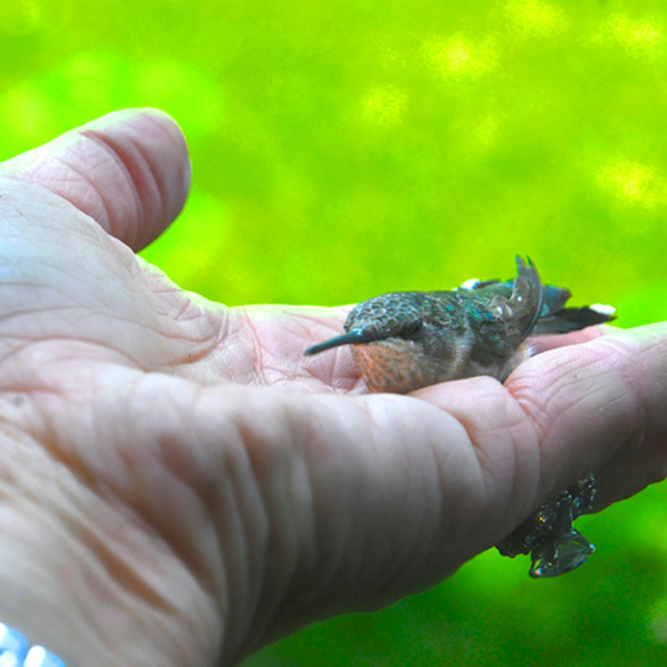 The Ruby-throated Hummingbird took a brief rest yesterday in the hand of Excelsior photographer Rebecca Hahn. The bird was feeding on hosta blooms, in the sun, when Rebecca extended her hand. She was surprised to see her offer accepted. Rebecca said the bird appeared exhausred. It rested for a few moments, then flew off to a nearby tree. Rebecca used one hand for the bird, the other for her camera.