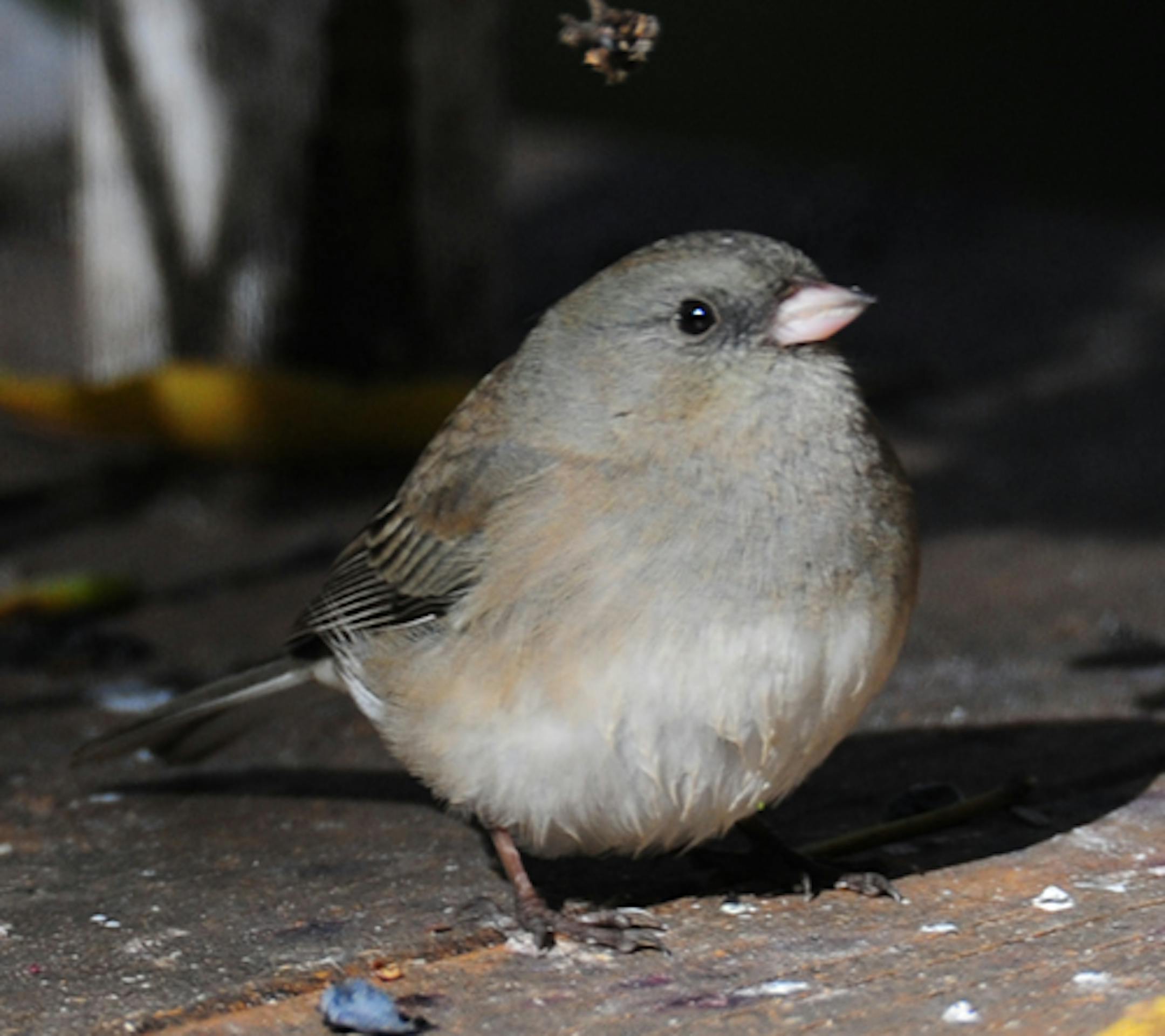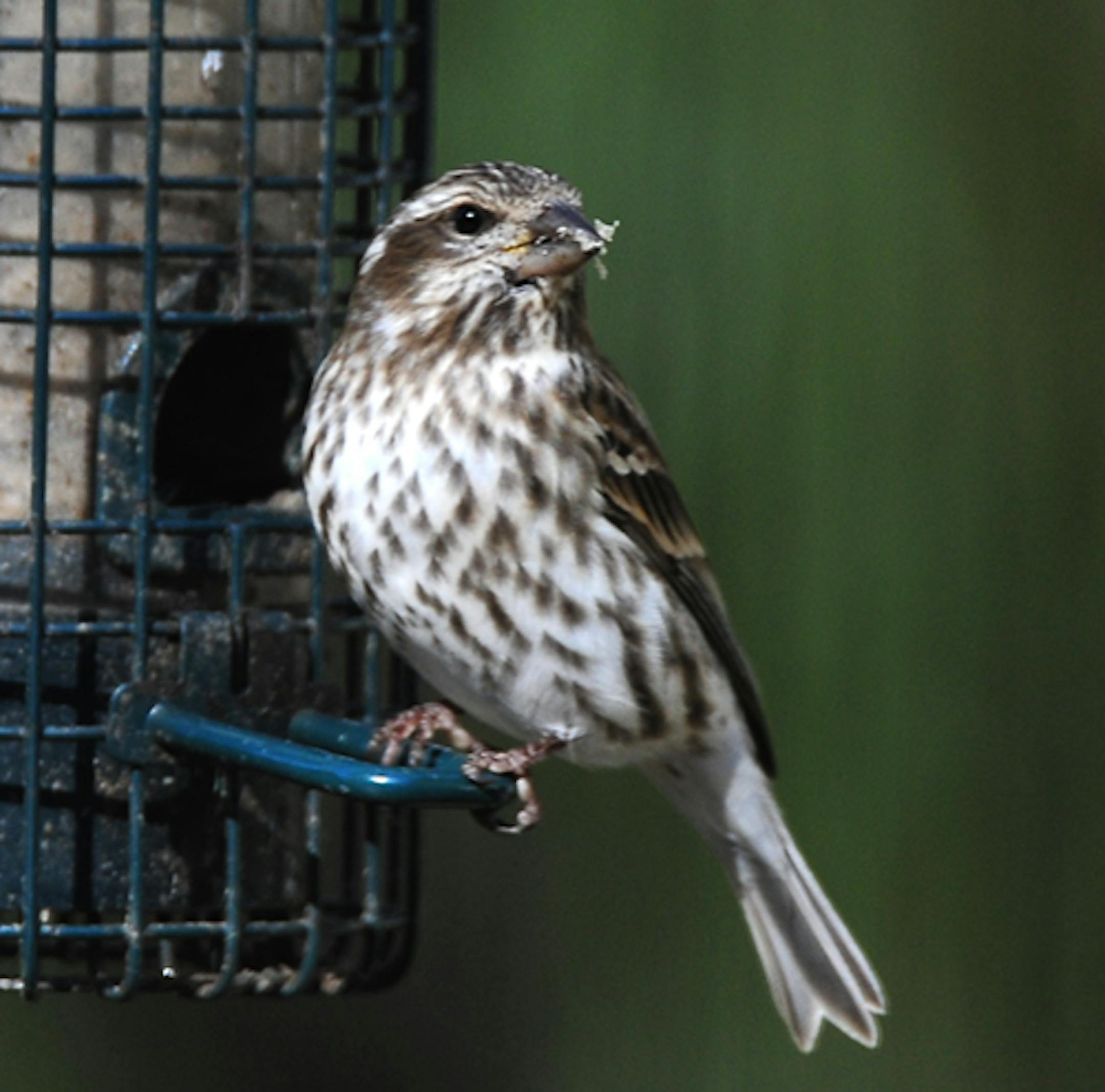 Juncos and Purple Finches (second photo) have been at our feeders this week. Both species come down from nesting sites that spread coast to coast across Canada. They are winter visitors here. The junco pictured is the Slate-colored race of the Dark-eyed species. Juncos come in several races: Slate-colored, Oregon, Pink-sided, White-winged, Gray-headed, and Red-backed. Slate-colored is our usual visitor. The third bird pictured is a Red-winged Blackbird showing the colored feather tips that will wear off this winter, creating the shiny black bird we see in the spring.