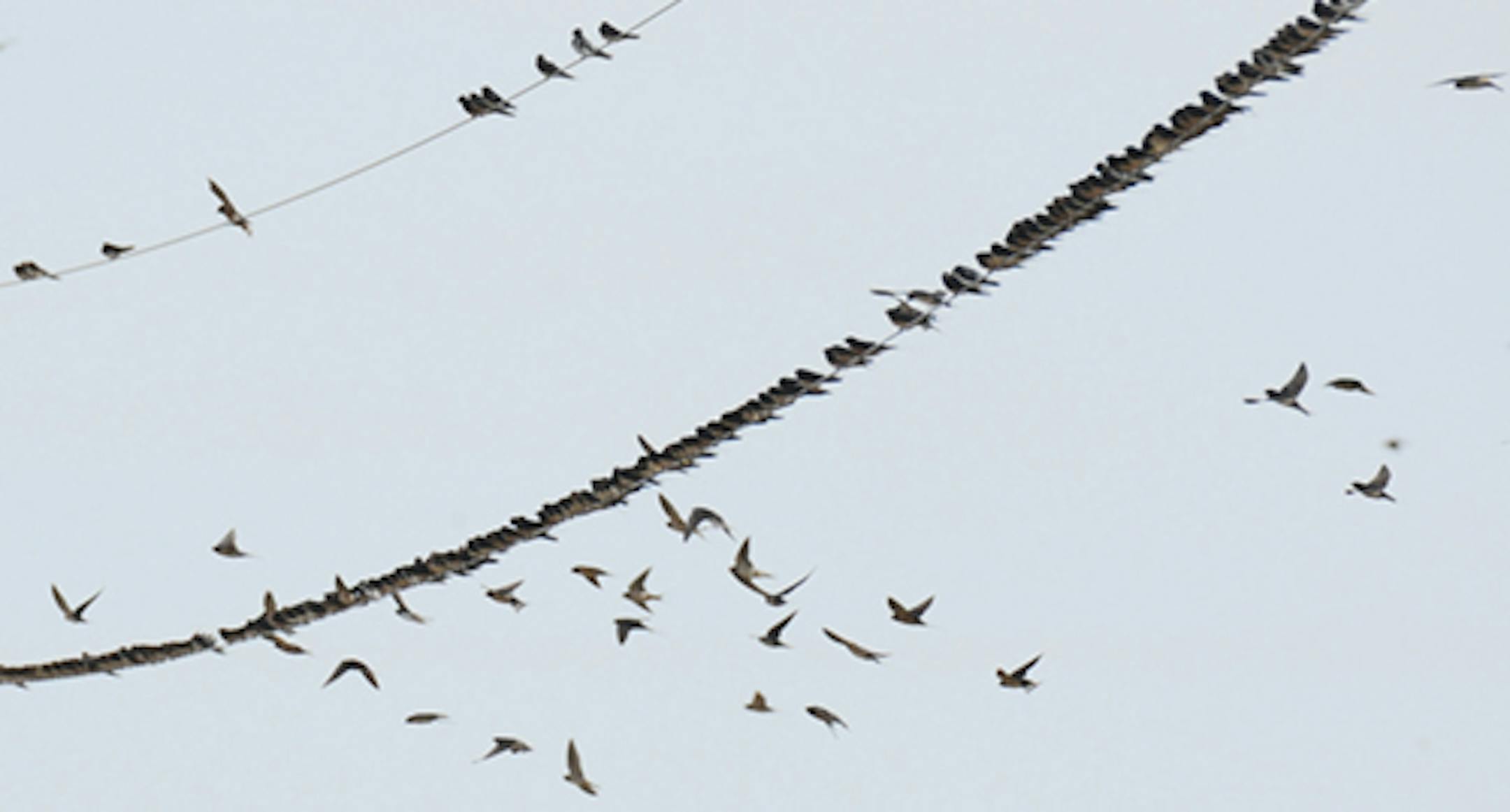 Here we have Barn Swallows flocking up prior to migration. This was along a country road in South Dakota. Most of the birds chose the lower wire. Every time they flushed and returned, it was the lower of the two wires. Why is that?