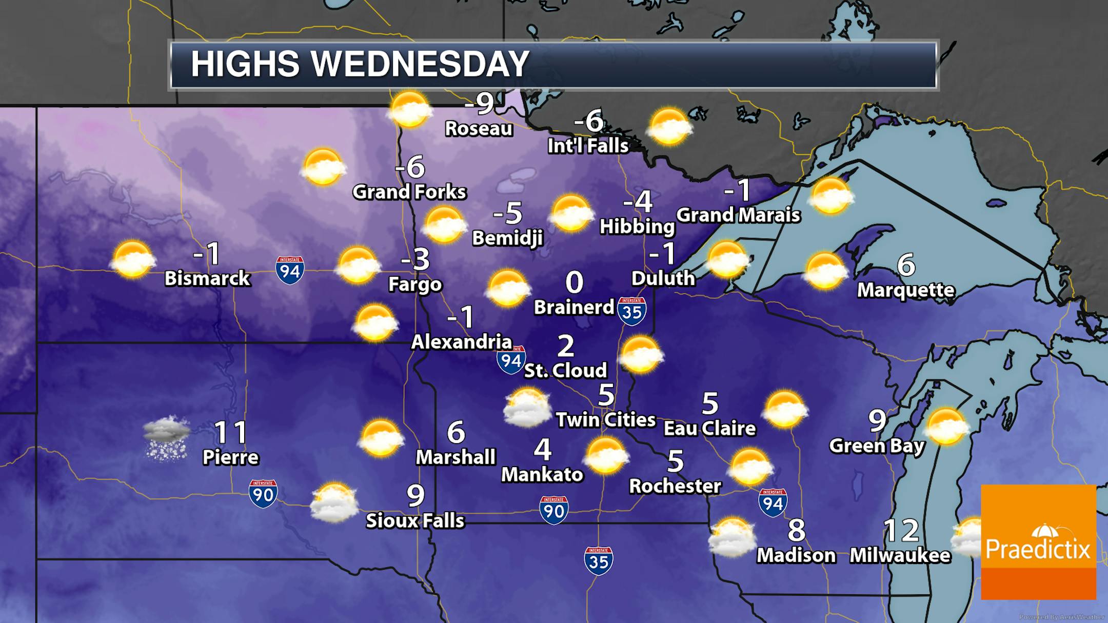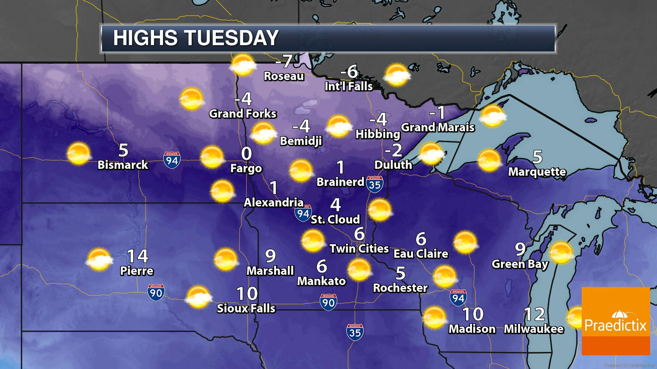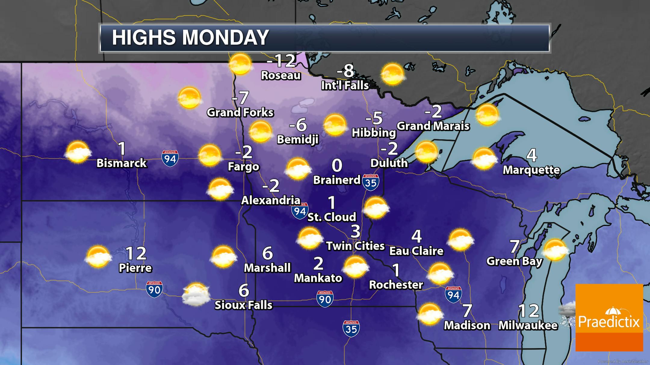 When we look at daytime highs Monday across the state... yep, it's still cold. Highs will range from the mid-single digits above zero in southwestern Minnesota to the teens below zero up north. A mix of sun and clouds to mainly sunny skies are expected.