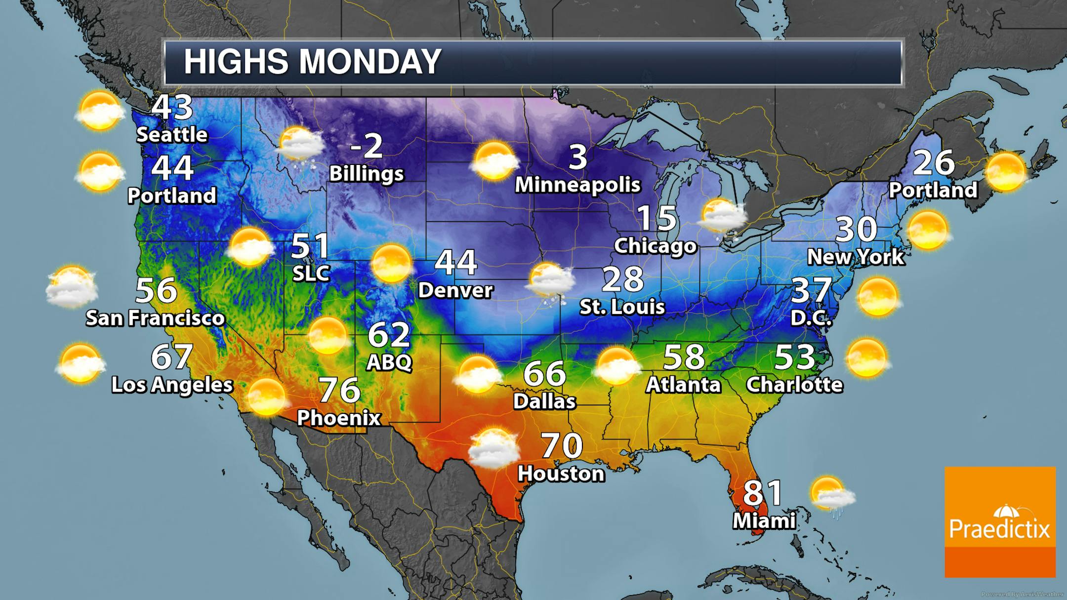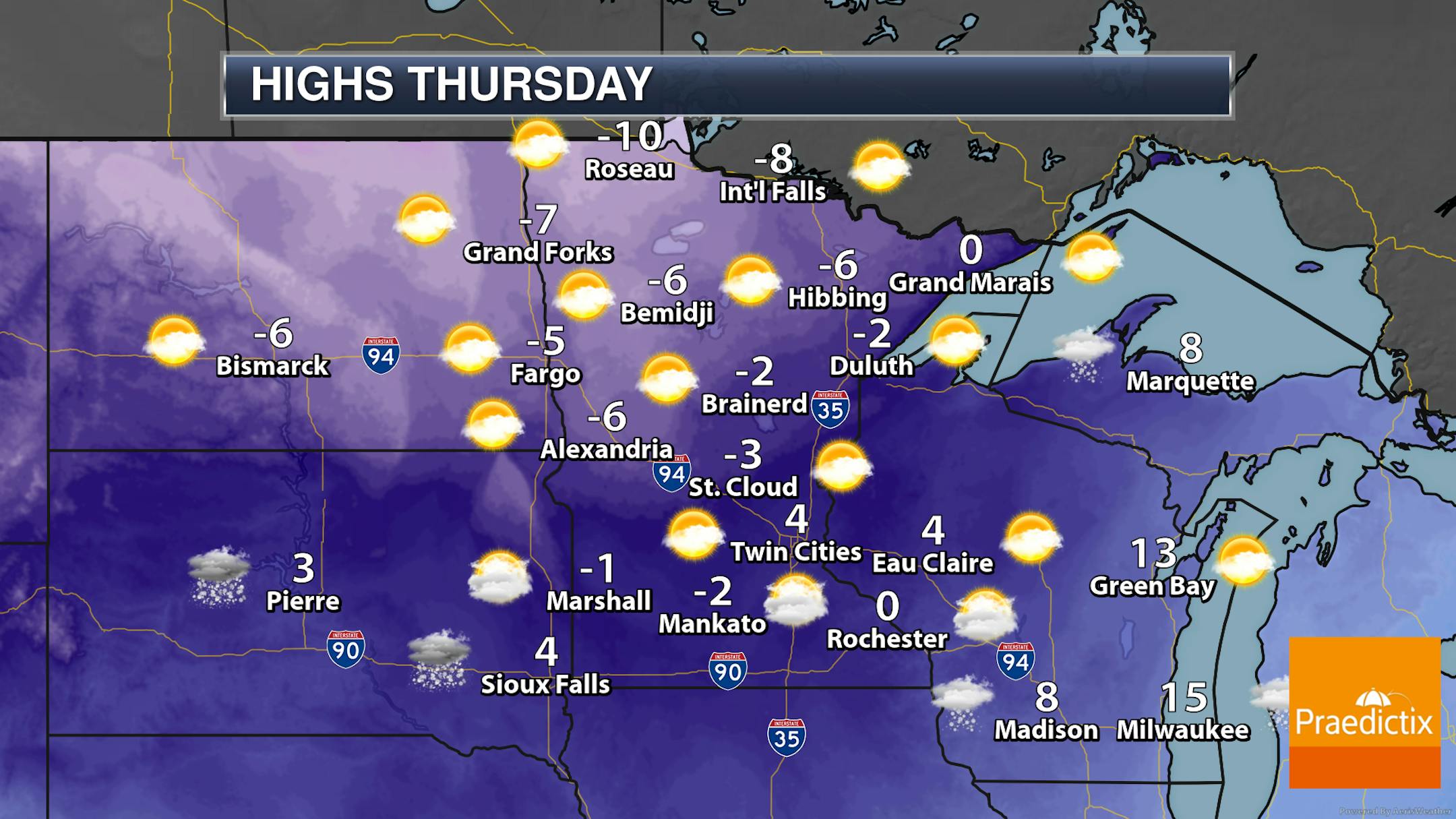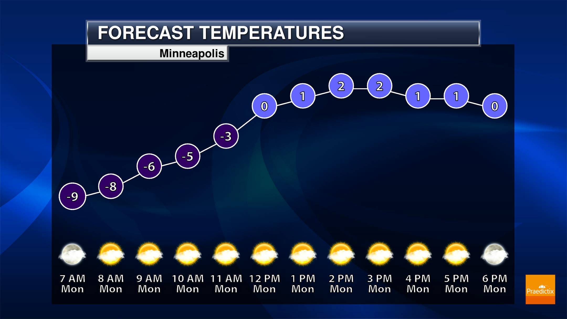 When we look at daytime highs Monday across the state... yep, it's still cold. Highs will range from the mid-single digits above zero in southwestern Minnesota to the teens below zero up north. A mix of sun and clouds to mainly sunny skies are expected.