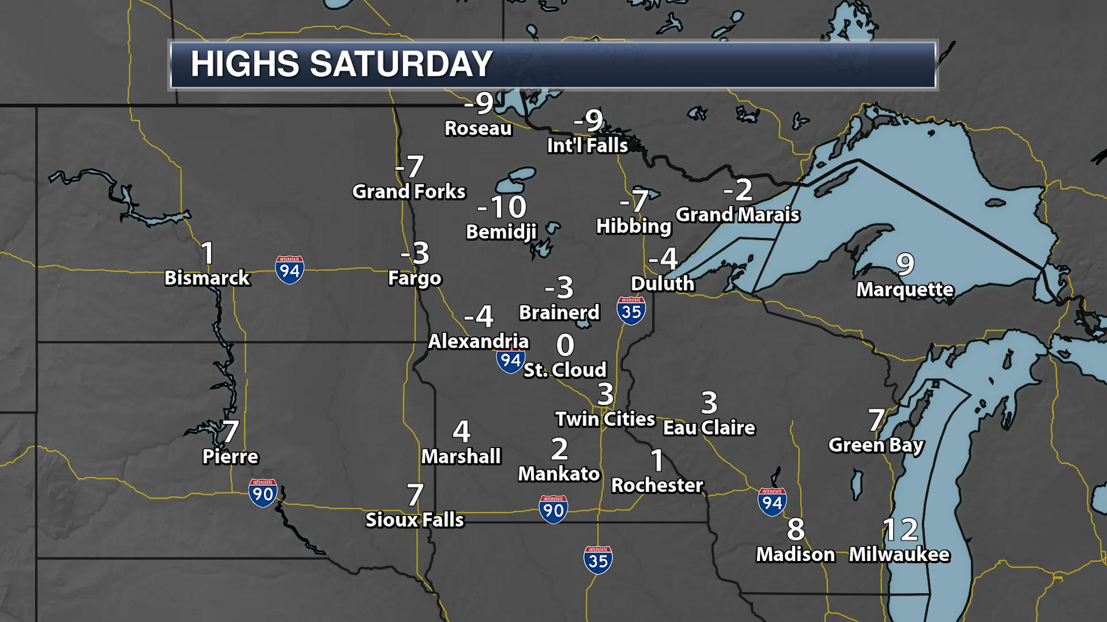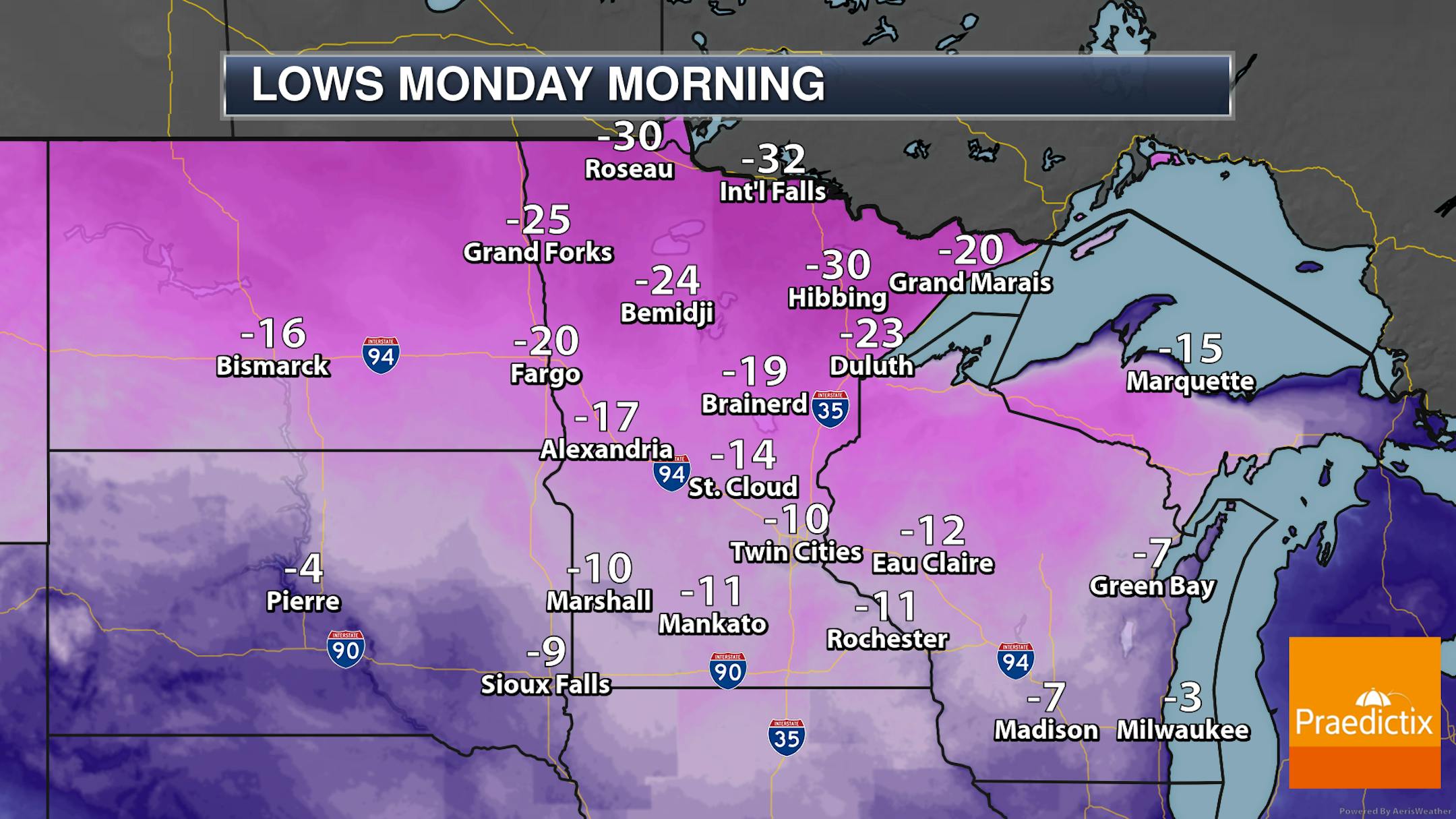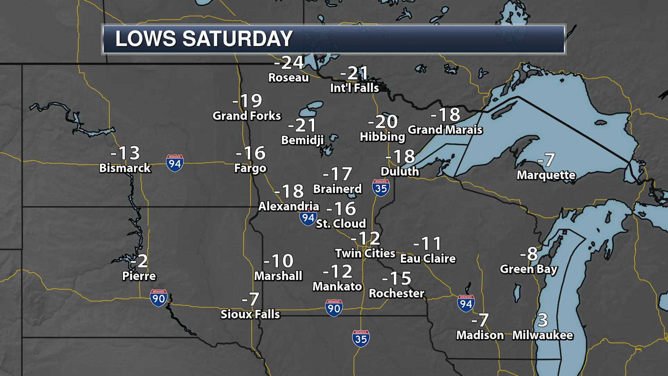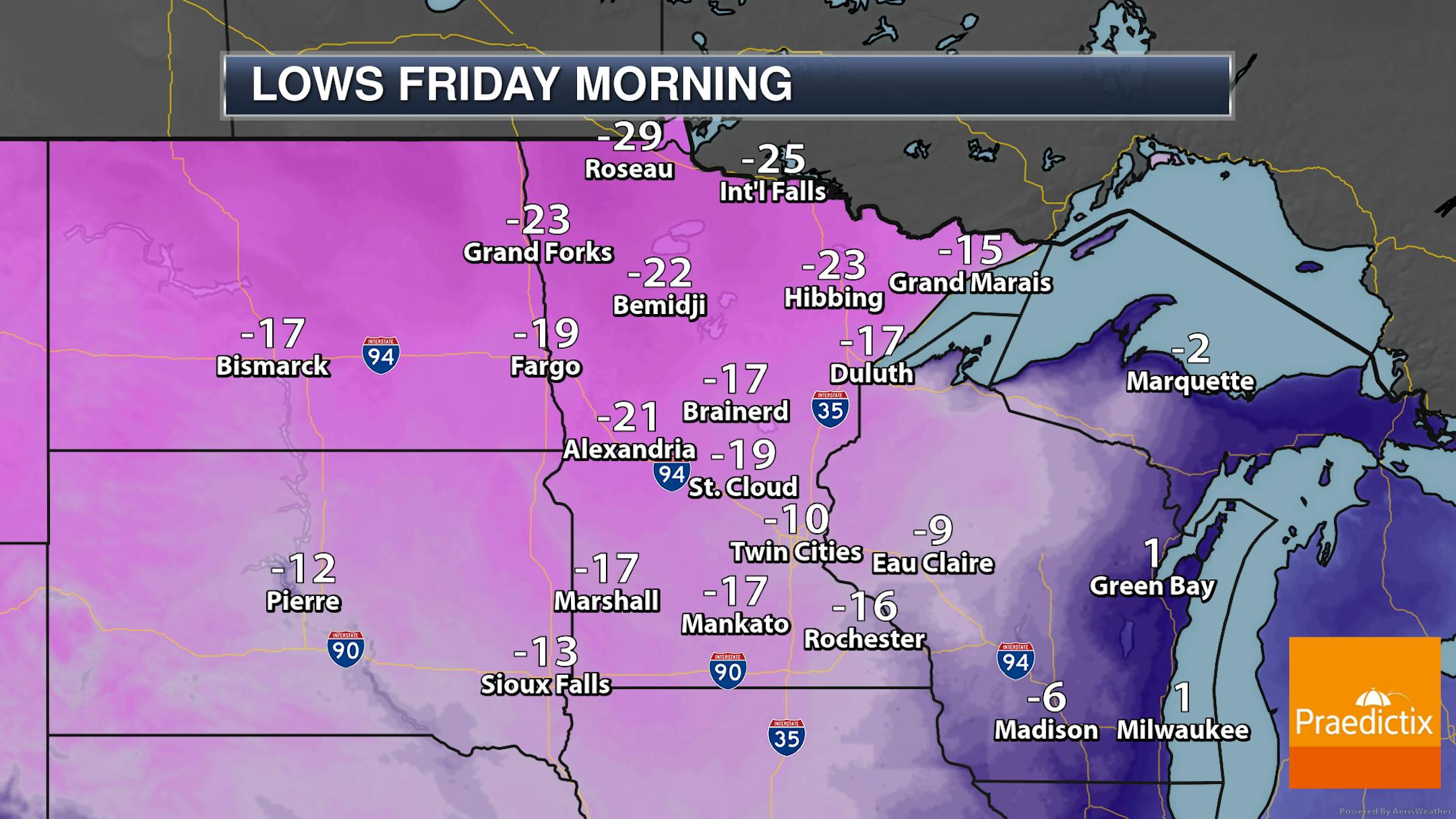 Make sure you bundle up the kids as they head out to the bus stop in the morning as lows dip to around -10F in the Twin Cities and into the -30s up in northern Minnesota.