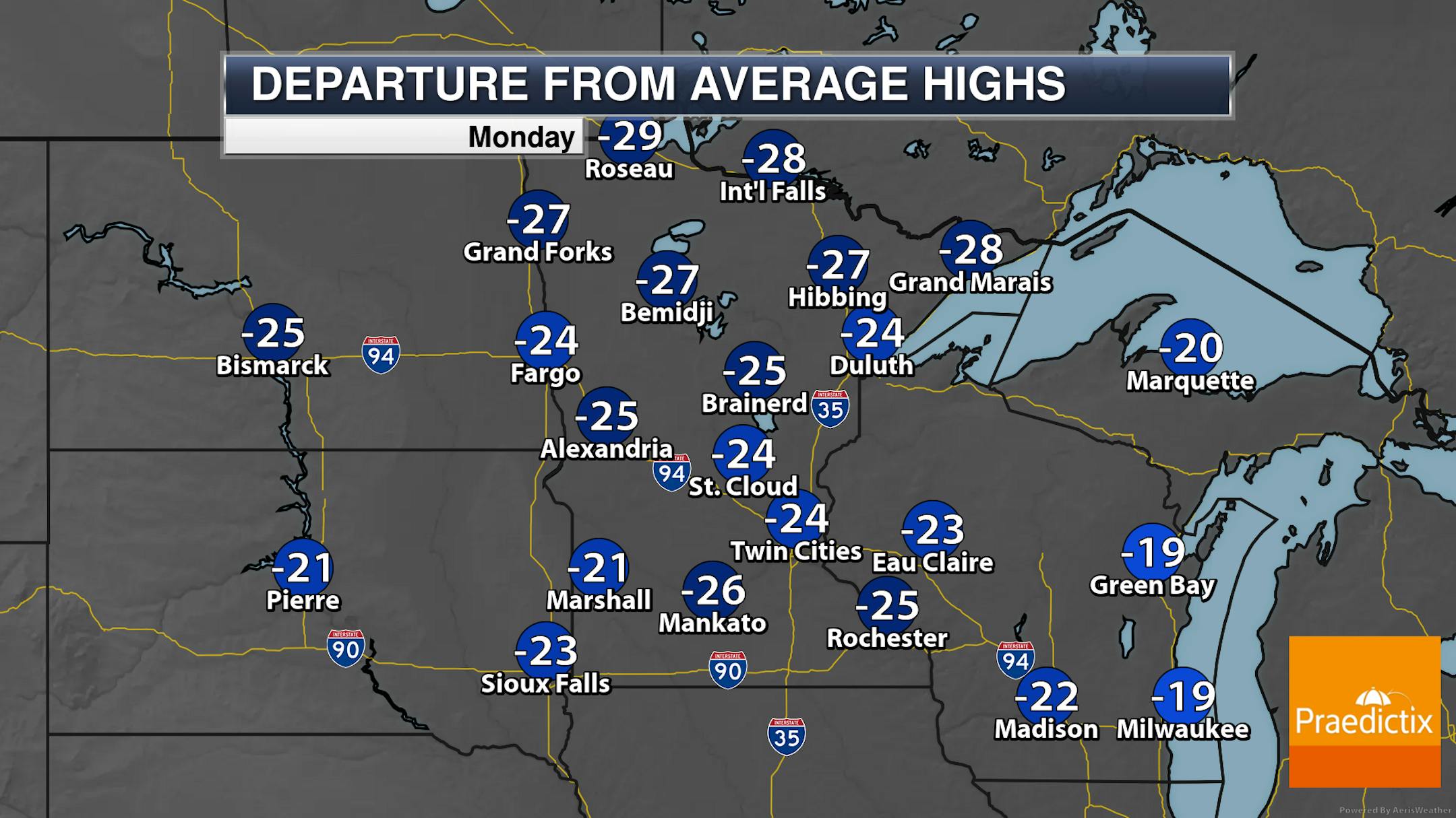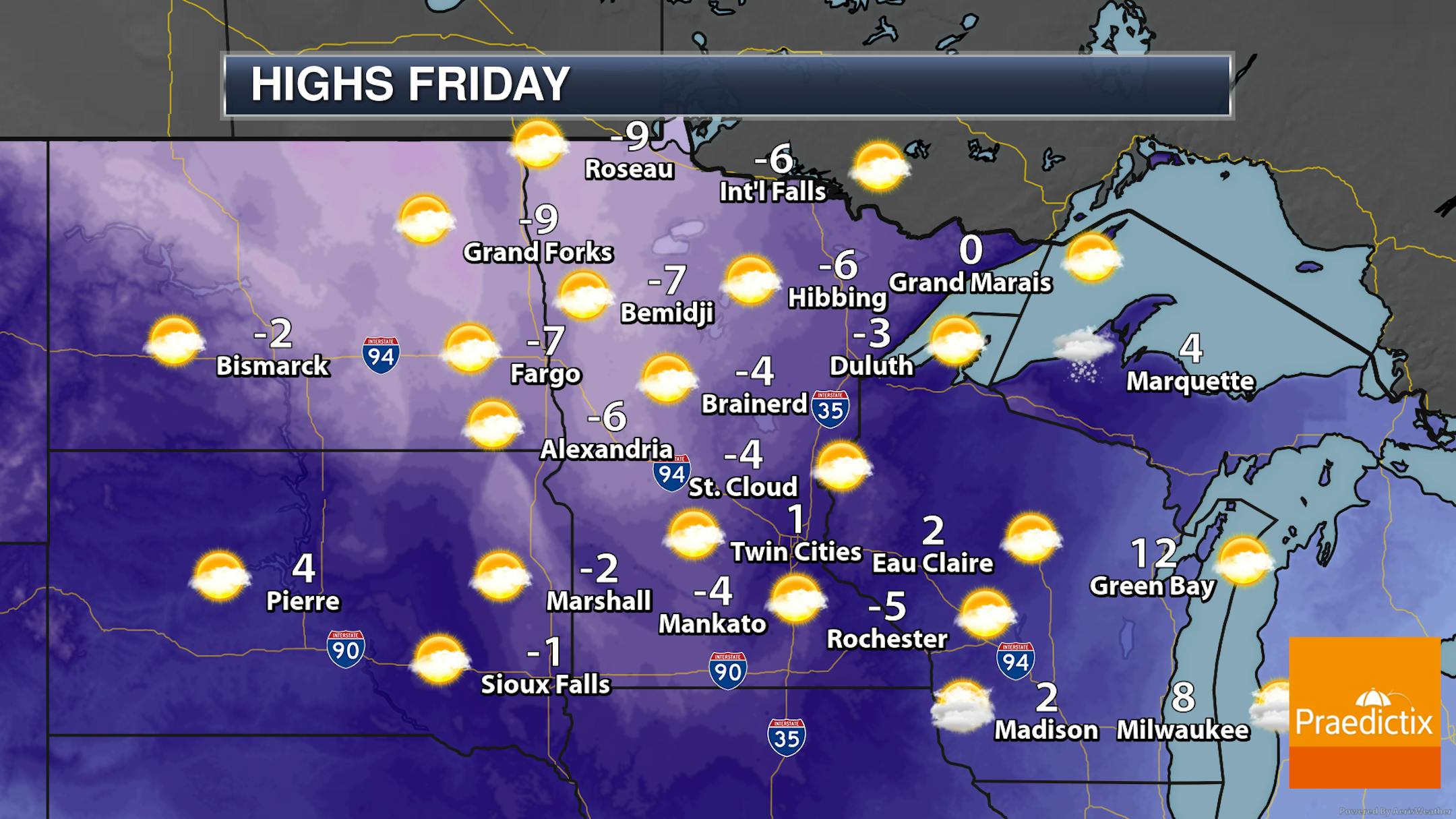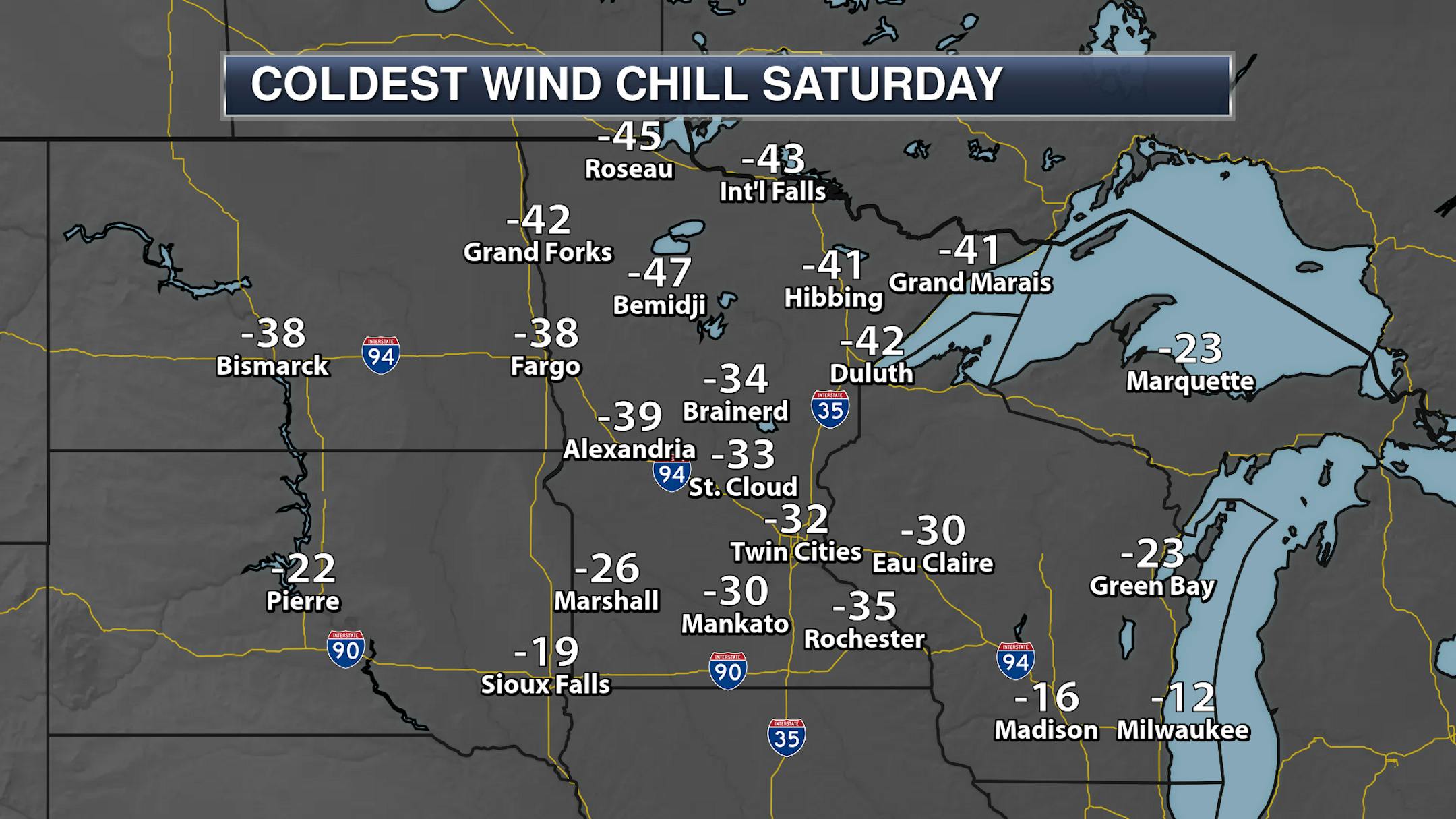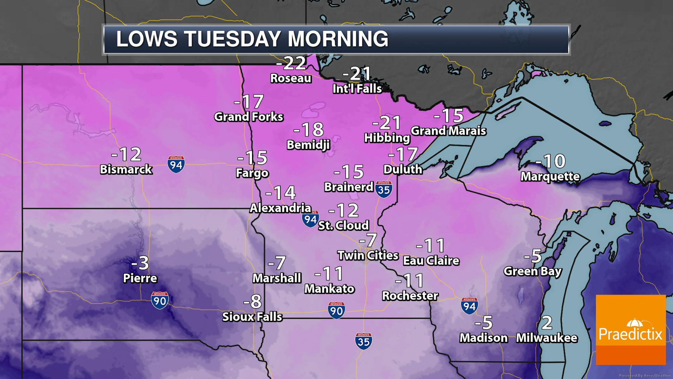 Make sure you bundle up the kids as they head out to the bus stop in the morning as lows dip to around -10F in the Twin Cities and into the -30s up in northern Minnesota.
