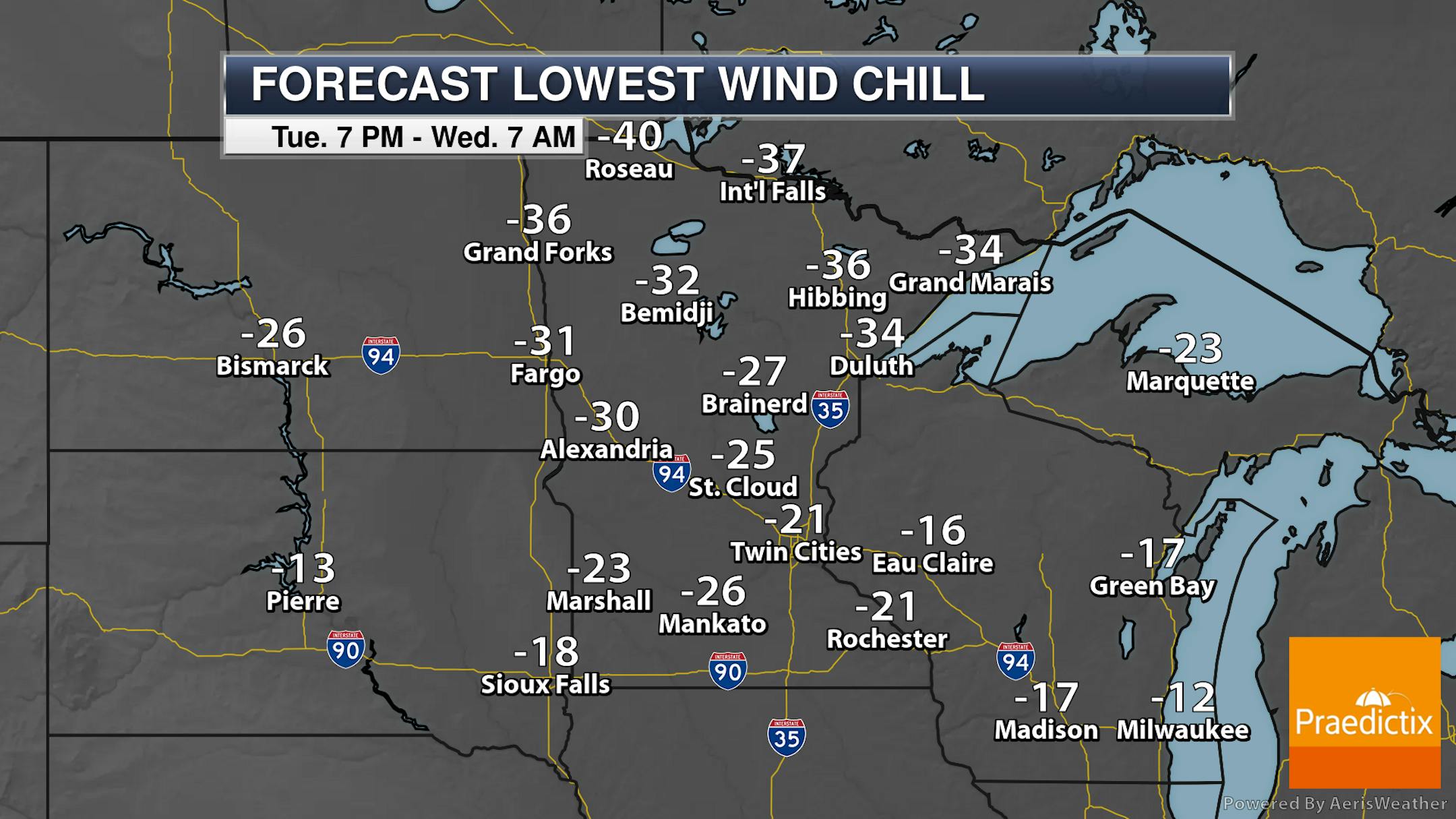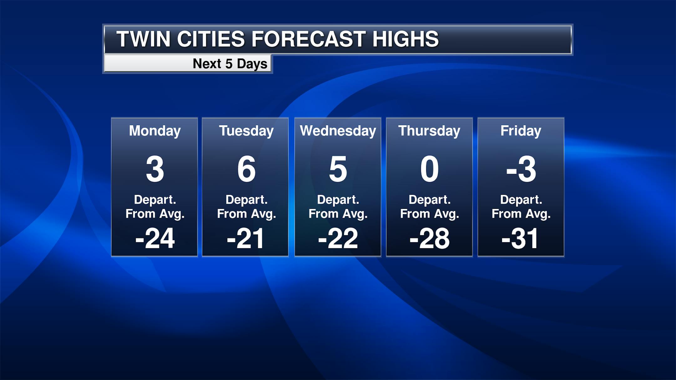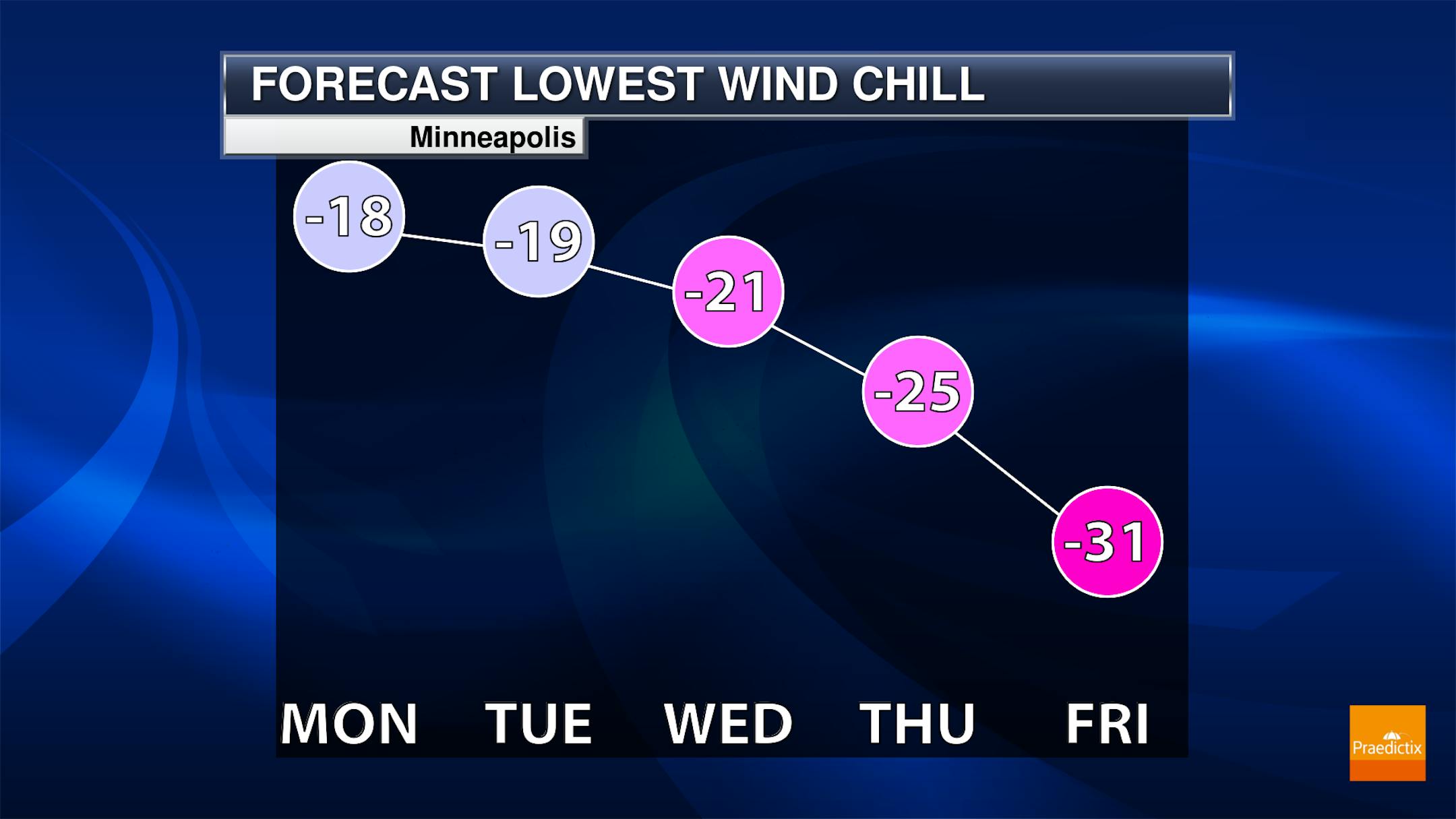 Through the workweek, wind chills will continue to be an issue across the state, particularly in the morning hours. The coldest for the Twin Cities will be late in the week when another batch of cold air moves down from Canada with increased winds. But for areas as close as St. Cloud, morning wind chills will be at least -25F for the foreseeable future.