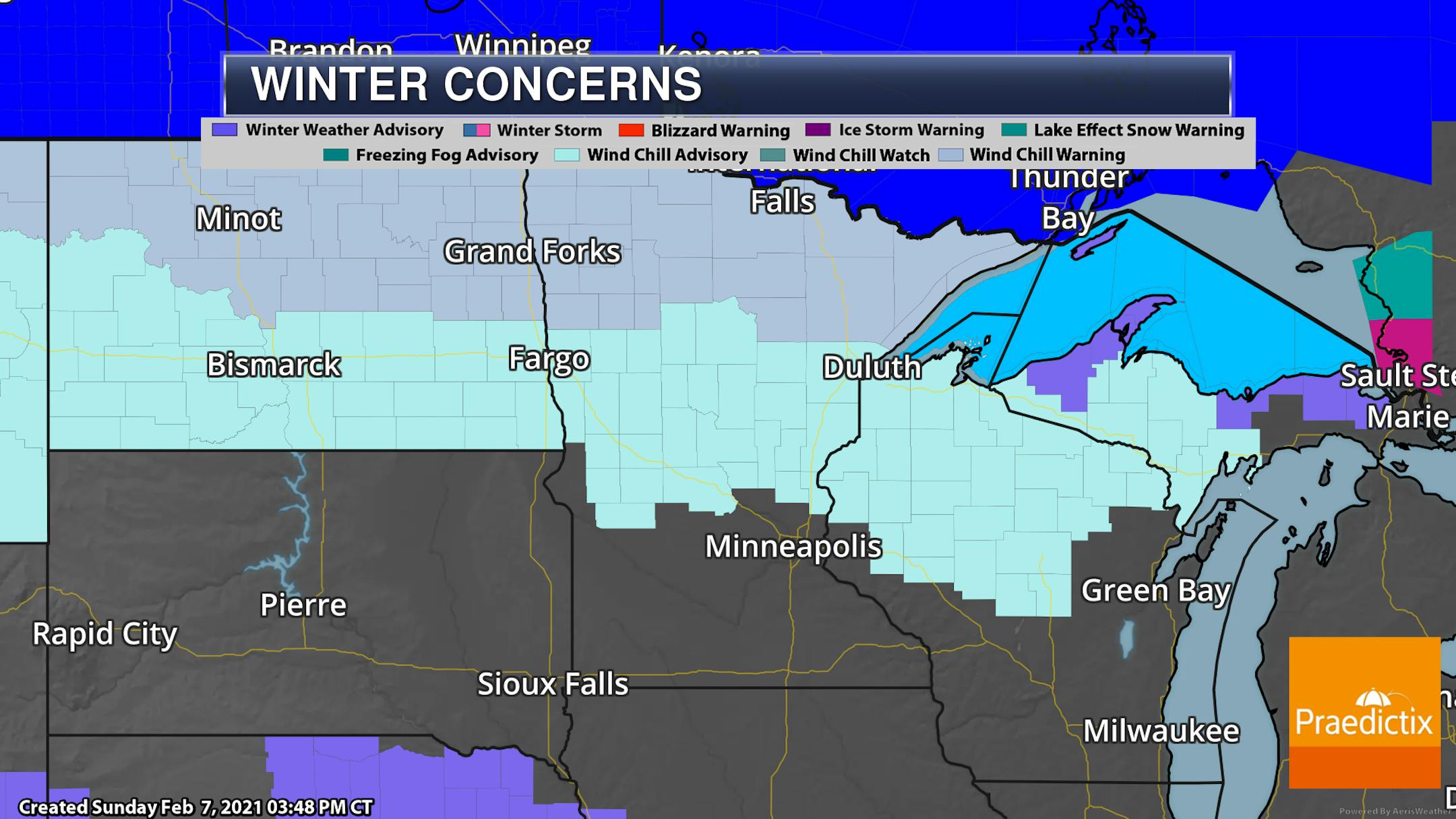 Wind Chill Advisories continue Sunday Night and, in some areas, Monday Night across central Minnesota, with Wind Chill Warnings in place in northern Minnesota through Monday Night