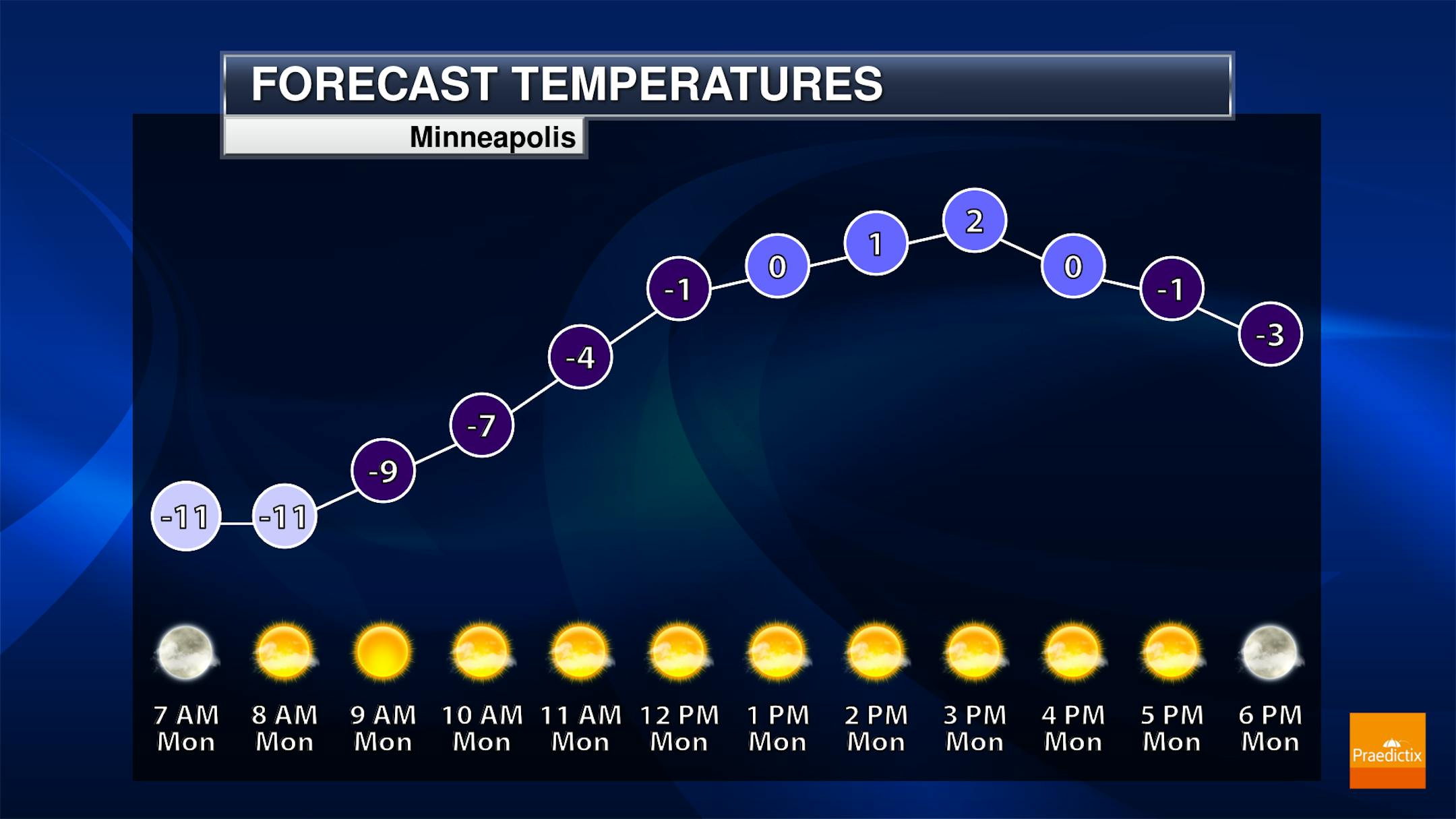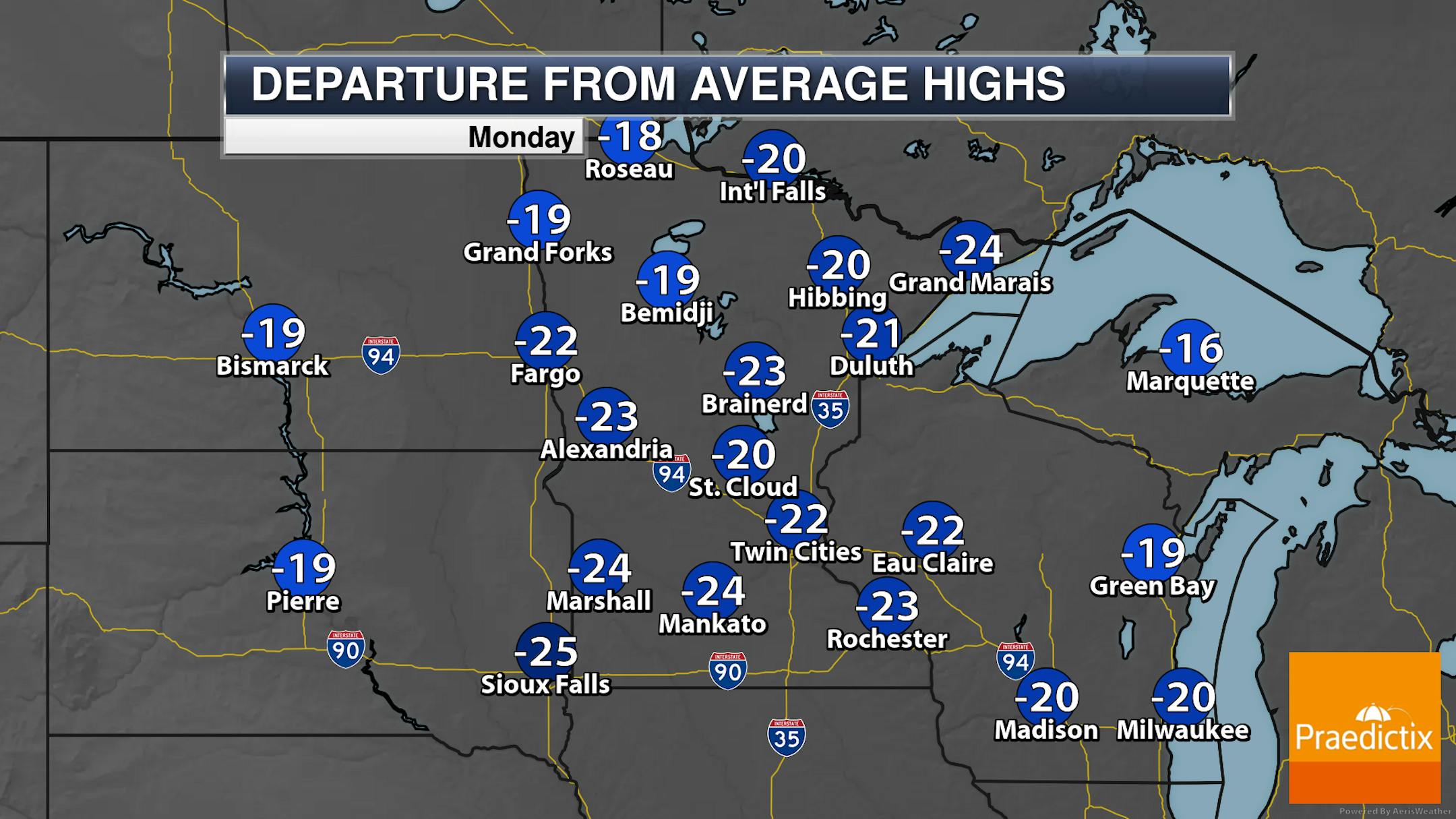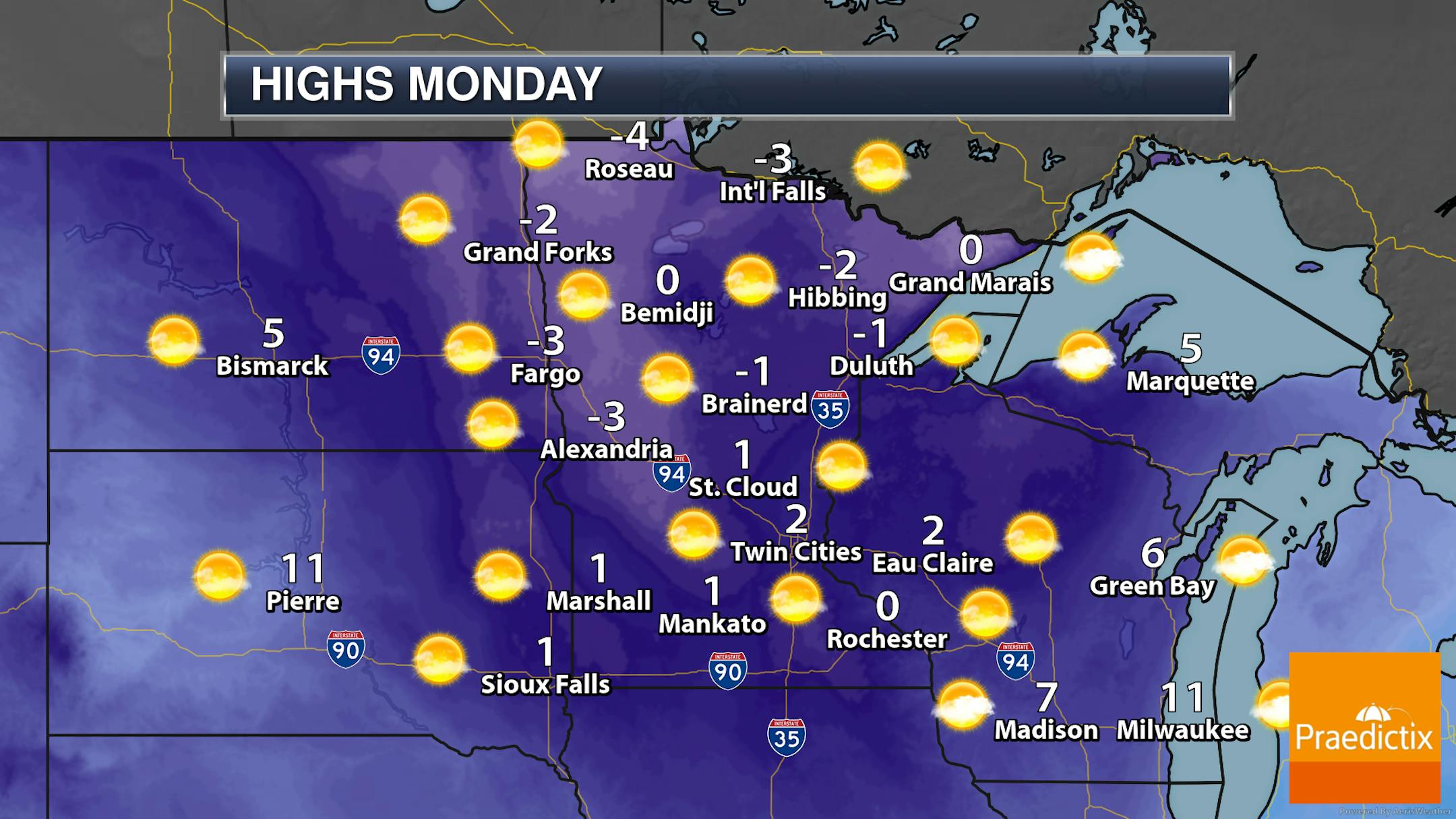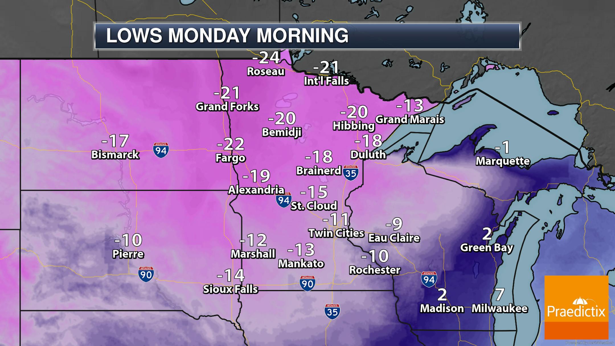 Monday will be one of those misleading days as you look outside - yes, it'll be sunny, but it'll be bitterly cold! After dipping into the teens below zero overnight in the metro, highs will struggle to make it back above zero. Once you factor in westerly 5-10 mph winds, it'll feel more like the teens and 20s below zero.