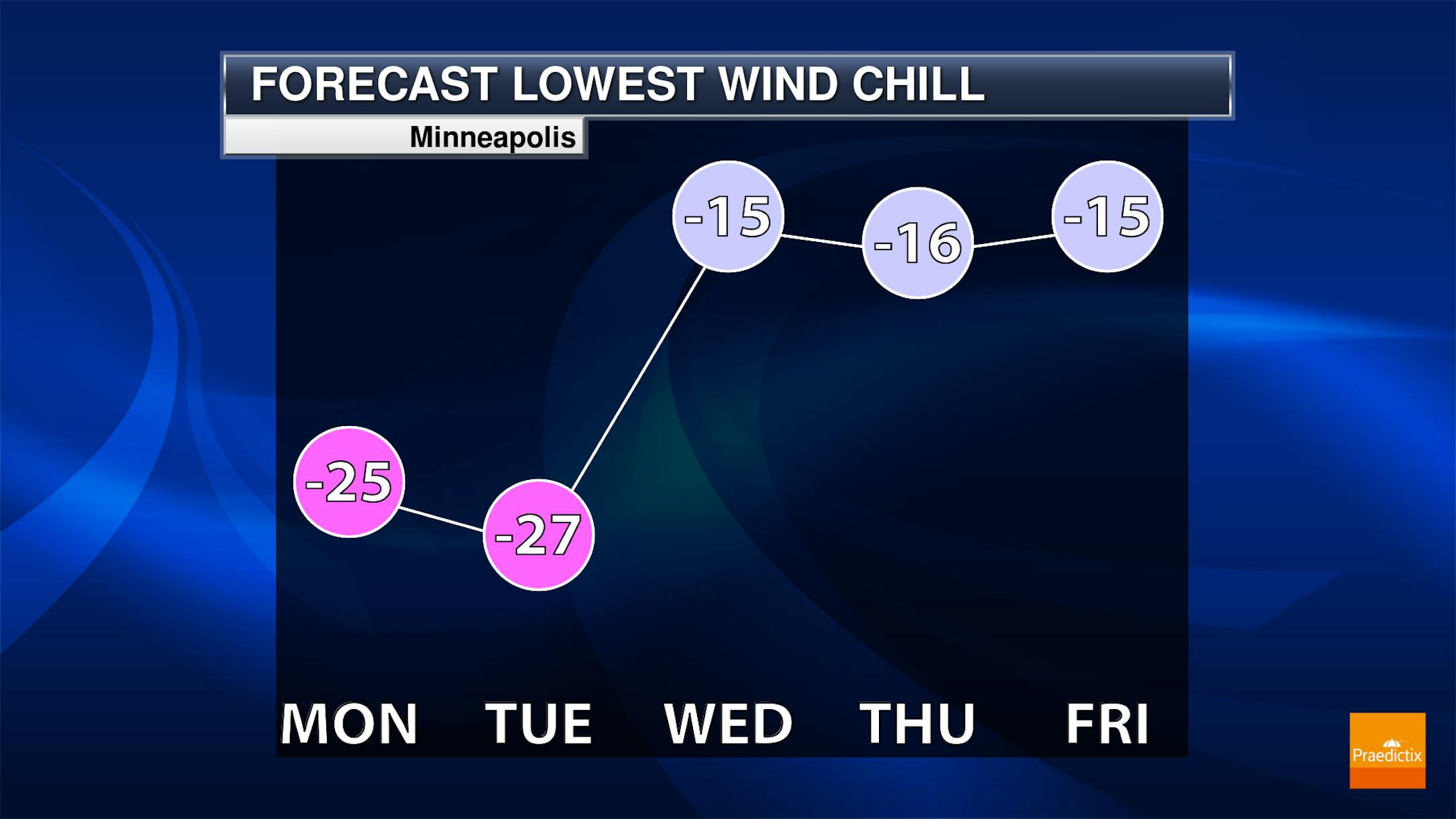 Both Monday and Tuesday morning should see wind chills down in the -20s here in the metro - those two mornings will also be the coldest of the week. As temperatures moderate some toward the middle of the week, and lows aren't as cold, morning wind chills won't be as cold either.