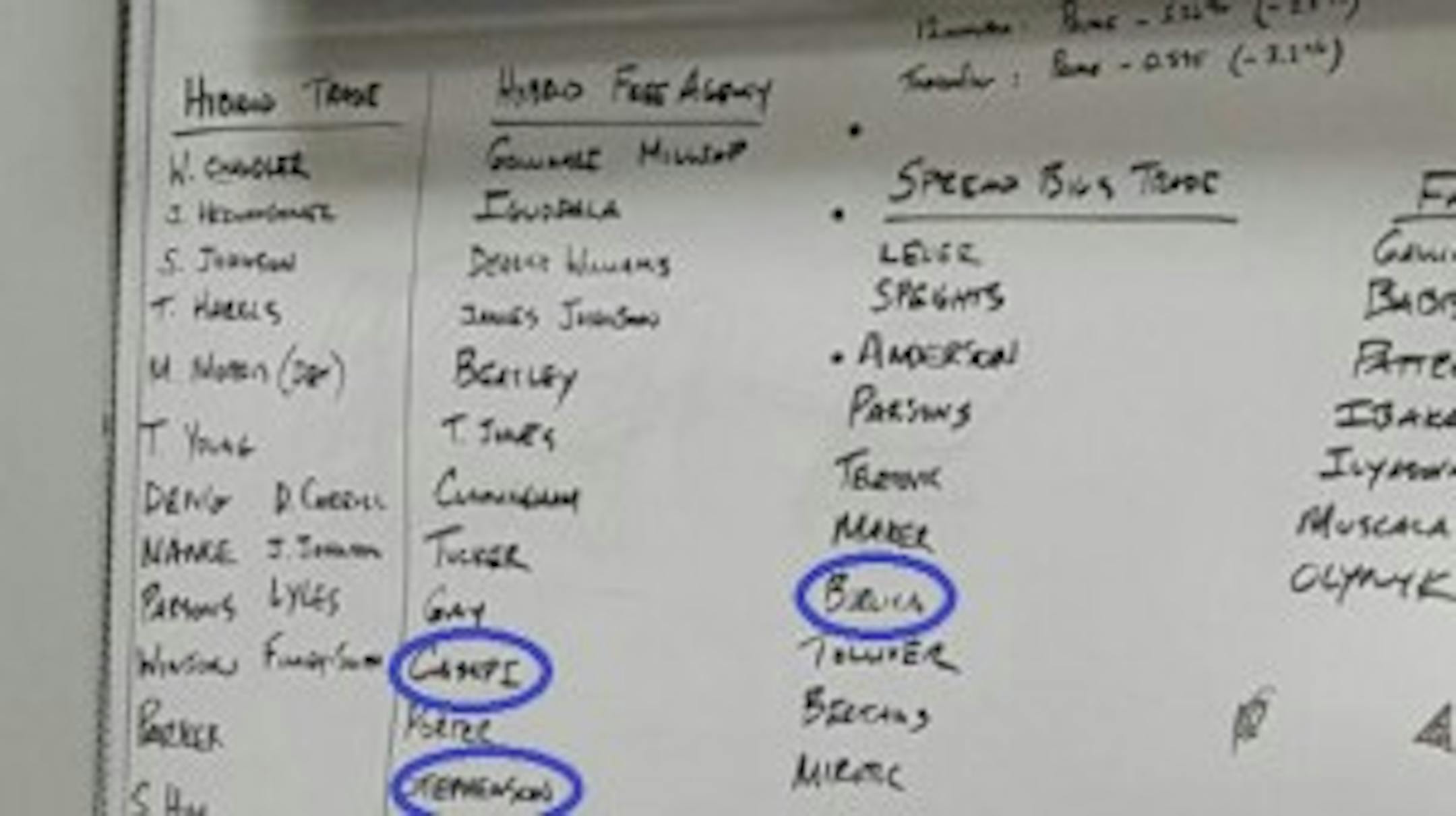 A picture of his client signing a contract with the Magic for the remainder of the season and next season. There's just one problem: In the background, there was a dry-erase board that lists possible Magic trade possibilities and free-agent targets. Asked by the Orlando Sentinel for comment, Magic general manager Rob Hennigan said the lists are "not indicative of plans" and were "simply listing options, including some of which other teams have inquired about."