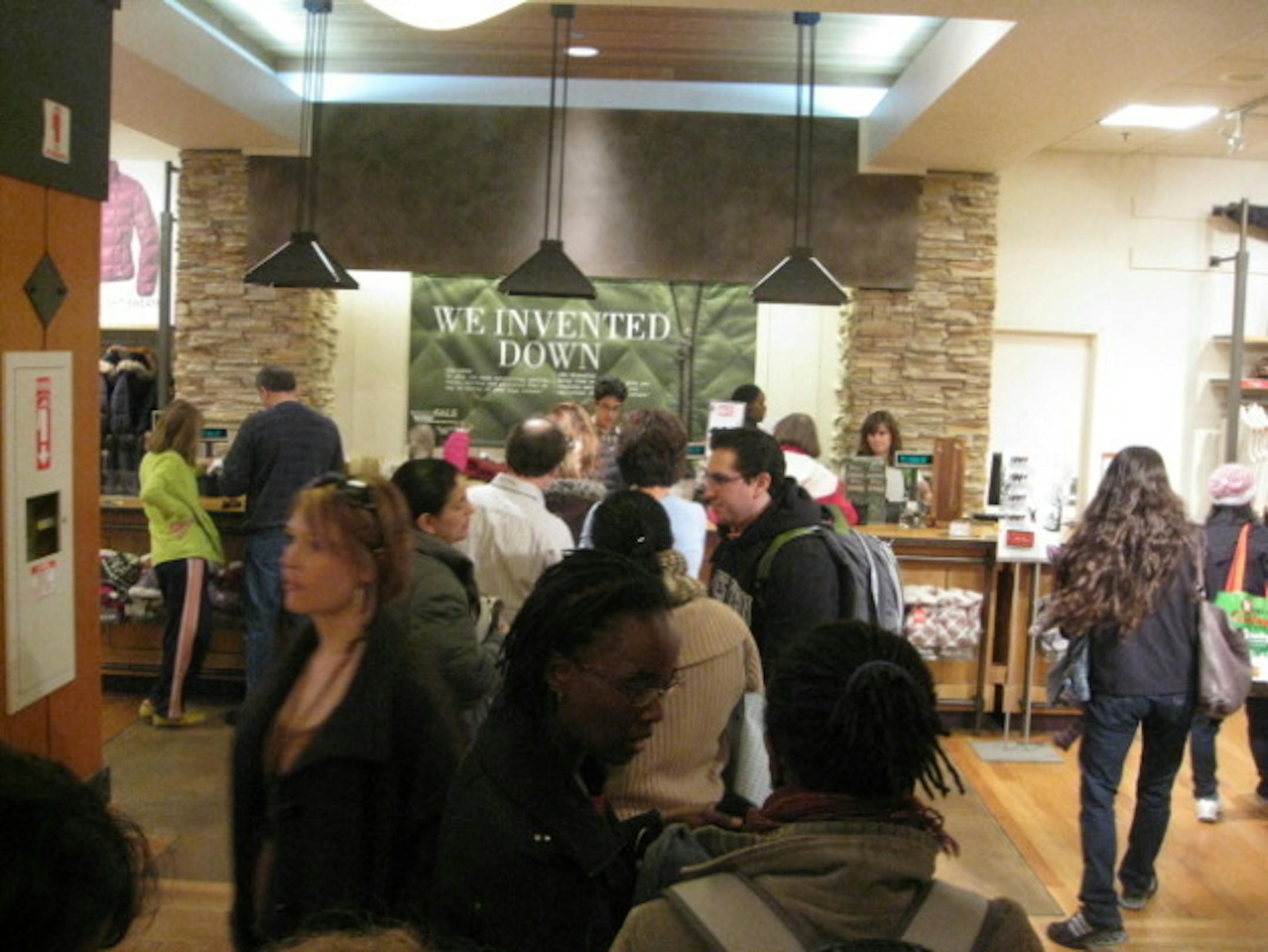 The deals included 40 percent off at places such as Eddie Bauer and Banana Republic. Garman GPS devices were going for $209 instead of the usual $350, which doesn't seem like such as great deal. Lines of at check-out stations were long, at Eddie Bauer (lower right). And just like every years dozens of organized protesters descended on the furriers, shouting things such as: