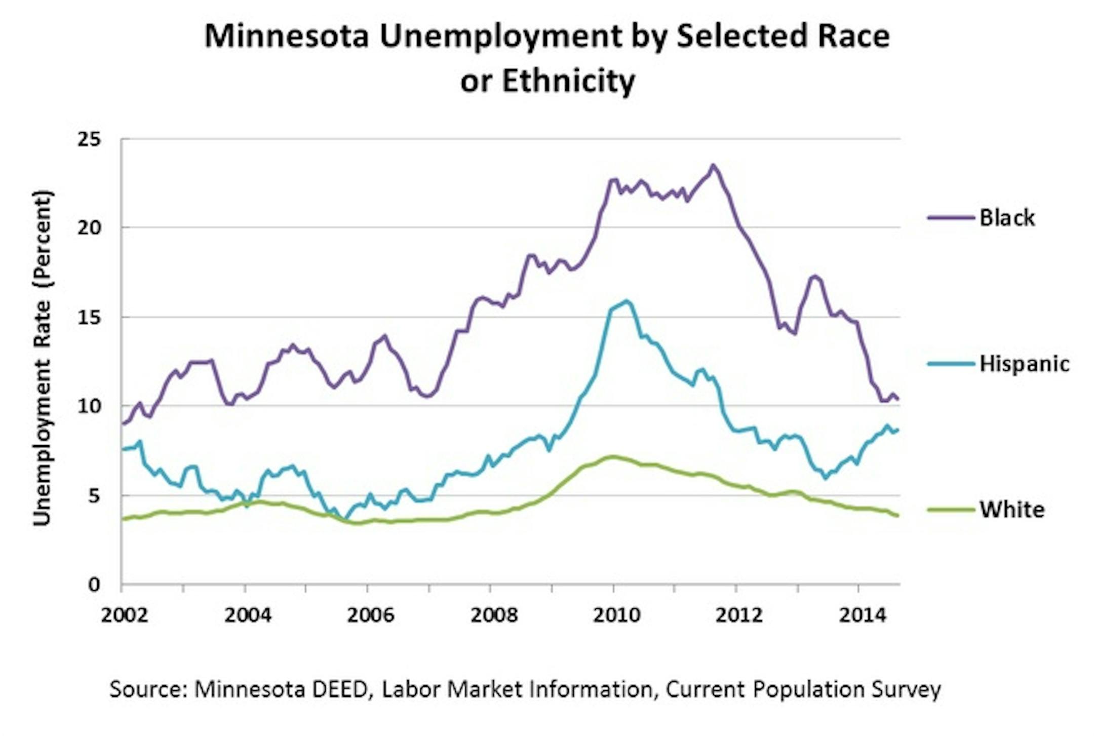 Black unemployment is still way higher than white unemployment, but it has fallen by more than half in Minnesota in the last three years.