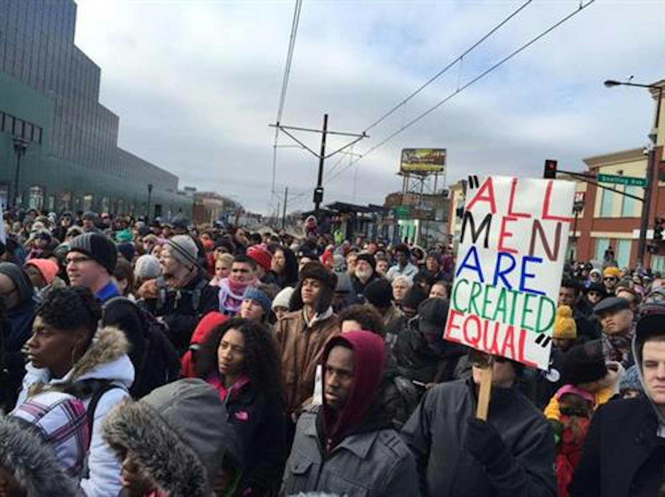 Metro Transit says Green Line service has been disrupted by the Black Lives Matter march. A crowd of thousands has blocked the intersection of University and Snelling Avenues in St. Paul.